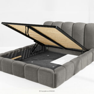 Pod tą warstwą przytulności i miękkości kryje się solidna inżynieria i funkcjonalność, która odpowiada na potrzeby nowoczesnych mieszkań, gdzie każdy centymetr przestrzeni jest na wagę złota. Konstrukcja łóżka opiera się na wytrzymałym stelażu metalowym, który stanowi gwarancję stabilności i braku irytującego skrzypienia, a wyposażenie go w wysokiej jakości listwy drewniane sprężynujące zapewnia optymalną pracę materaca, poprawiając jego wentylację i precyzyjnie reagując na nacisk ciała śpiącej osoby. Co więcej, pod całą powierzchnią spania ukryto niezwykle pojemną skrzynię na pościel, która z powodzeniem zastąpi dodatkową szafę czy komodę, mieszcząc kołdry, poduszki, koce czy sezonową odzież; aby korzystanie z tego schowka było czystą przyjemnością, zastosowaliśmy zaawansowany automat z siłownikami gazowymi. Dzięki niemu uniesienie ciężkiego materaca wraz ze stelażem nie wymaga użycia siły – mechanizm działa płynnie i cicho, utrzymując stelaż w górze podczas pakowania rzeczy, co sprawia, że codzienne ścielenie łóżka czy chowanie pościeli jest procesem szybkim, lekkim i intuicyjnym, wpisującym się w filozofię funkcjonalnego minimalizmu.
