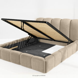 Pod tą warstwą przytulności i miękkości kryje się solidna inżynieria i funkcjonalność, która odpowiada na potrzeby nowoczesnych mieszkań, gdzie każdy centymetr przestrzeni jest na wagę złota. Konstrukcja łóżka opiera się na wytrzymałym stelażu metalowym, który stanowi gwarancję stabilności i braku irytującego skrzypienia, a wyposażenie go w wysokiej jakości listwy drewniane sprężynujące zapewnia optymalną pracę materaca, poprawiając jego wentylację i precyzyjnie reagując na nacisk ciała śpiącej osoby. Co więcej, pod całą powierzchnią spania ukryto niezwykle pojemną skrzynię na pościel, która z powodzeniem zastąpi dodatkową szafę czy komodę, mieszcząc kołdry, poduszki, koce czy sezonową odzież; aby korzystanie z tego schowka było czystą przyjemnością, zastosowaliśmy zaawansowany automat z siłownikami gazowymi. Dzięki niemu uniesienie ciężkiego materaca wraz ze stelażem nie wymaga użycia siły – mechanizm działa płynnie i cicho, utrzymując stelaż w górze podczas pakowania rzeczy, co sprawia, że codzienne ścielenie łóżka czy chowanie pościeli jest procesem szybkim, lekkim i intuicyjnym, wpisującym się w filozofię funkcjonalnego minimalizmu.