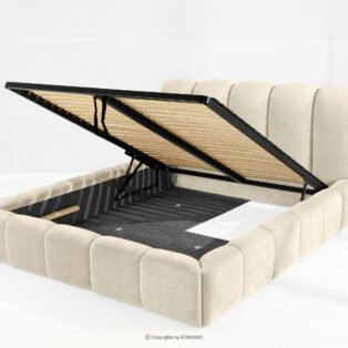Pod tą warstwą przytulności i miękkości kryje się solidna inżynieria i funkcjonalność, która odpowiada na potrzeby nowoczesnych mieszkań, gdzie każdy centymetr przestrzeni jest na wagę złota. Konstrukcja łóżka opiera się na wytrzymałym stelażu metalowym, który stanowi gwarancję stabilności i braku irytującego skrzypienia, a wyposażenie go w wysokiej jakości listwy drewniane sprężynujące zapewnia optymalną pracę materaca, poprawiając jego wentylację i precyzyjnie reagując na nacisk ciała śpiącej osoby. Co więcej, pod całą powierzchnią spania ukryto niezwykle pojemną skrzynię na pościel, która z powodzeniem zastąpi dodatkową szafę czy komodę, mieszcząc kołdry, poduszki, koce czy sezonową odzież; aby korzystanie z tego schowka było czystą przyjemnością, zastosowaliśmy zaawansowany automat z siłownikami gazowymi. Dzięki niemu uniesienie ciężkiego materaca wraz ze stelażem nie wymaga użycia siły – mechanizm działa płynnie i cicho, utrzymując stelaż w górze podczas pakowania rzeczy, co sprawia, że codzienne ścielenie łóżka czy chowanie pościeli jest procesem szybkim, lekkim i intuicyjnym, wpisującym się w filozofię funkcjonalnego minimalizmu.