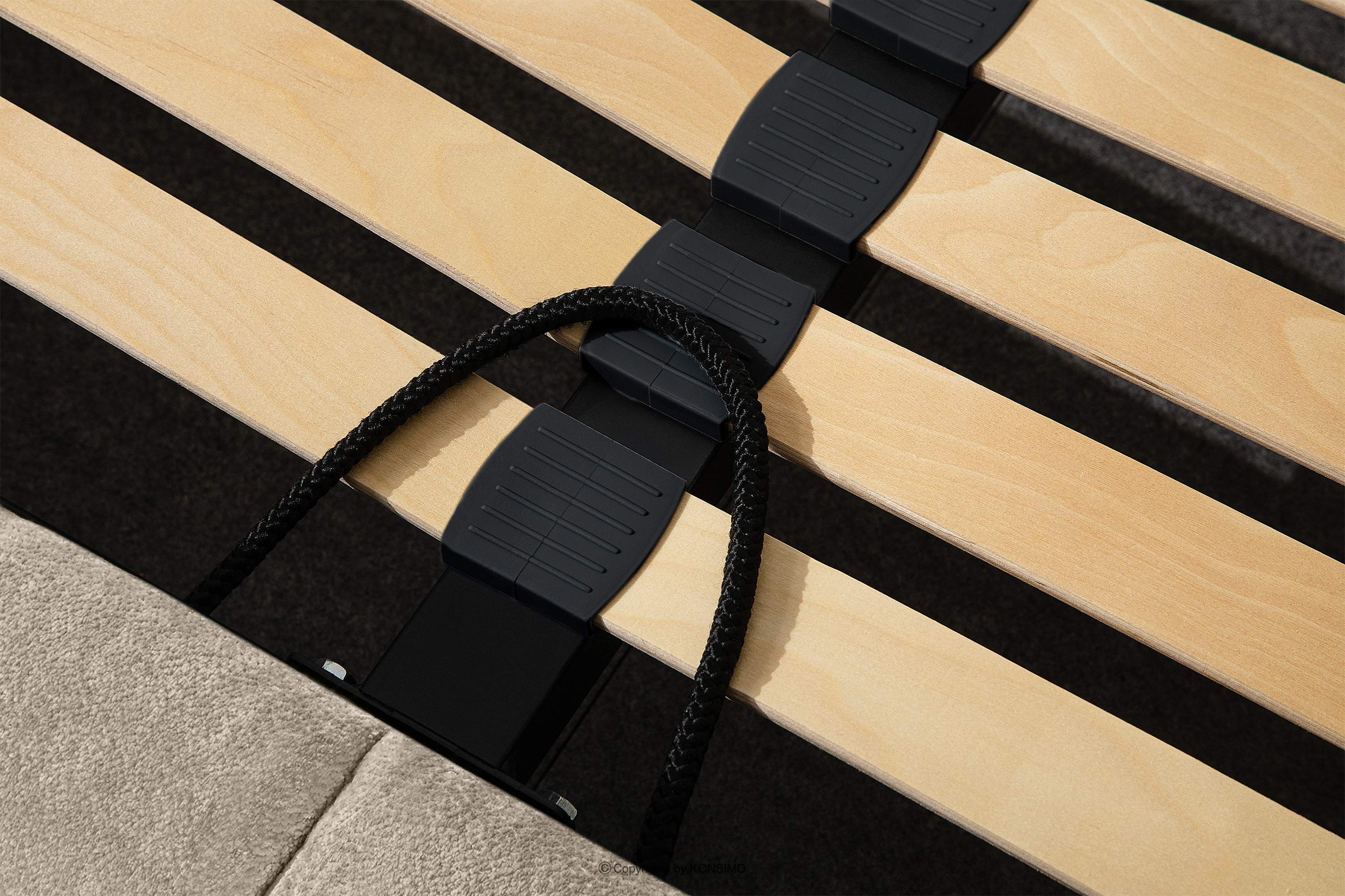 Pod tą warstwą przytulności i miękkości kryje się solidna inżynieria i funkcjonalność, która odpowiada na potrzeby nowoczesnych mieszkań, gdzie każdy centymetr przestrzeni jest na wagę złota. Konstrukcja łóżka opiera się na wytrzymałym stelażu metalowym, który stanowi gwarancję stabilności i braku irytującego skrzypienia, a wyposażenie go w wysokiej jakości listwy drewniane sprężynujące zapewnia optymalną pracę materaca, poprawiając jego wentylację i precyzyjnie reagując na nacisk ciała śpiącej osoby. Co więcej, pod całą powierzchnią spania ukryto niezwykle pojemną skrzynię na pościel, która z powodzeniem zastąpi dodatkową szafę czy komodę, mieszcząc kołdry, poduszki, koce czy sezonową odzież; aby korzystanie z tego schowka było czystą przyjemnością, zastosowaliśmy zaawansowany automat z siłownikami gazowymi. Dzięki niemu uniesienie ciężkiego materaca wraz ze stelażem nie wymaga użycia siły – mechanizm działa płynnie i cicho, utrzymując stelaż w górze podczas pakowania rzeczy, co sprawia, że codzienne ścielenie łóżka czy chowanie pościeli jest procesem szybkim, lekkim i intuicyjnym, wpisującym się w filozofię funkcjonalnego minimalizmu.