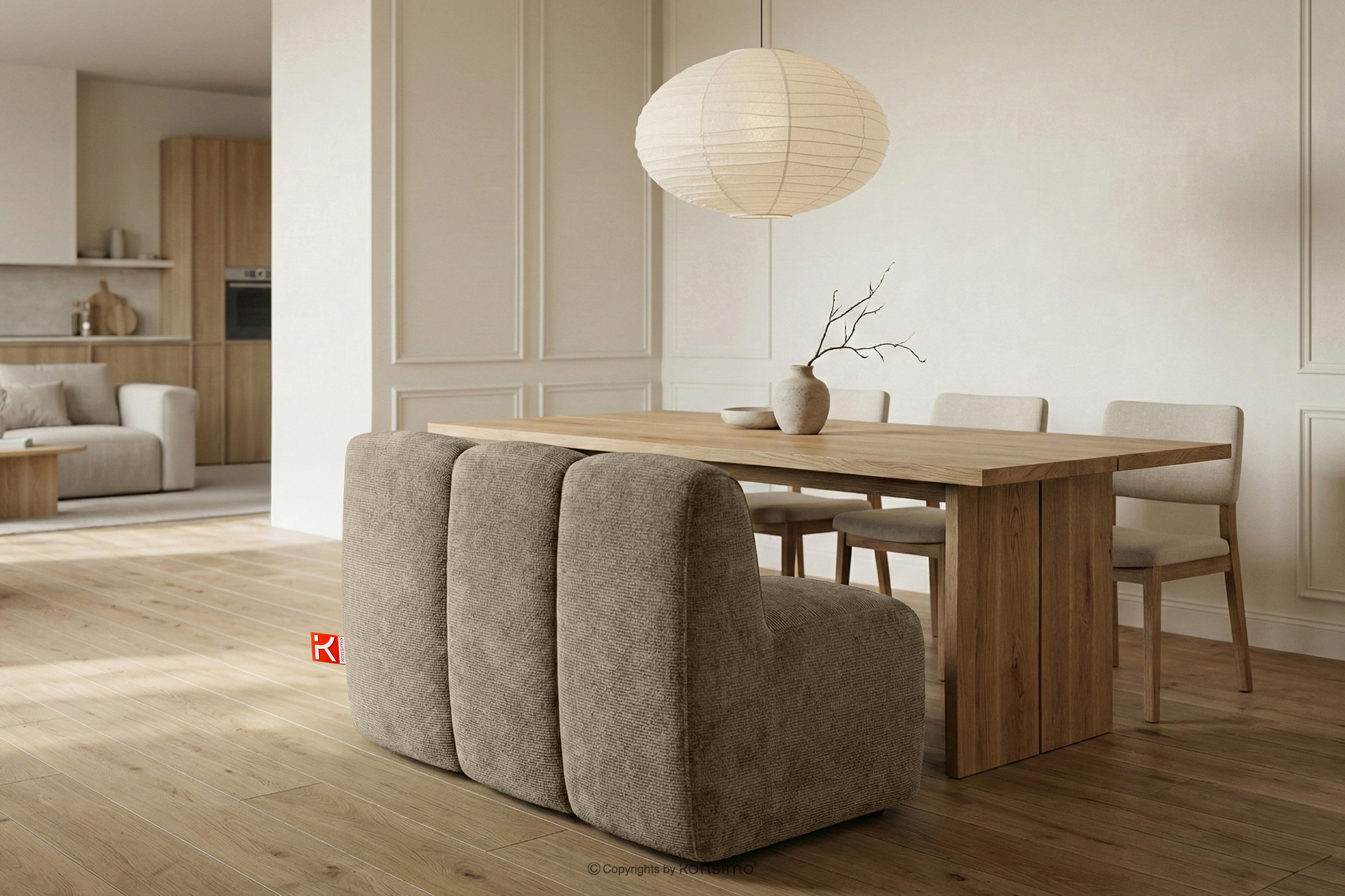 Ławka tapicerowana do jadalni 120 cm tkanina szenil beżowy to rozwiązanie dla tych, którzy szukają złotego środka między stylem a czystą praktycznością. Zamiast tradycyjnych krzeseł, które często wprowadzają wizualny chaos, oferujemy zwartą, modułową bryłę o miękkich krawędziach. Brak ostrych narożników to nie tylko kwestia estetyki, ale przede wszystkim bezpieczeństwa – szczególnie w wąskich przejściach, korytarzach czy domach, w których bawią się dzieci.