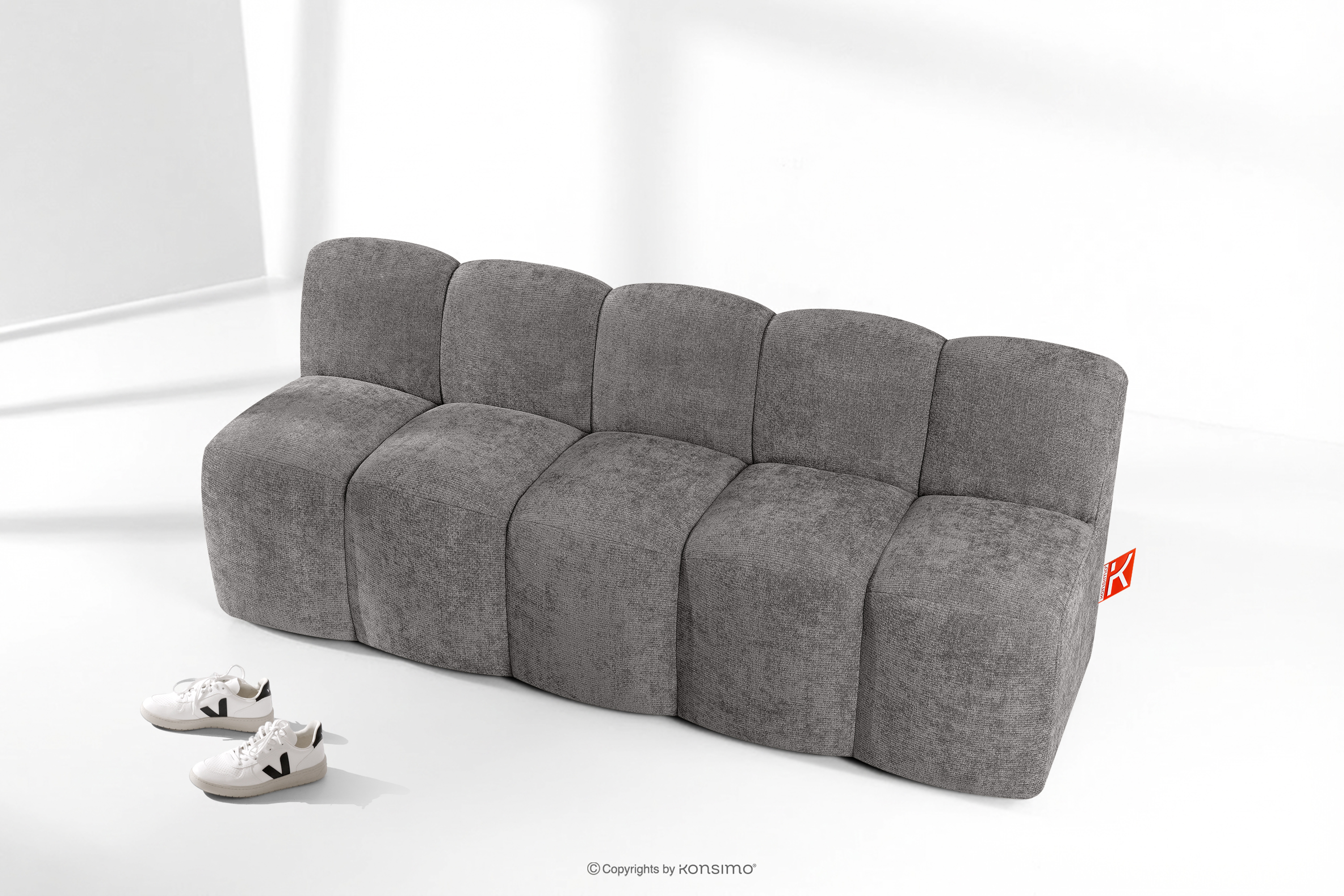 Konstrukcja ławki opiera się na niskim profilu, co sprawia, że mebel jest wyjątkowo stabilny i nie chwieje się nawet przy pełnym obciążeniu przez kilka osób naraz. Wyraźne segmentowanie siedziska i oparcia zapobiega nadmiernemu naciąganiu się materiału, dzięki czemu tapicerka zachowuje swój pierwotny, schludny wygląd przez długie lata, nawet przy intensywnym użytkowaniu.