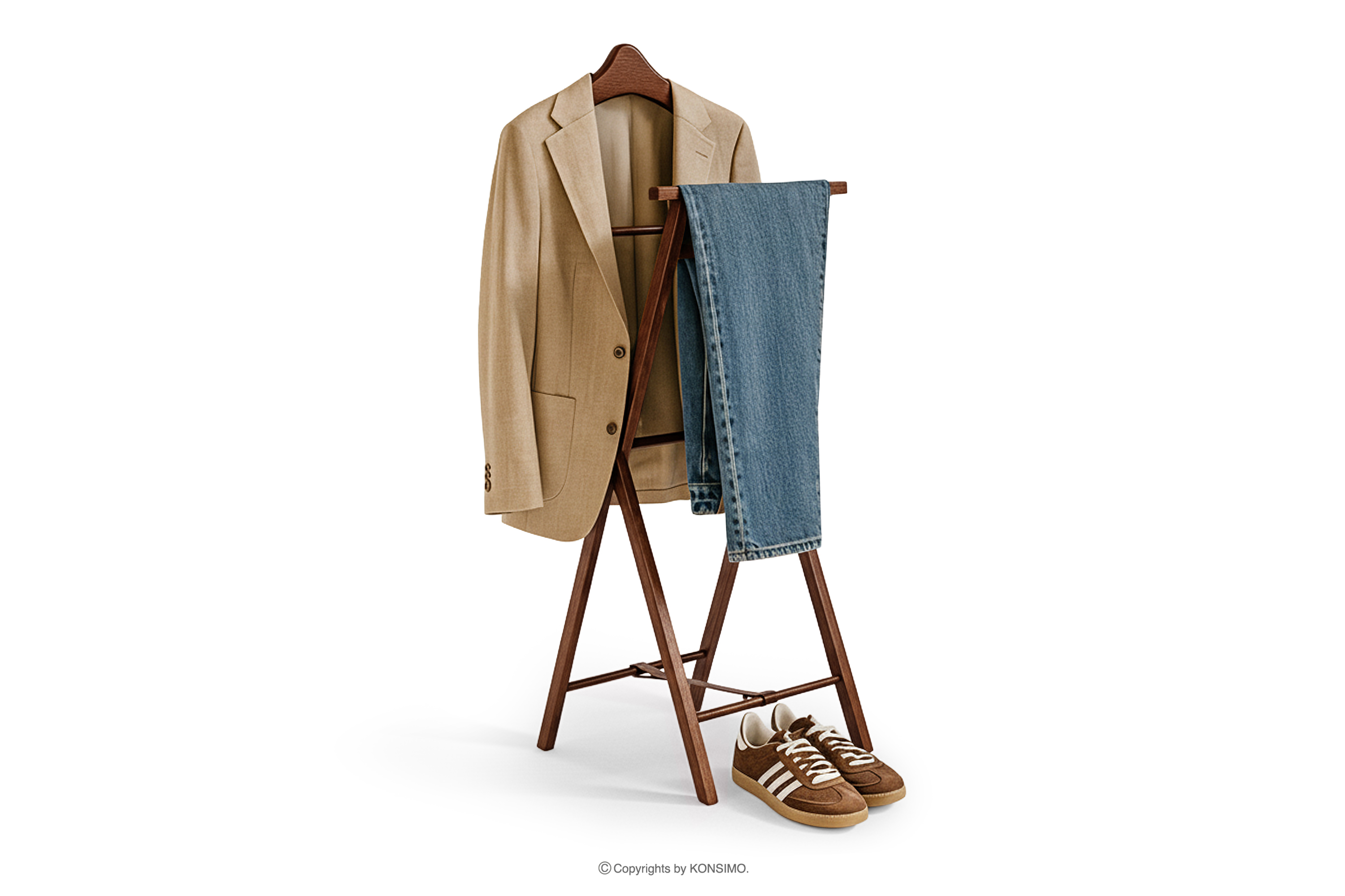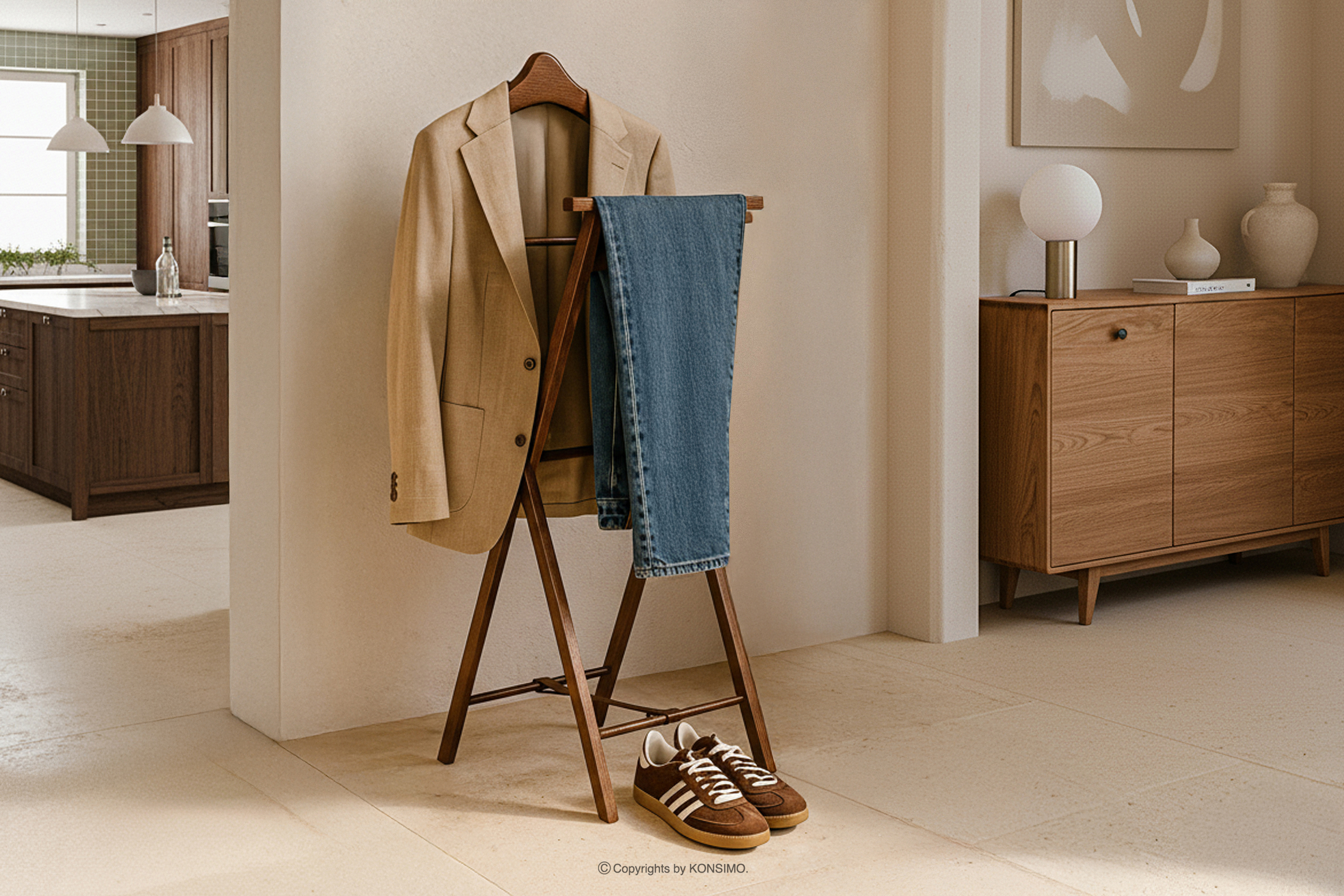 Kamerdyner to nie tylko funkcjonalny mebel, ale również elegancki dodatek do wnętrza. Jego ponadczasowy design sprawia, że doskonale prezentuje się w sypialni, gdzie może pełnić funkcję porannego pomocnika przy kompletowaniu stroju, lub w garderobie, stanowiąc wygodne miejsce do odłożenia ubrań przygotowanych na kolejny dzień. W holu lub przedpokoju posłuży jako miejsce na płaszcz czy marynarkę po powrocie do domu. Dzięki neutralnemu i klasycznemu wyglądowi kamerdyner harmonijnie wpisuje się w różne style aranżacyjne – od klasycznych po skandynawskie, minimalistyczne i modernistyczne wnętrza.