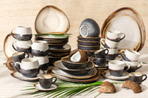 Nie jest to płaska, jednolita barwa, lecz baza pełna subtelnych niuansów, która wnosi do wnętrza ciepło, spokój i harmonię. Ten szlachetny odcień doskonale komponuje się z surowością betonu, ciepłem drewna i chłodem metalu – filarami loftowej estetyki. Kolekcja PRIMA to propozycja funkcjonalnej zastawy stołowej wykonanej z wysokiej jakości ceramiki. Jej design wpisuje się w założenia stylu Loft, który ceni autentyczność materiałów i prostotę formy. Estetyka kolekcji nawiązuje do inspiracji naturą, w szczególności do świata minerałów i kamieni szlachetnych. Przejawia się to w organicznych, celowo nieregularnych kształtach naczyń, które odbiegają od standardowej, maszynowej symetrii. Formy te mają naśladować naturalne struktury, co nadaje kolekcji indywidualny charakter.