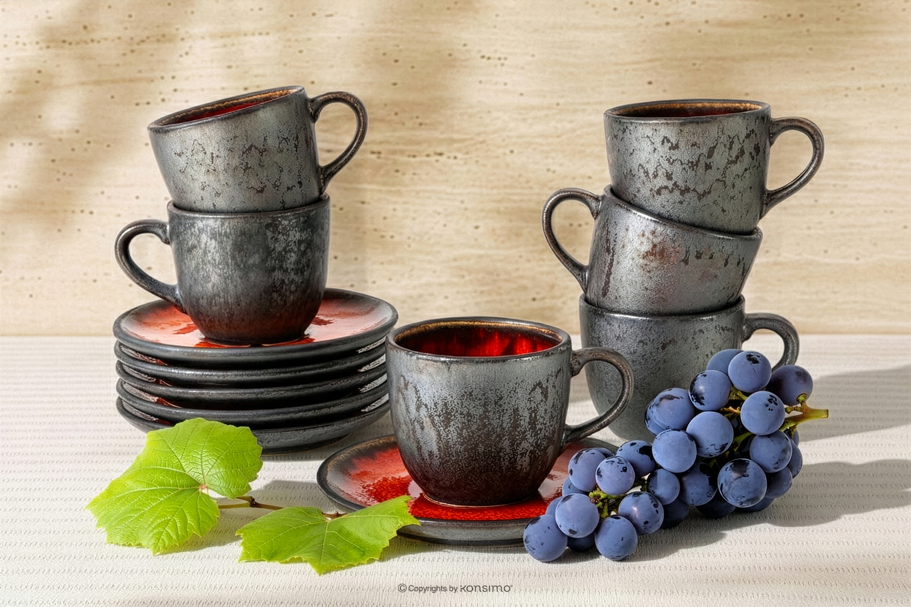 PRIMA Filiżanka do kawy ze spodkiem z ceramiki ręcznie szkliwiony 6 szt. czerwony