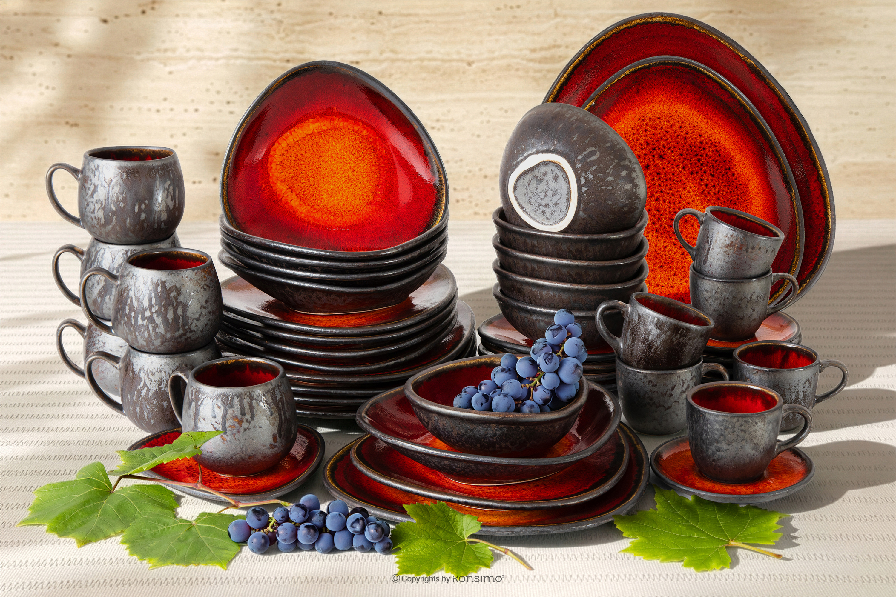 PRIMA zobacz całą kolekcję Zestaw obiadowo-śniadaniowo-kawowy z ceramiki ręcznie szkliwiony 6 os. (48 el.) czerwony- kolor czerwony