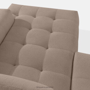 Narożnik z pikowaniem w tkaninie szenilowej prawy jasny brązowy to kwintesencja nowoczesnego designu połączona z bezkompromisową funkcjonalnością, która redefiniuje pojęcie luksusu w domowym salonie. Fundamentem tej linii mebli jest ich unikalna estetyka. ALIGRA posiada głębokie, rzemieślnicze pikowania nadające bryle trójwymiarowości i szlachetnego charakteru. Dużą zaletą jest także niezrównany komfort użytkowania osiągnięty dzięki precyzyjnemu projektowaniu warstw wewnętrznych siedziska.
