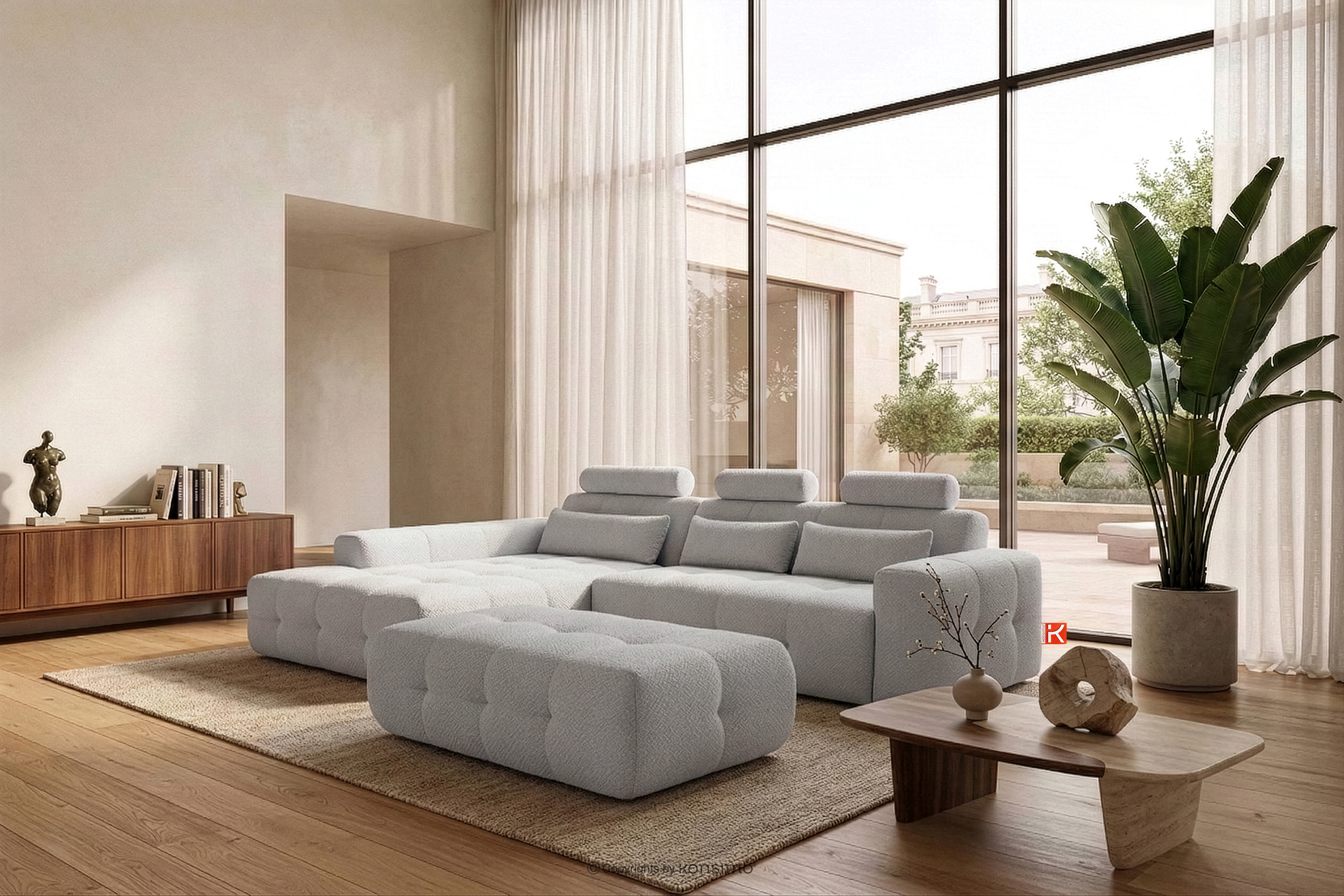 Zestaw mebli do salonu narożnik lewy i puf w kaninie szenil z pikowaniem jasny szary to kwintesencja nowoczesnego designu połączona z bezkompromisową funkcjonalnością, która redefiniuje pojęcie luksusu w domowym salonie. Fundamentem tej linii mebli jest ich unikalna estetyka. ALIGRA posiada głębokie, rzemieślnicze pikowania nadające bryle trójwymiarowości i szlachetnego charakteru. Dużą zaletą jest także niezrównany komfort użytkowania osiągnięty dzięki precyzyjnemu projektowaniu warstw wewnętrznych siedziska.