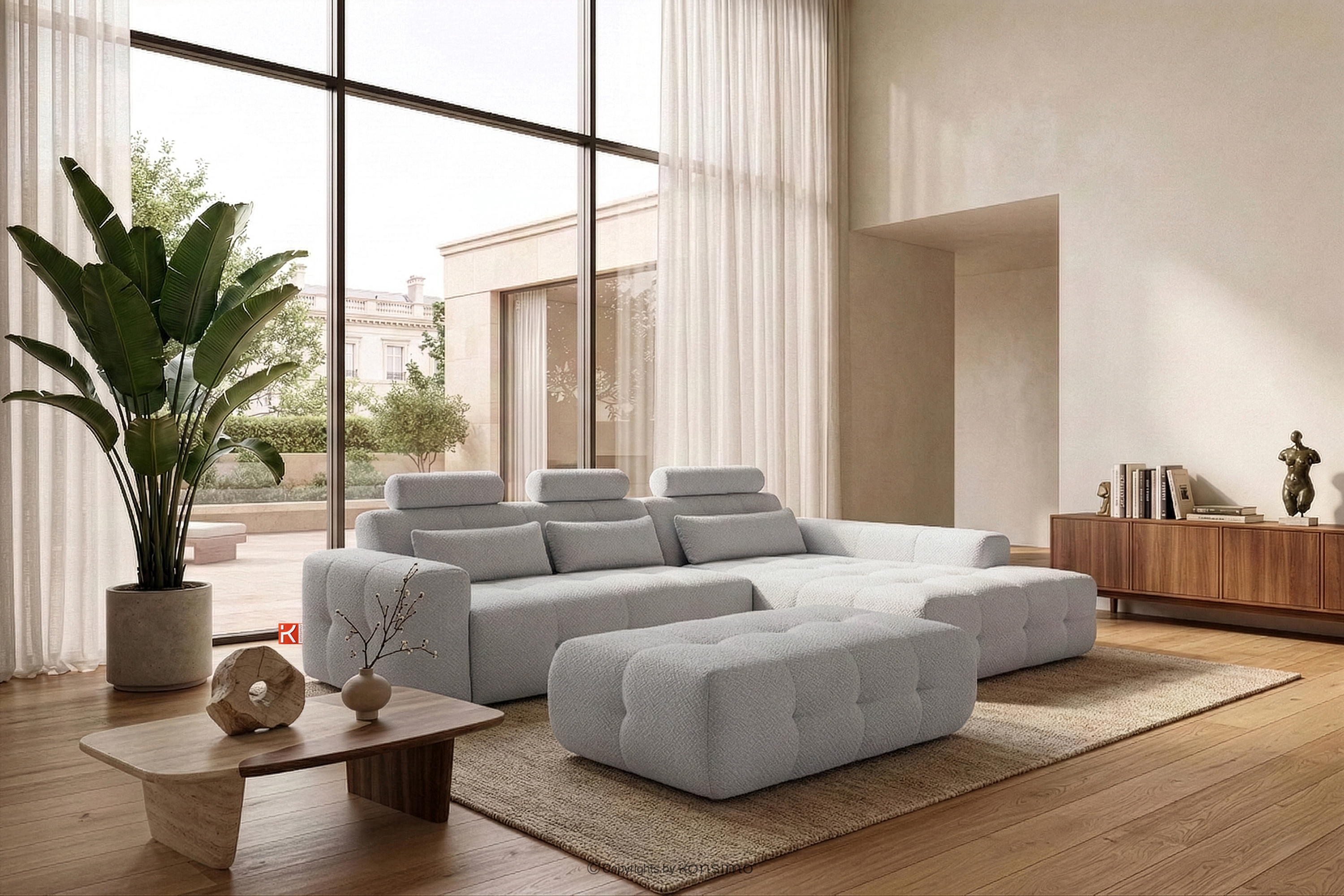 Zestaw mebli do salonu narożnik prawy i puf w kaninie szenil z pikowaniem jasny szary to kwintesencja nowoczesnego designu połączona z bezkompromisową funkcjonalnością, która redefiniuje pojęcie luksusu w domowym salonie. Fundamentem tej linii mebli jest ich unikalna estetyka. ALIGRA posiada głębokie, rzemieślnicze pikowania nadające bryle trójwymiarowości i szlachetnego charakteru. Dużą zaletą jest także niezrównany komfort użytkowania osiągnięty dzięki precyzyjnemu projektowaniu warstw wewnętrznych siedziska.