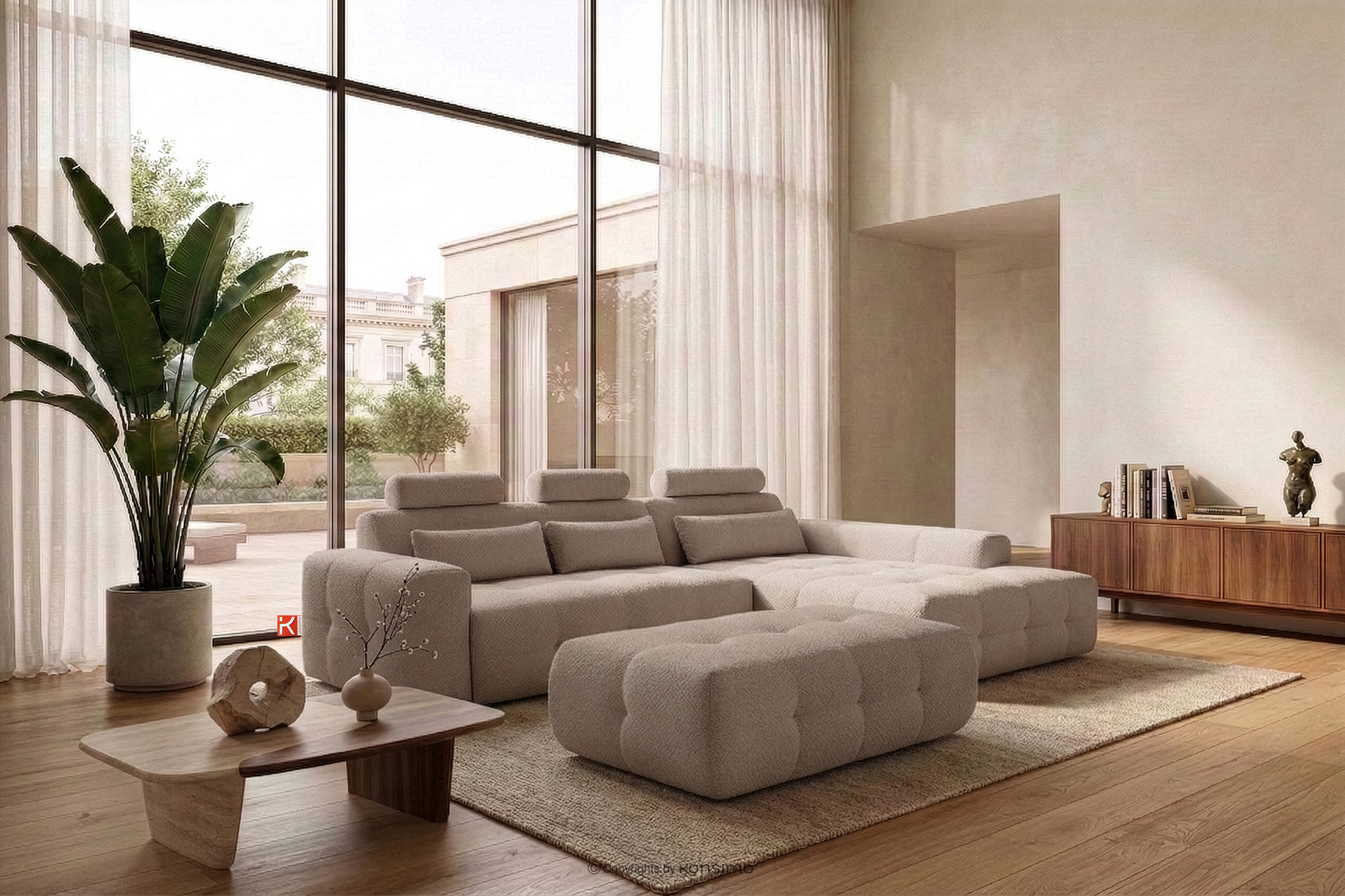 Zestaw mebli do salonu narożnik prawy i puf w kaninie szenil z pikowaniem jasny brązowy to kwintesencja nowoczesnego designu połączona z bezkompromisową funkcjonalnością, która redefiniuje pojęcie luksusu w domowym salonie. Fundamentem tej linii mebli jest ich unikalna estetyka. ALIGRA posiada głębokie, rzemieślnicze pikowania nadające bryle trójwymiarowości i szlachetnego charakteru. Dużą zaletą jest także niezrównany komfort użytkowania osiągnięty dzięki precyzyjnemu projektowaniu warstw wewnętrznych siedziska.