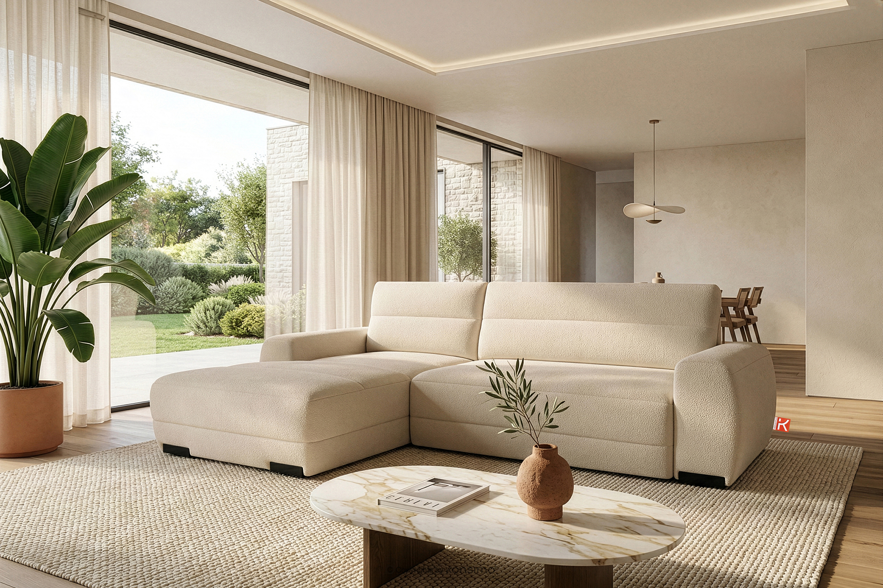 Nowoczesny narożnik w tkaninie szenilowej lewy kremowy doskonale wpisuje się w najnowsze trendy estetyki modernistycznej i skandynawskiej prostoty. Charakterystyczne, zaokrąglone linie podłokietników i łagodne kontury oparć nadają meblowi organiczny, a zarazem dynamiczny charakter, który przełamuje surowość geometrycznych podziałów. Głównym atutem wizualnym i dotykowym kolekcji jest zastosowanie ekskluzywnej tkaniny szenilowej. Ten wyjątkowy materiał, cechujący się gęstym splotem i subtelnym połyskiem, nie tylko zachwyca miękkością, ale również subtelnie odbija światło, podkreślając objętość i strukturę mebla.