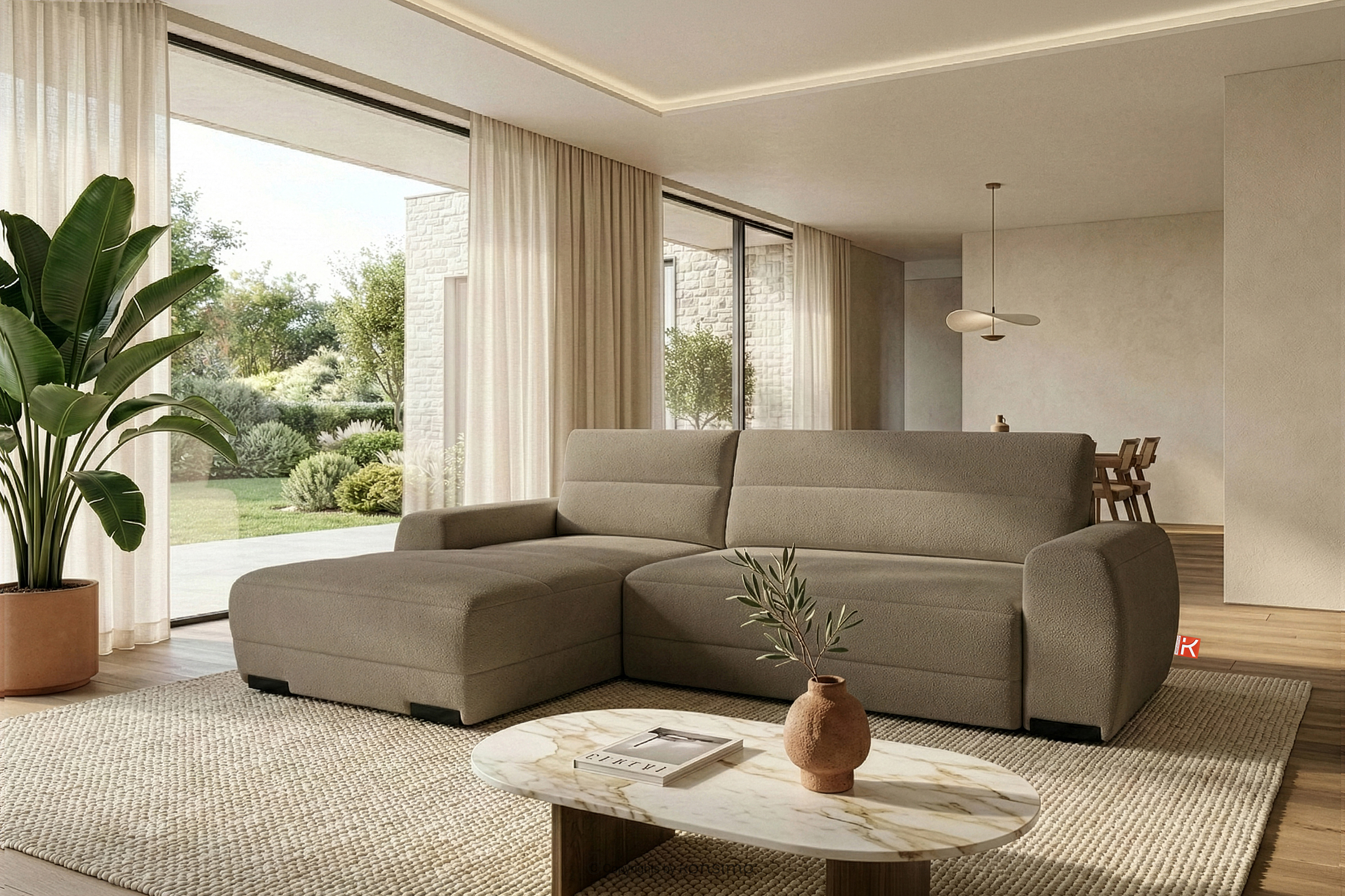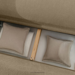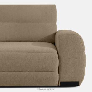 Nowoczesny narożnik w tkaninie szenilowej lewy ciemny beżowy doskonale wpisuje się w najnowsze trendy estetyki modernistycznej i skandynawskiej prostoty. Charakterystyczne, zaokrąglone linie podłokietników i łagodne kontury oparć nadają meblowi organiczny, a zarazem dynamiczny charakter, który przełamuje surowość geometrycznych podziałów. Głównym atutem wizualnym i dotykowym kolekcji jest zastosowanie ekskluzywnej tkaniny szenilowej. Ten wyjątkowy materiał, cechujący się gęstym splotem i subtelnym połyskiem, nie tylko zachwyca miękkością, ale również subtelnie odbija światło, podkreślając objętość i strukturę mebla.