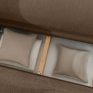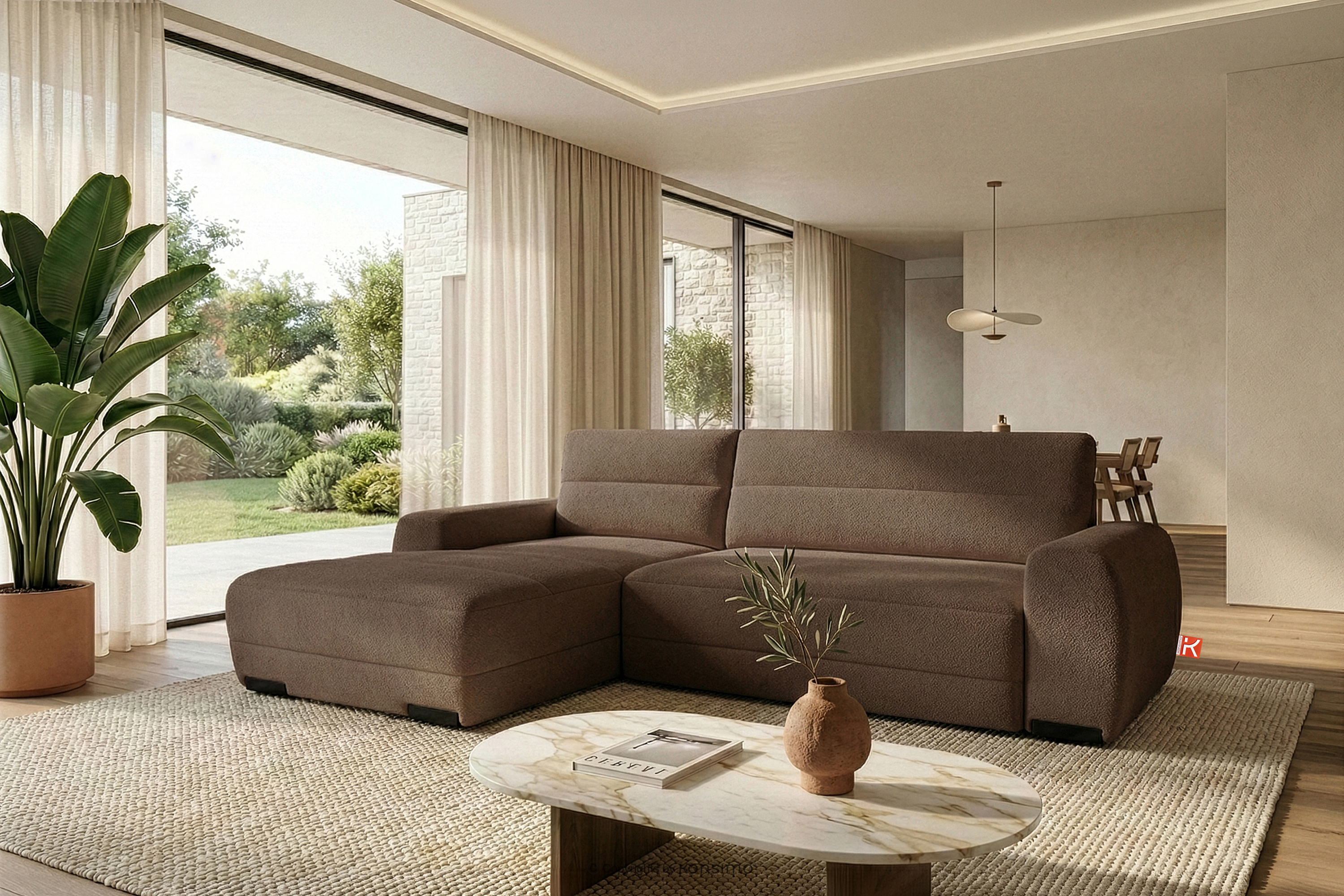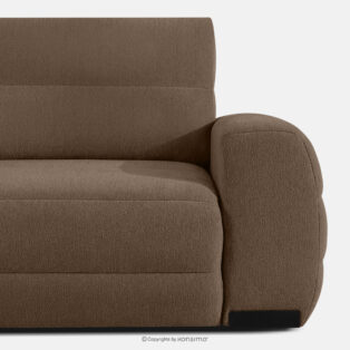 Nowoczesny narożnik w tkaninie szenilowej lewy brązowy doskonale wpisuje się w najnowsze trendy estetyki modernistycznej i skandynawskiej prostoty. Charakterystyczne, zaokrąglone linie podłokietników i łagodne kontury oparć nadają meblowi organiczny, a zarazem dynamiczny charakter, który przełamuje surowość geometrycznych podziałów. Głównym atutem wizualnym i dotykowym kolekcji jest zastosowanie ekskluzywnej tkaniny szenilowej. Ten wyjątkowy materiał, cechujący się gęstym splotem i subtelnym połyskiem, nie tylko zachwyca miękkością, ale również subtelnie odbija światło, podkreślając objętość i strukturę mebla.