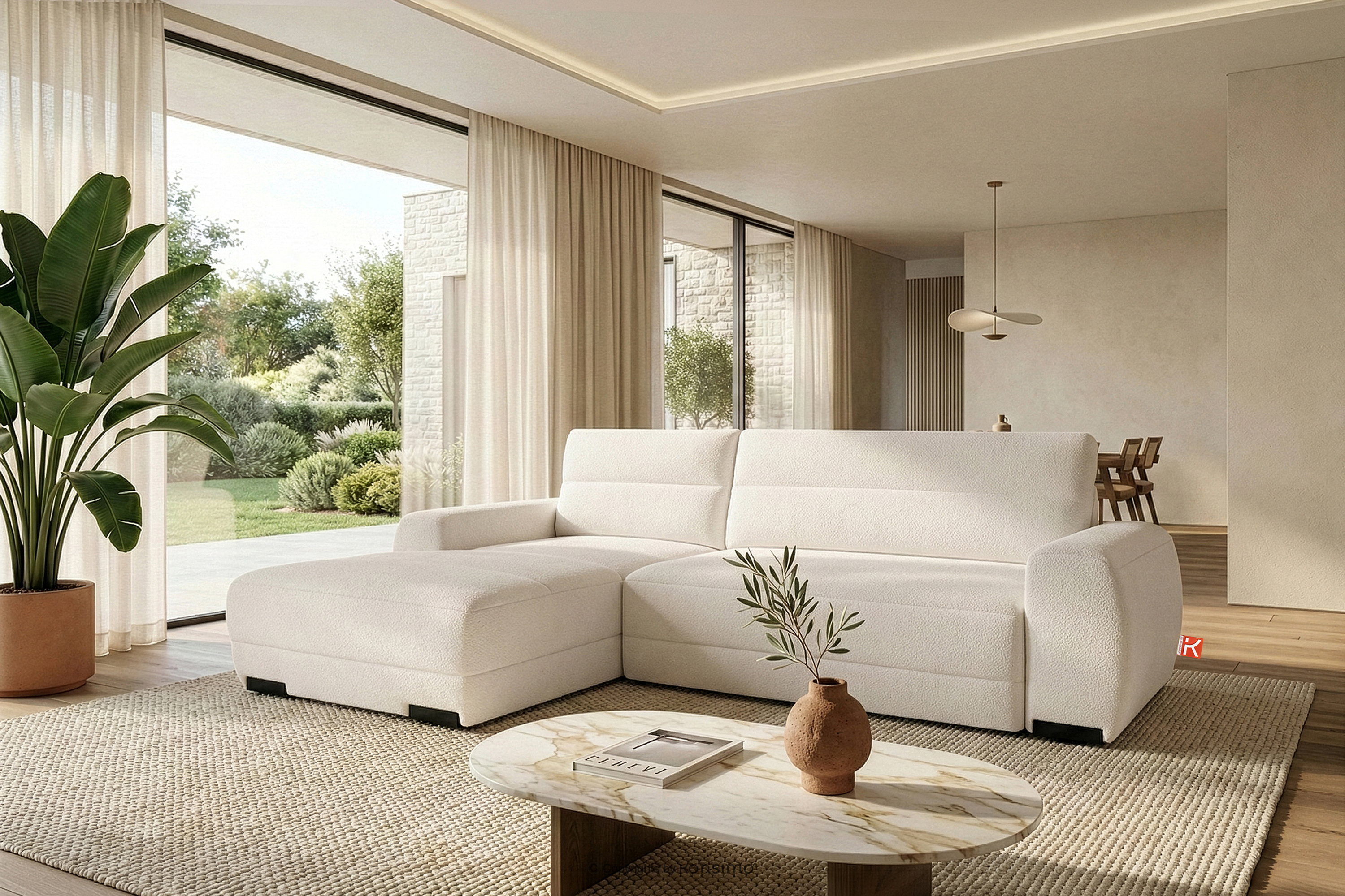 Nowoczesny narożnik w tkaninie szenilowej lewy ecru doskonale wpisuje się w najnowsze trendy estetyki modernistycznej i skandynawskiej prostoty. Charakterystyczne, zaokrąglone linie podłokietników i łagodne kontury oparć nadają meblowi organiczny, a zarazem dynamiczny charakter, który przełamuje surowość geometrycznych podziałów. Głównym atutem wizualnym i dotykowym kolekcji jest zastosowanie ekskluzywnej tkaniny szenilowej. Ten wyjątkowy materiał, cechujący się gęstym splotem i subtelnym połyskiem, nie tylko zachwyca miękkością, ale również subtelnie odbija światło, podkreślając objętość i strukturę mebla.