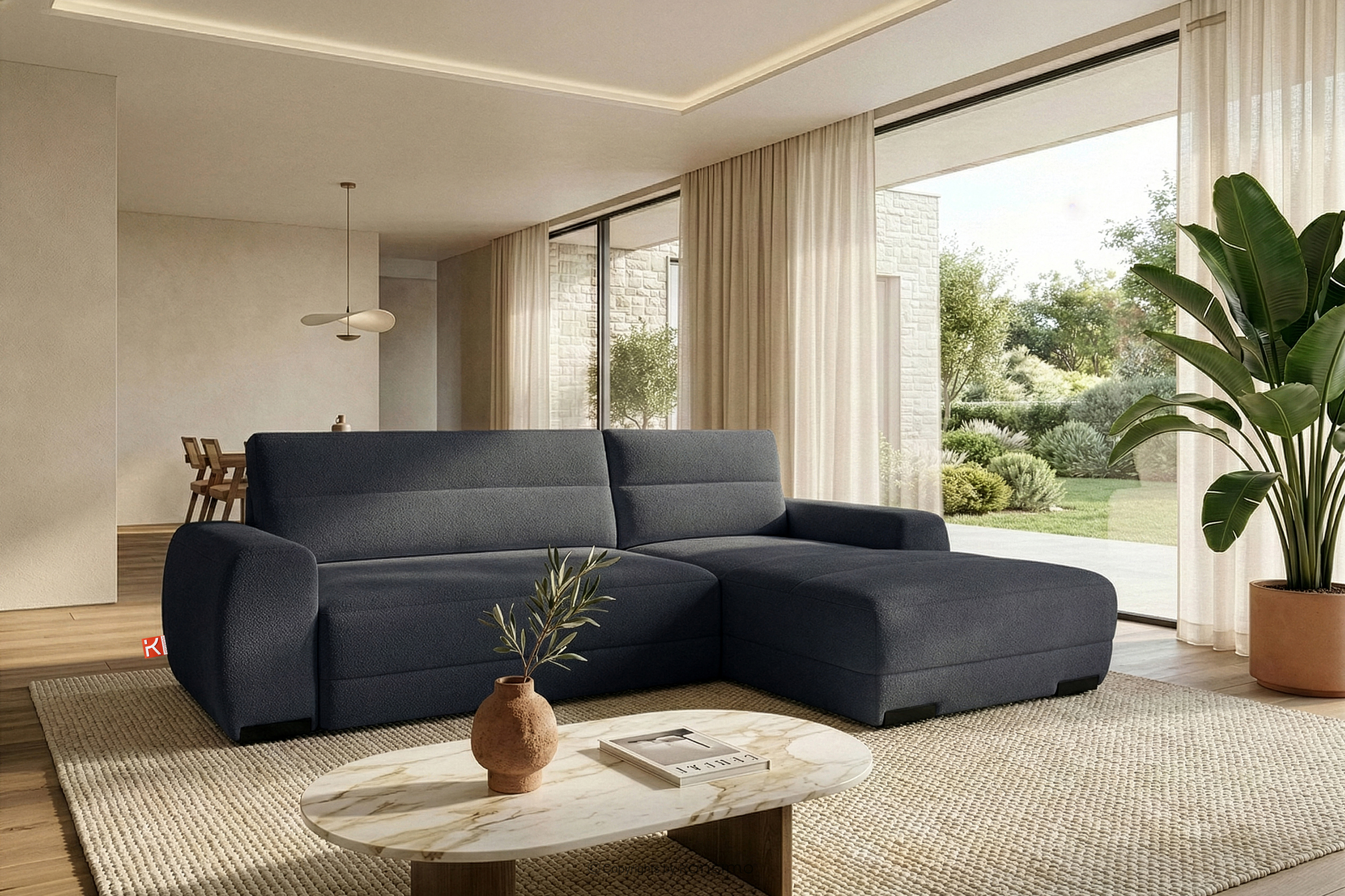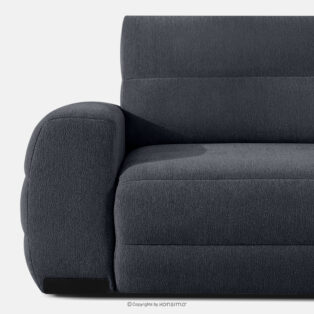 Nowoczesny narożnik w tkaninie szenilowej prawy grafitowy doskonale wpisuje się w najnowsze trendy estetyki modernistycznej i skandynawskiej prostoty. Charakterystyczne, zaokrąglone linie podłokietników i łagodne kontury oparć nadają meblowi organiczny, a zarazem dynamiczny charakter, który przełamuje surowość geometrycznych podziałów. Głównym atutem wizualnym i dotykowym kolekcji jest zastosowanie ekskluzywnej tkaniny szenilowej. Ten wyjątkowy materiał, cechujący się gęstym splotem i subtelnym połyskiem, nie tylko zachwyca miękkością, ale również subtelnie odbija światło, podkreślając objętość i strukturę mebla.