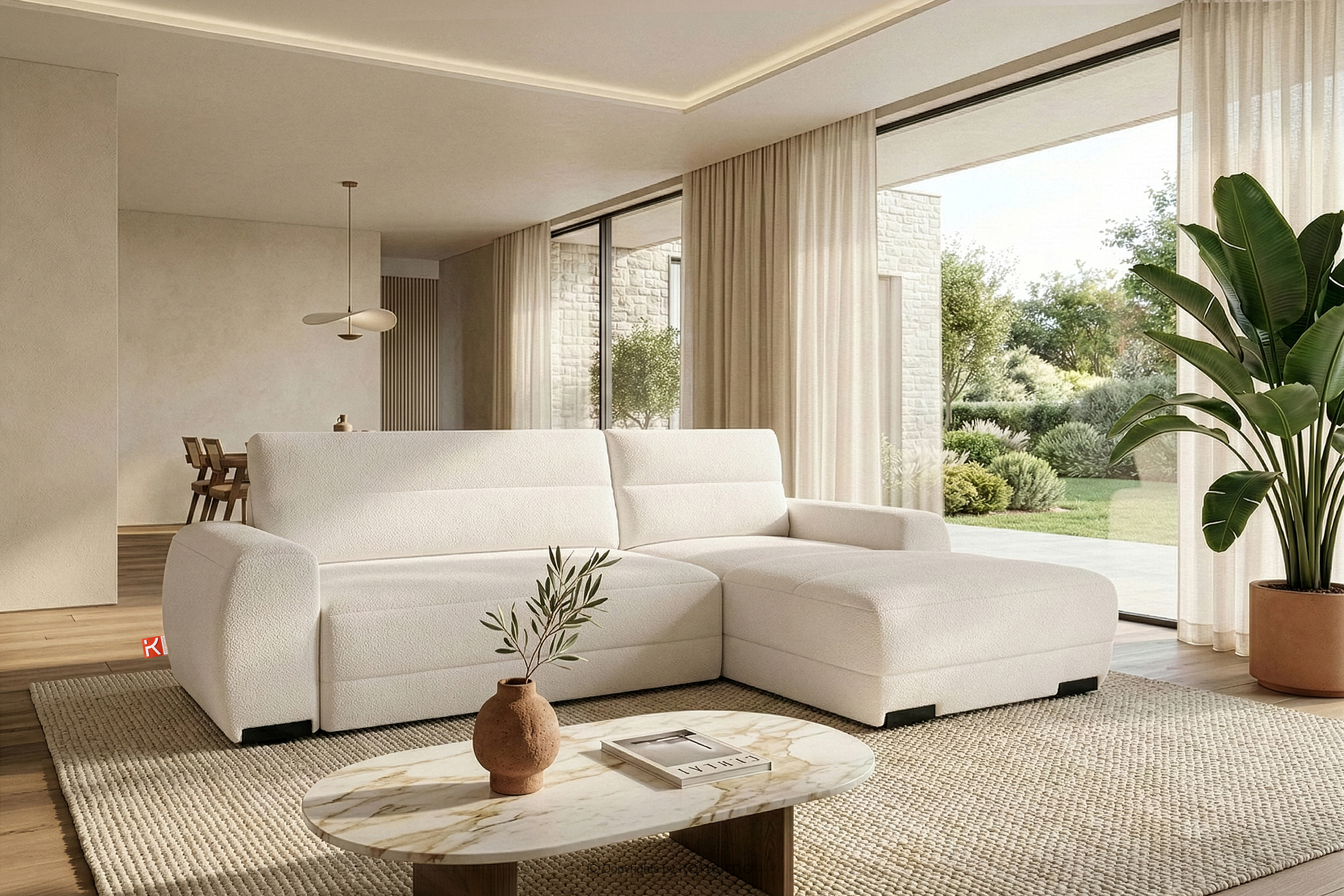Nowoczesny narożnik w tkaninie szenilowej prawy ecru doskonale wpisuje się w najnowsze trendy estetyki modernistycznej i skandynawskiej prostoty. Charakterystyczne, zaokrąglone linie podłokietników i łagodne kontury oparć nadają meblowi organiczny, a zarazem dynamiczny charakter, który przełamuje surowość geometrycznych podziałów. Głównym atutem wizualnym i dotykowym kolekcji jest zastosowanie ekskluzywnej tkaniny szenilowej. Ten wyjątkowy materiał, cechujący się gęstym splotem i subtelnym połyskiem, nie tylko zachwyca miękkością, ale również subtelnie odbija światło, podkreślając objętość i strukturę mebla.
