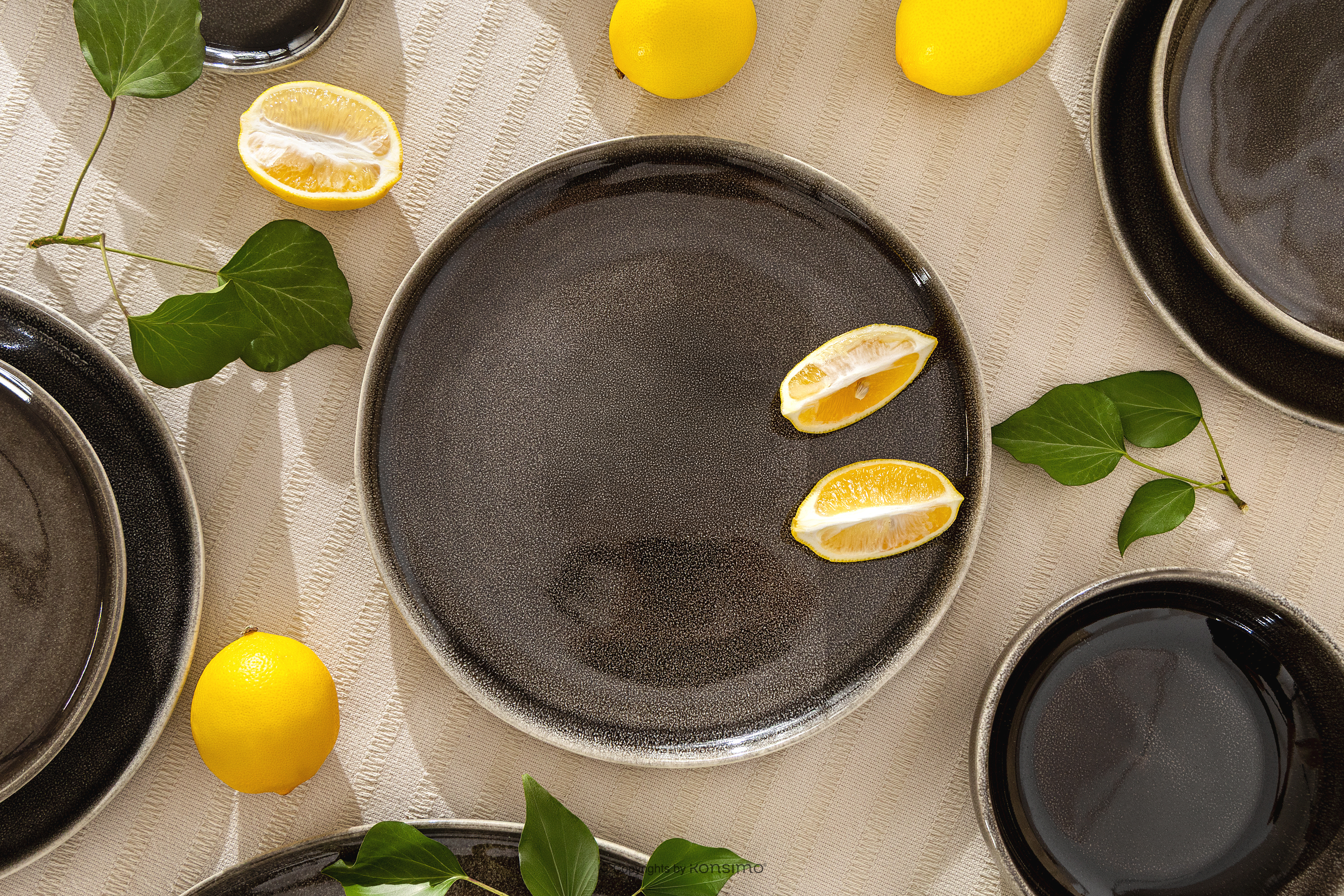 Każdy element zastawy wyróżnia się unikatowym wzorem, uzyskanym dzięki zastosowaniu szkła reaktywnego. To technika, w której szkliwo podczas wypalania w piecu łączy się i reaguje w niepowtarzalny sposób, tworząc subtelne przejścia kolorystyczne, lekkie różnice w nasyceniu barw oraz charakterystyczne, naturalne niuanse. Efekt finalny sprawia, że każda miska, talerz czy kubek jest jedyny w swoim rodzaju — delikatnie różni się od pozostałych, zachowując jednocześnie spójność całej kolekcji. Kolorystyka łączy odcienie brązu, szarości i beżu, przywołując skojarzenia z naturalnymi kamieniami, ceramiką z tradycyjnych manufaktur oraz stonowaną paletą ziemi. Ta mieszanka barw została dobrana tak, by naczynia były uniwersalne, ponadczasowe i harmonijnie wpisywały się w różne typy aranżacji wnętrz. Reaktywne szkliwo nadaje im delikatnego połysku, głębi i charakteru, czyniąc zastawę wyjątkową nie tylko użytkowo, ale i wizualnie.
