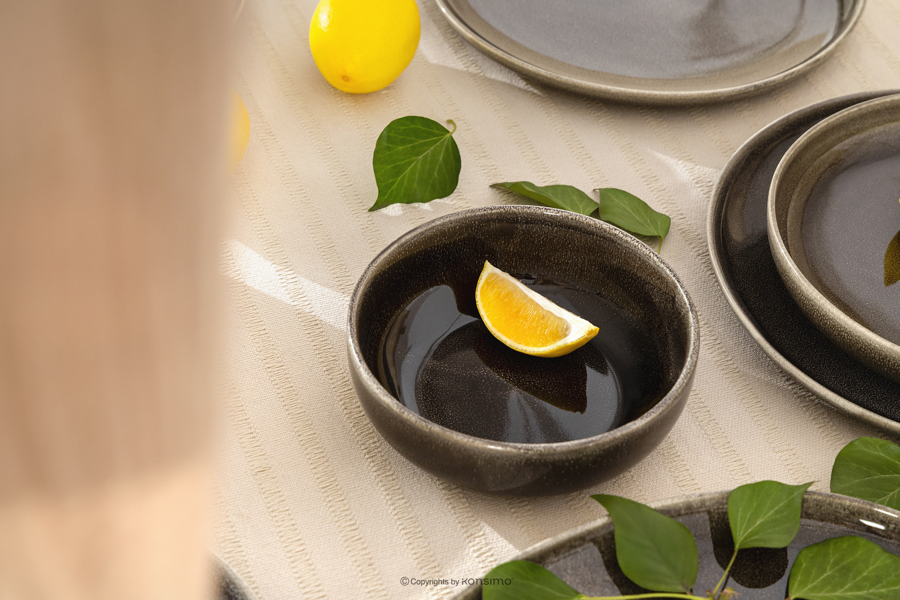 Każdy element zastawy wyróżnia się unikatowym wzorem, uzyskanym dzięki zastosowaniu szkła reaktywnego. To technika, w której szkliwo podczas wypalania w piecu łączy się i reaguje w niepowtarzalny sposób, tworząc subtelne przejścia kolorystyczne, lekkie różnice w nasyceniu barw oraz charakterystyczne, naturalne niuanse. Efekt finalny sprawia, że każda miska, talerz czy kubek jest jedyny w swoim rodzaju — delikatnie różni się od pozostałych, zachowując jednocześnie spójność całej kolekcji. Kolorystyka łączy odcienie brązu, szarości i beżu, przywołując skojarzenia z naturalnymi kamieniami, ceramiką z tradycyjnych manufaktur oraz stonowaną paletą ziemi. Ta mieszanka barw została dobrana tak, by naczynia były uniwersalne, ponadczasowe i harmonijnie wpisywały się w różne typy aranżacji wnętrz. Reaktywne szkliwo nadaje im delikatnego połysku, głębi i charakteru, czyniąc zastawę wyjątkową nie tylko użytkowo, ale i wizualnie.