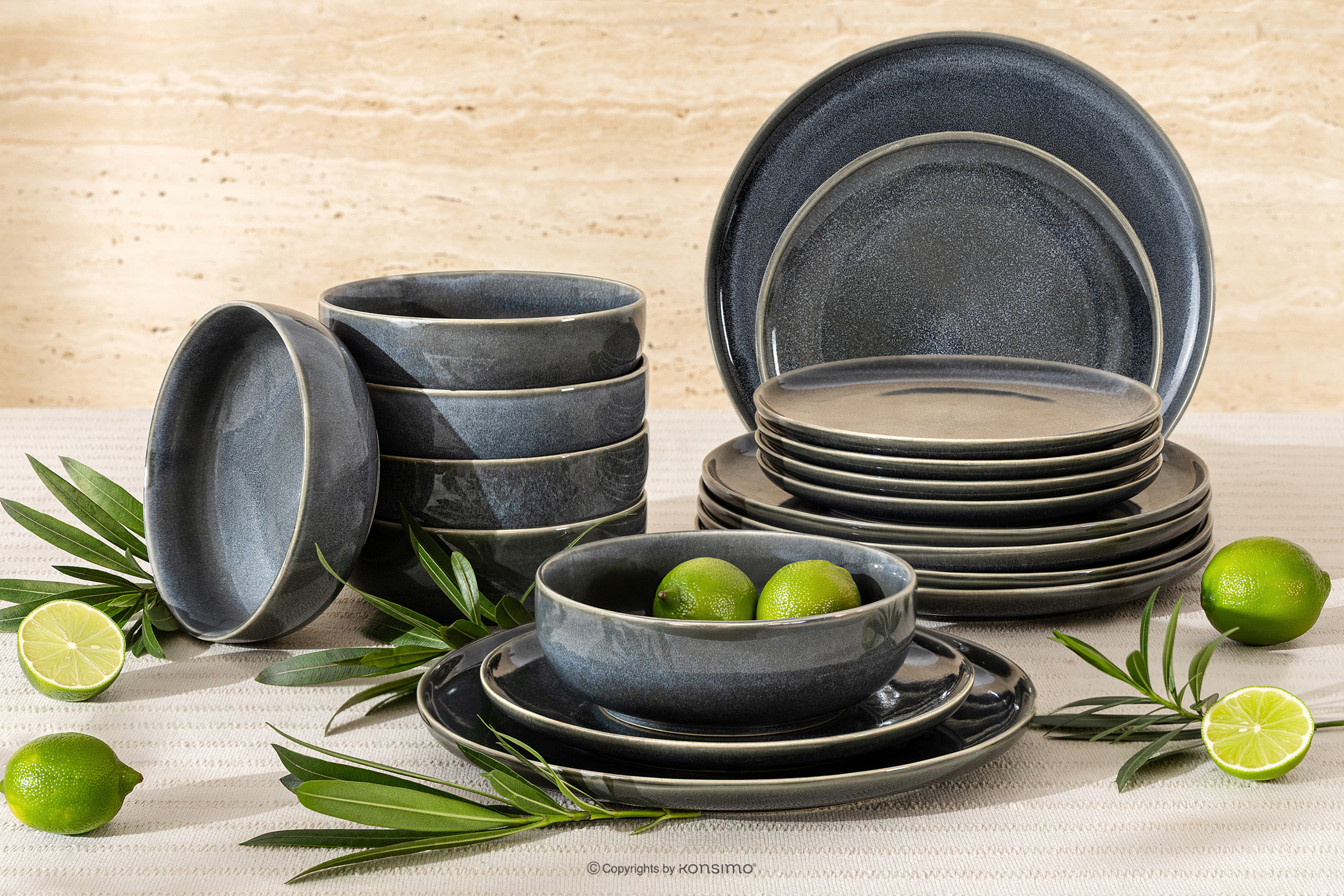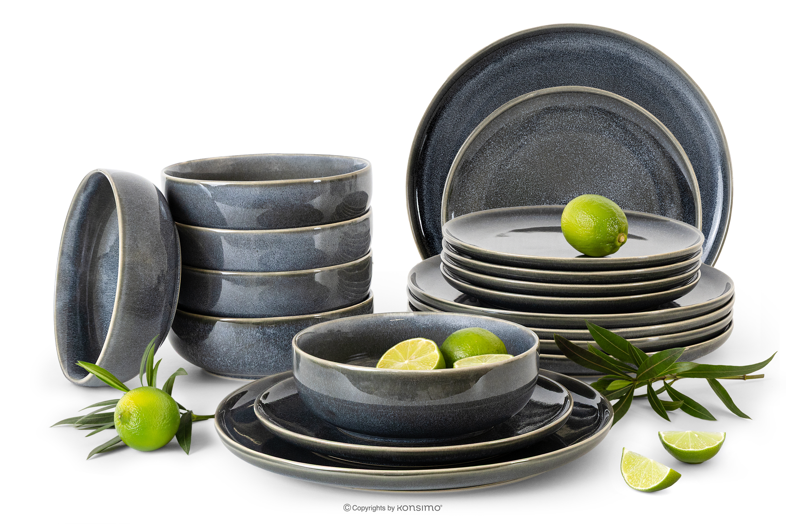 Zestaw obiadowy 6 os. (18 el.) z ceramiki w stylu rustykalnym niebieski/szary/beżowy zaprojektowano z myślą o trwałości, komfortowym użytkowaniu i zachowaniu piękna na lata. Każdy element powstaje w procesie, który łączy tradycyjne rzemiosło z nowoczesnymi technikami obróbki, dzięki czemu naczynia charakteryzują się wysoką odpornością na codzienne użytkowanie. Ceramika jest solidna, co sprawia, że świetnie sprawdza się zarówno na eleganckim stole, jak i przy codziennych, rodzinnych posiłkach.