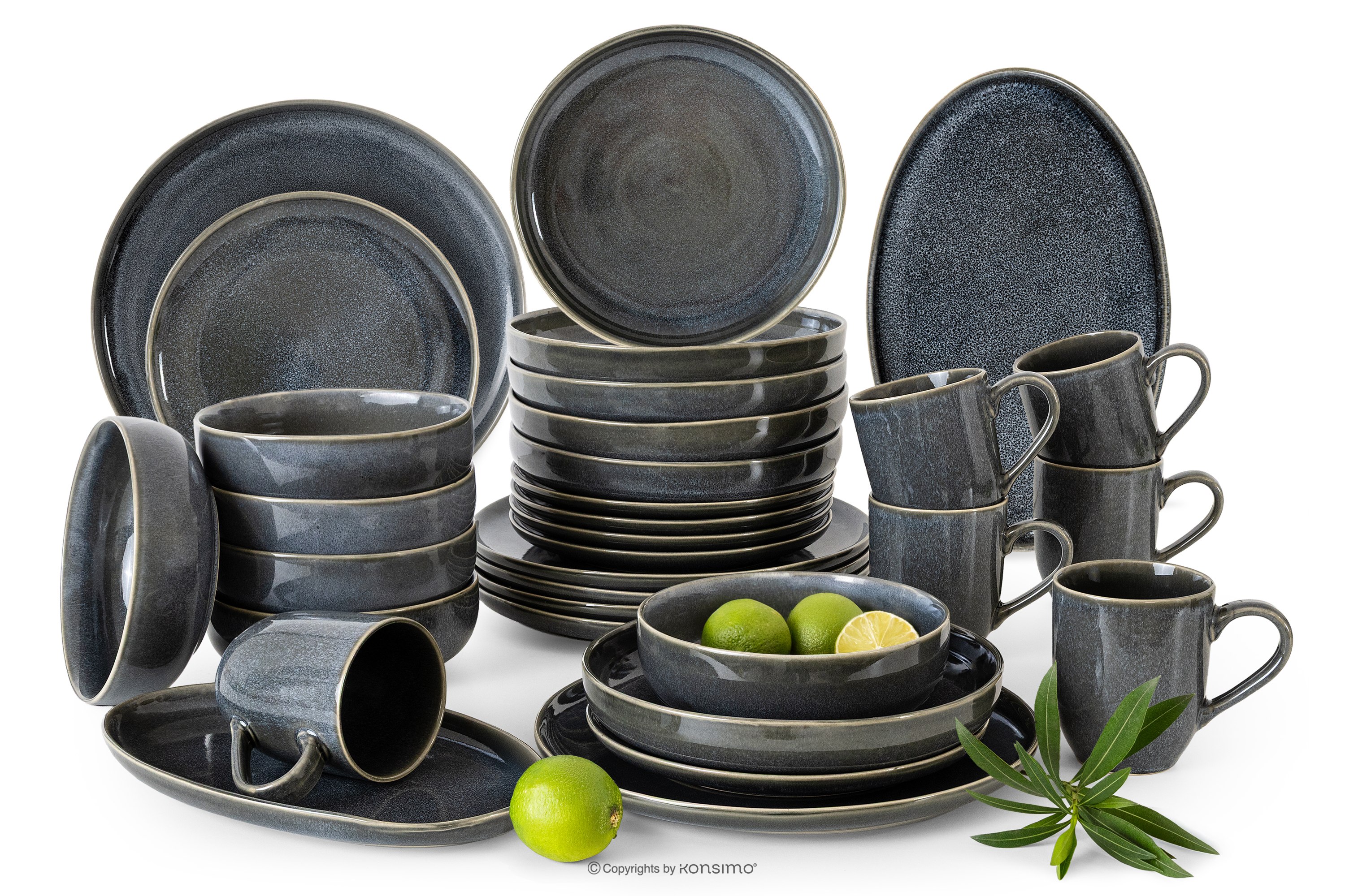 Zestaw obiadowy 6 os. (32 el.) z ceramiki w stylu rustykalnym niebieski/szary/beżowy zaprojektowano z myślą o trwałości, komfortowym użytkowaniu i zachowaniu piękna na lata. Każdy element powstaje w procesie, który łączy tradycyjne rzemiosło z nowoczesnymi technikami obróbki, dzięki czemu naczynia charakteryzują się wysoką odpornością na codzienne użytkowanie. Ceramika jest solidna, co sprawia, że świetnie sprawdza się zarówno na eleganckim stole, jak i przy codziennych, rodzinnych posiłkach.