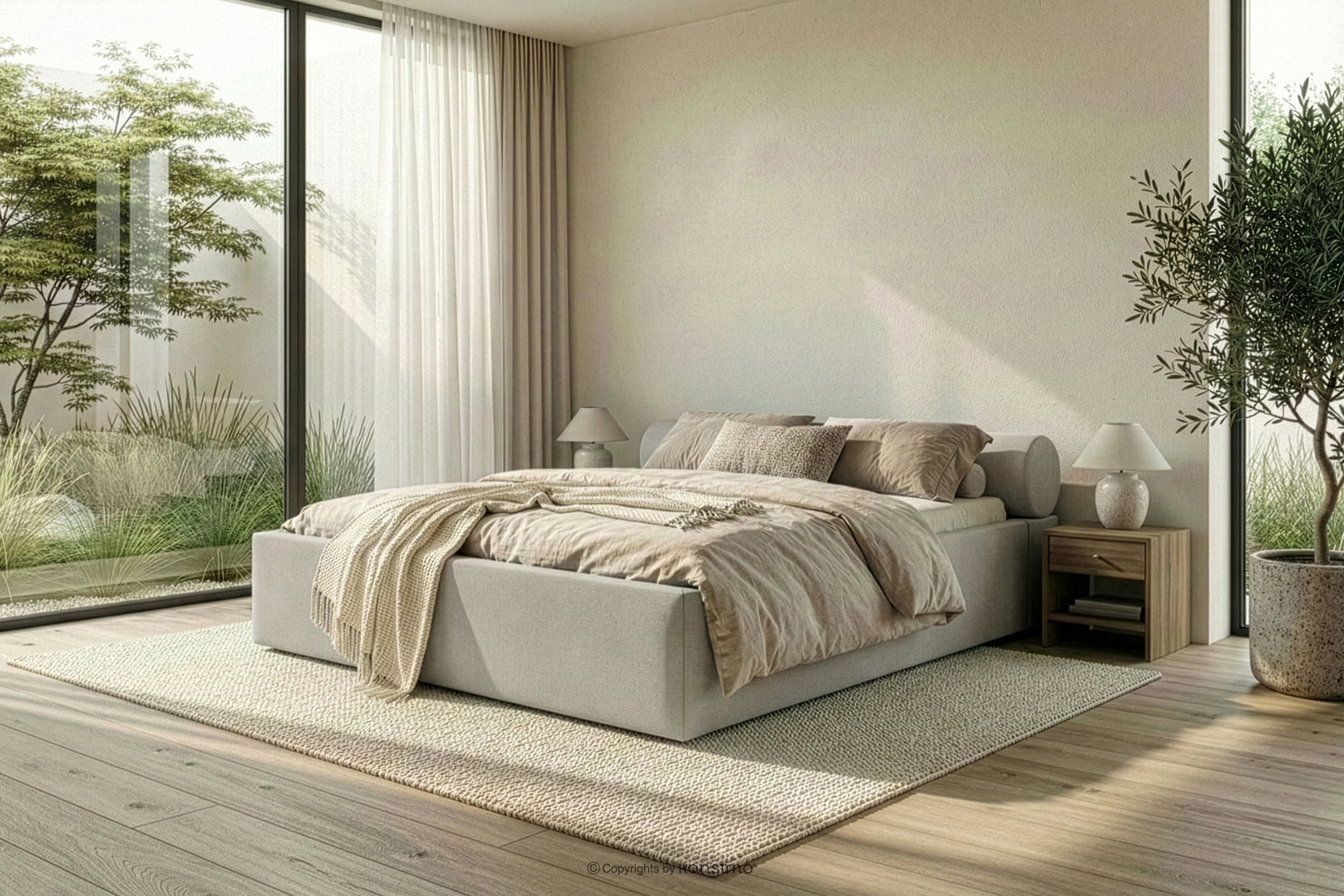 LUNEO zobacz całą kolekcję Łóżko tapicerowane japandi z pojemnikiem na pościel 180 cm kremowy- kolor kremowy