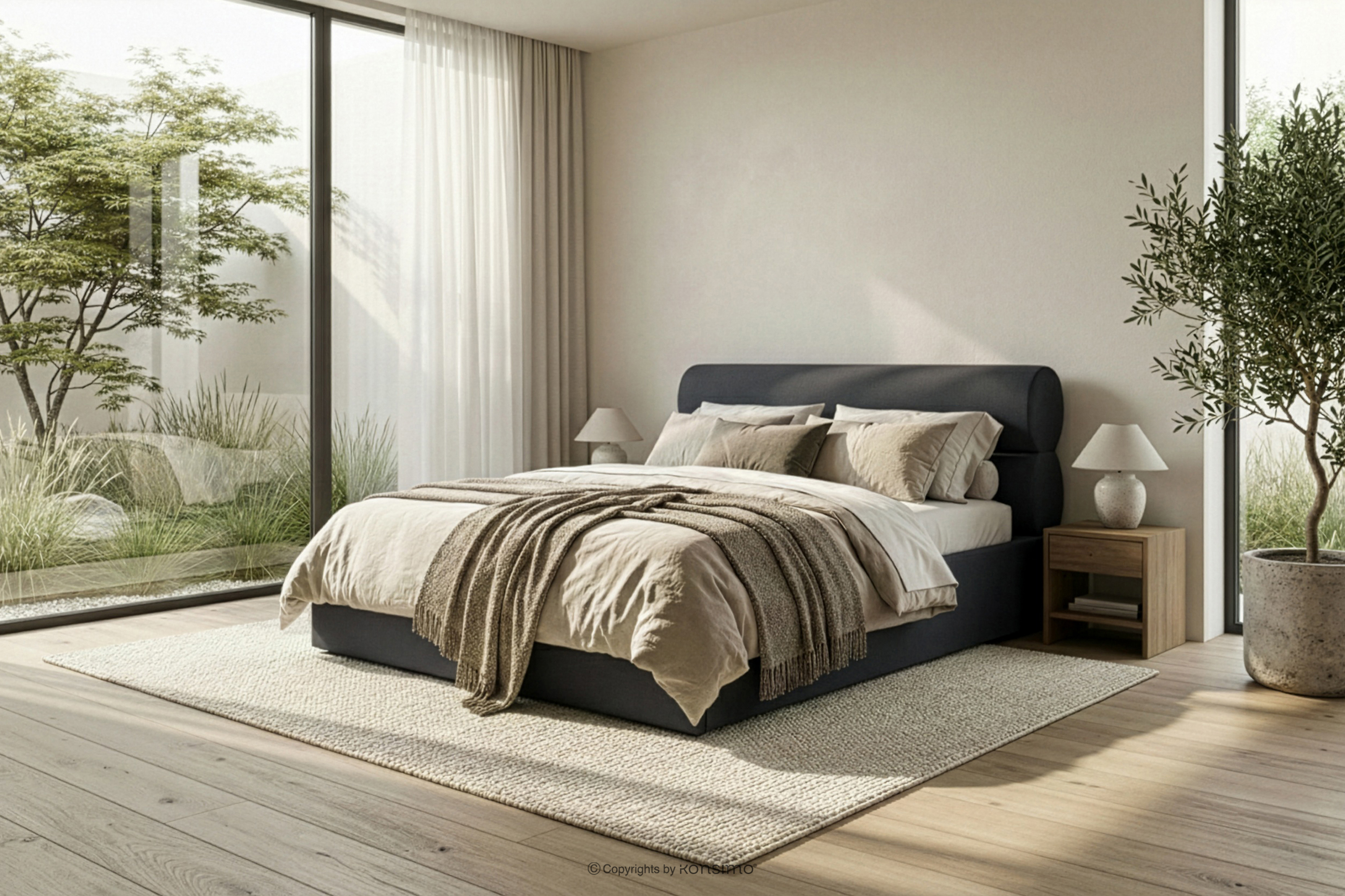LUNEO Łóżko tapicerowane w stylu japandi z pojemnikiem na pościel 160 cm antracytowy
