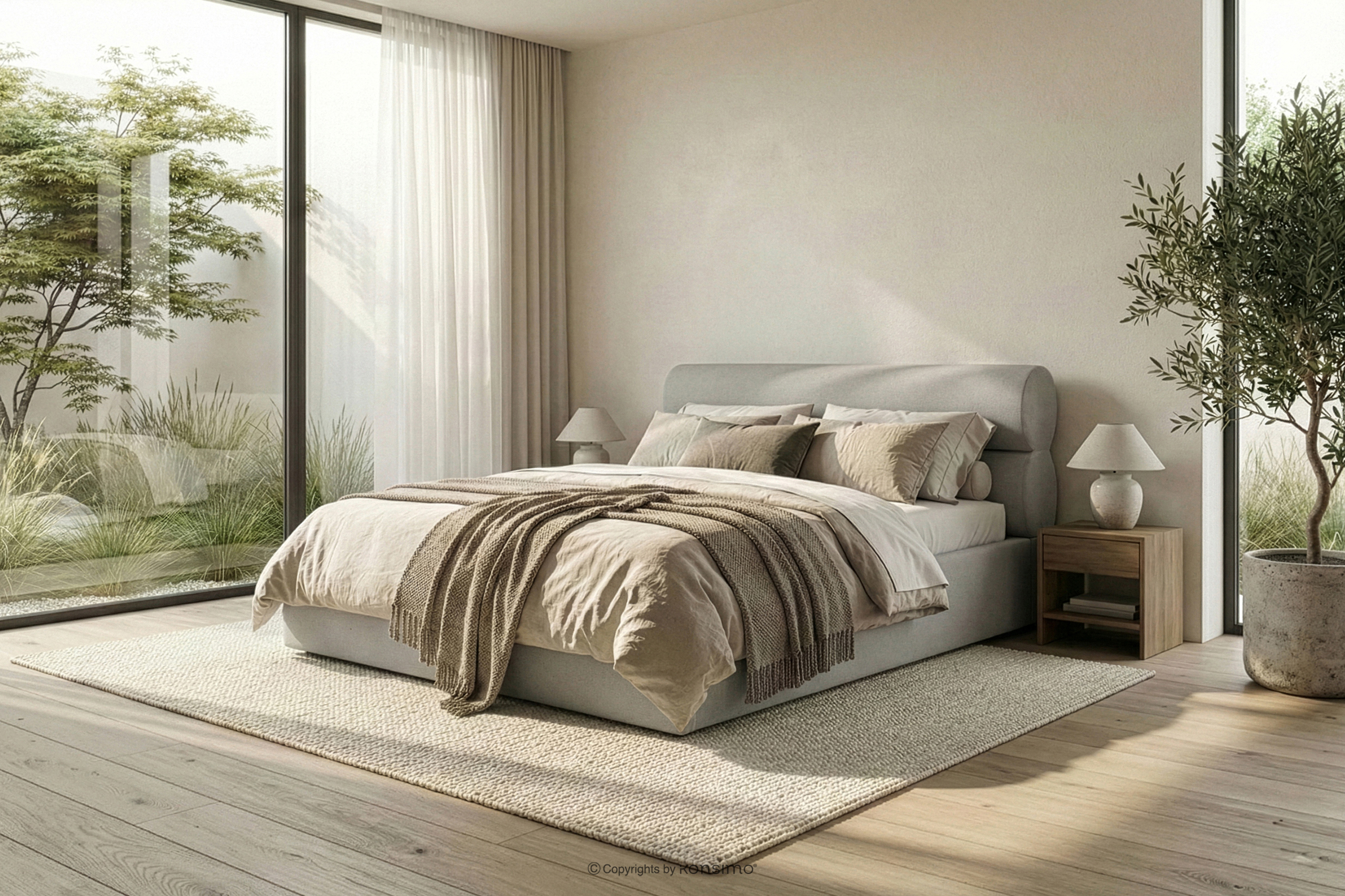 LUNEO Łóżko tapicerowane w stylu japandi z pojemnikiem na pościel 180 cm kremowy