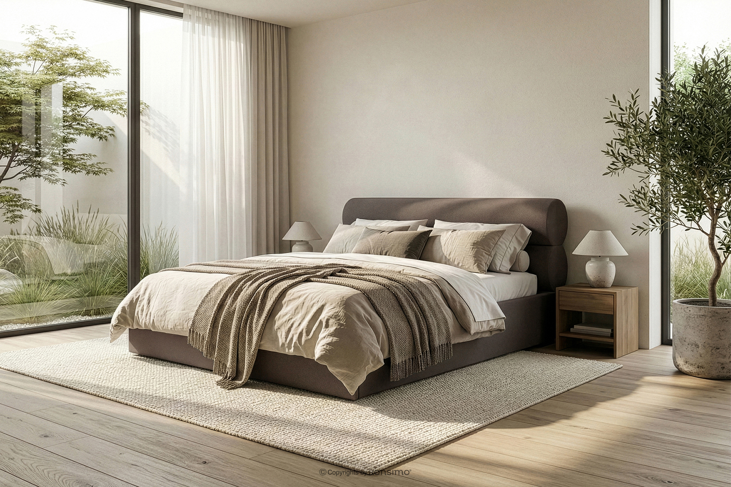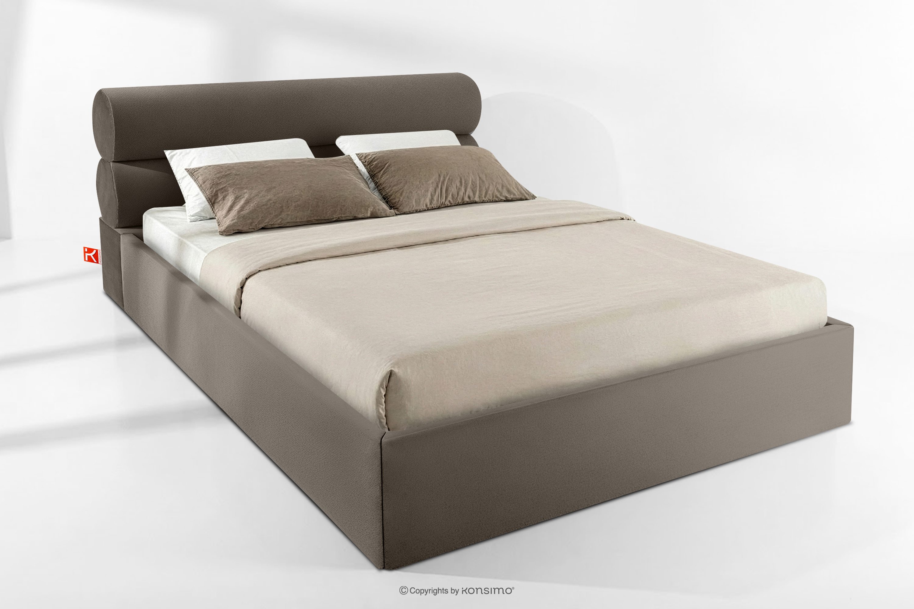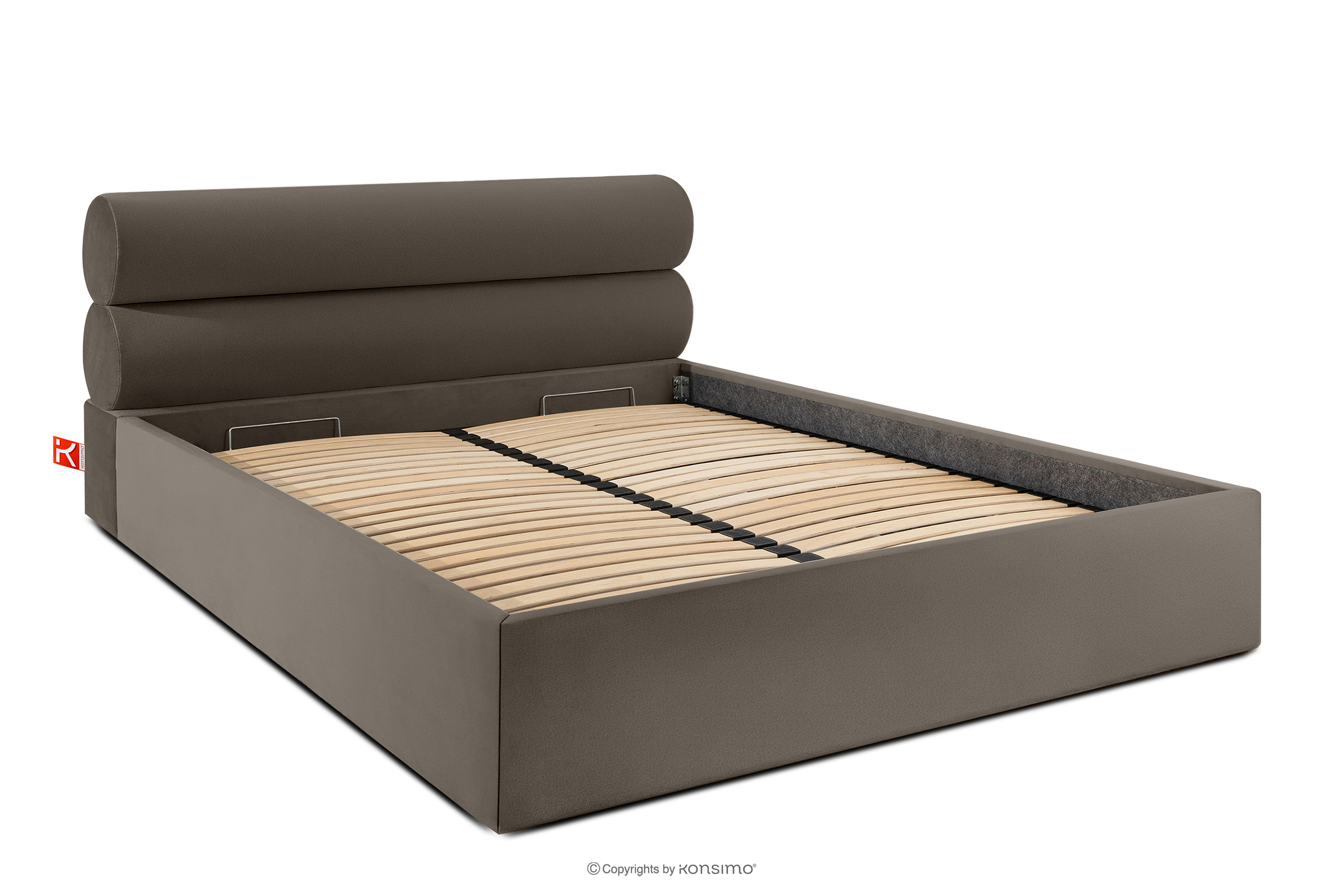 LUNEO zobacz całą kolekcję Łóżko tapicerowane w stylu japandi z pojemnikiem na pościel 200 cm brązowy- kolor brązowy