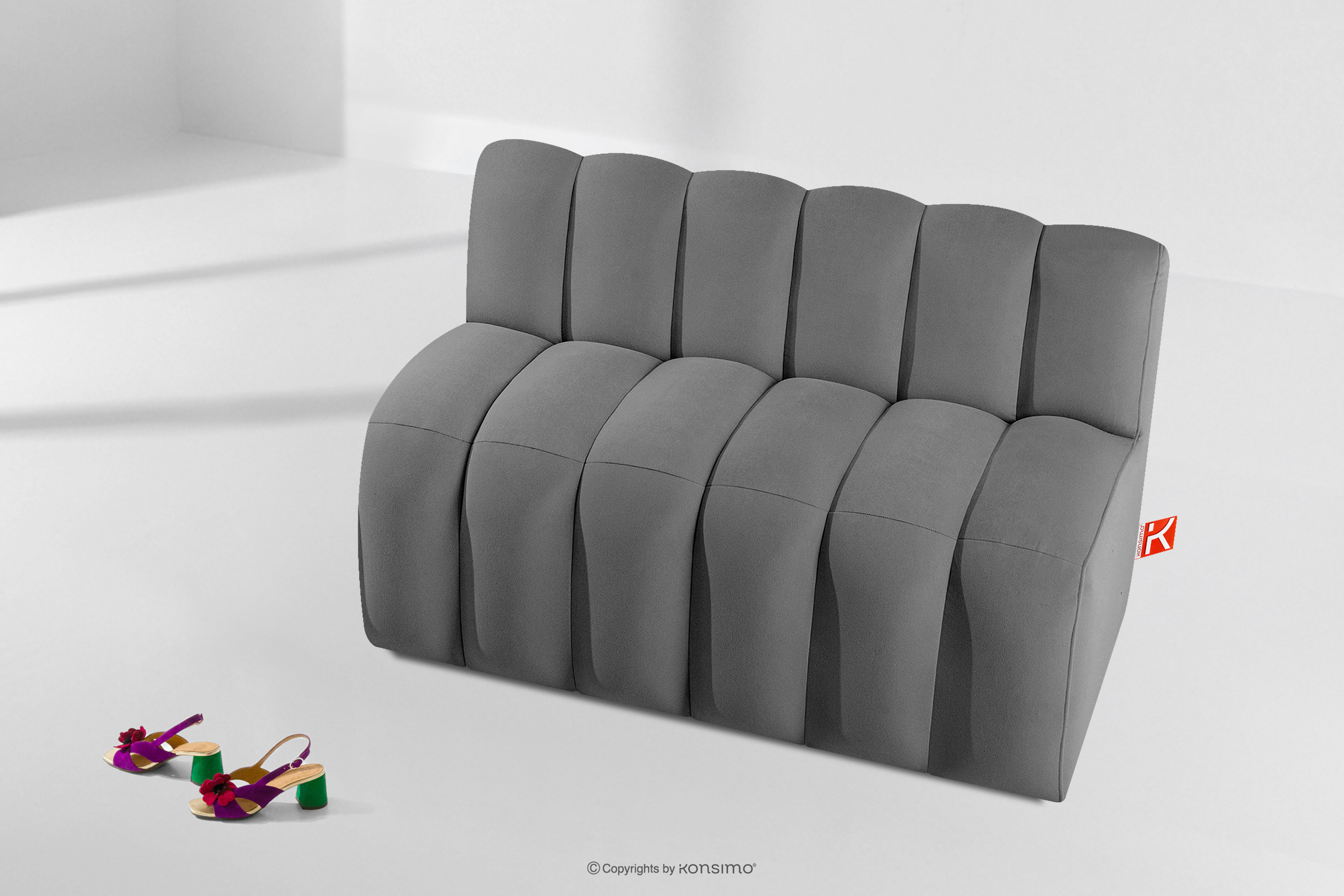 Konstrukcja ławki opiera się na niskim profilu, co sprawia, że mebel jest wyjątkowo stabilny i nie chwieje się nawet przy pełnym obciążeniu przez kilka osób naraz. Wyraźne segmentowanie siedziska i oparcia zapobiega nadmiernemu naciąganiu się materiału, dzięki czemu tapicerka zachowuje swój pierwotny, schludny wygląd przez długie lata, nawet przy intensywnym użytkowaniu.