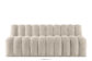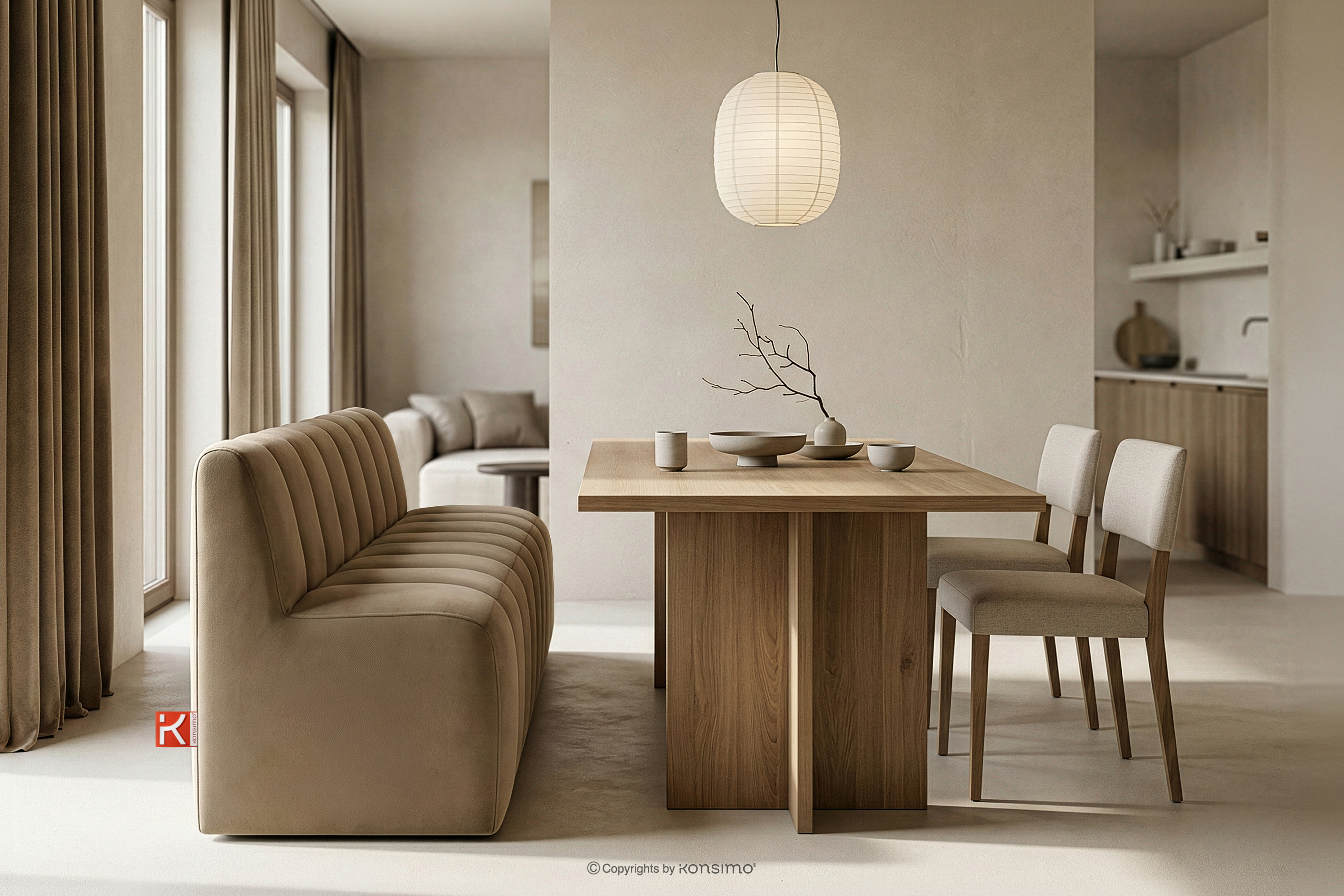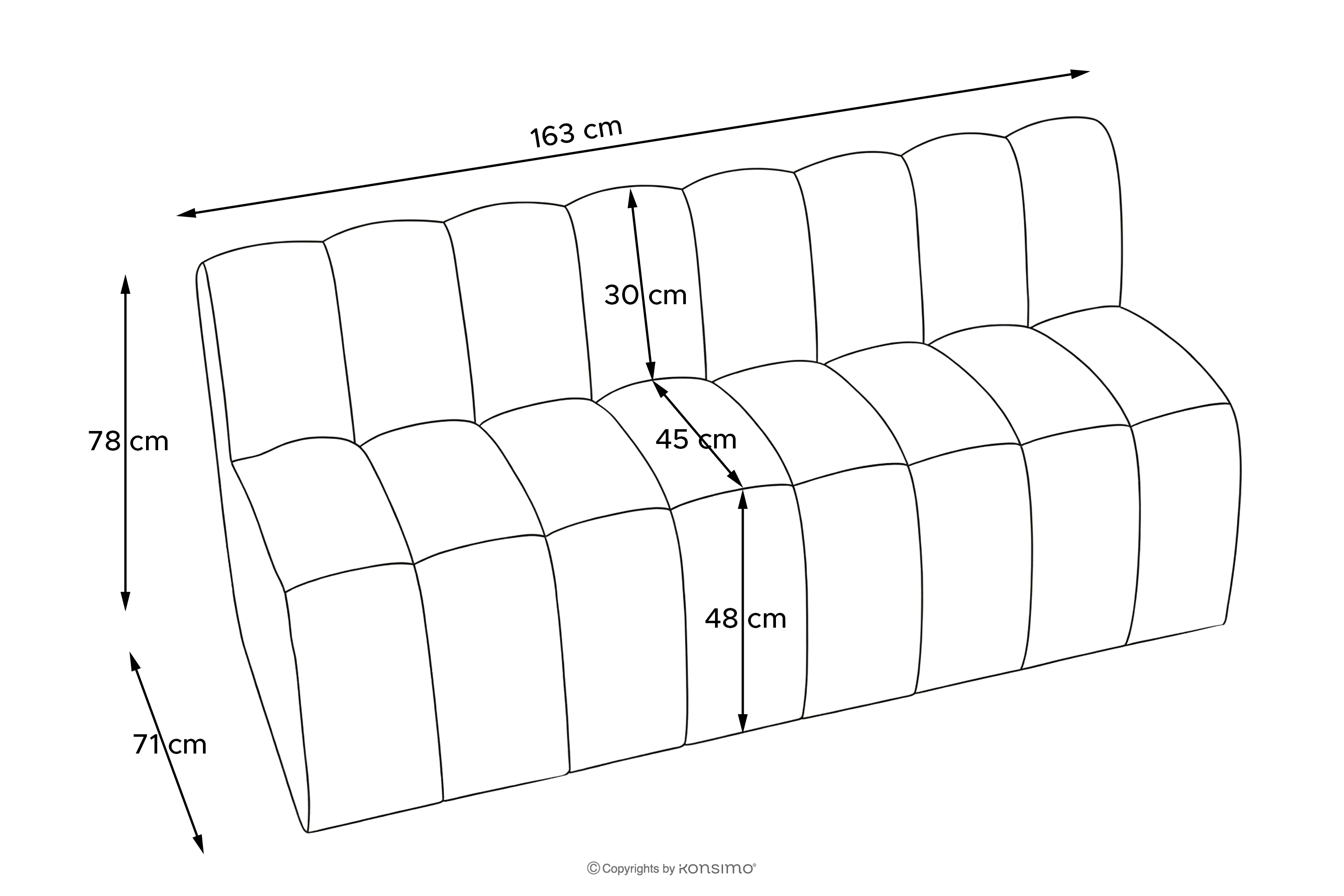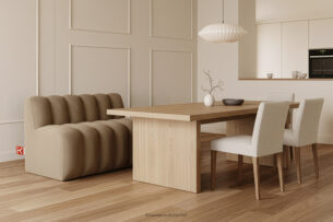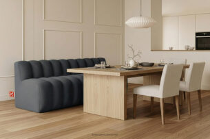 Konstrukcja ławki opiera się na niskim profilu, co sprawia, że mebel jest wyjątkowo stabilny i nie chwieje się nawet przy pełnym obciążeniu przez kilka osób naraz. Wyraźne segmentowanie siedziska i oparcia zapobiega nadmiernemu naciąganiu się materiału, dzięki czemu tapicerka zachowuje swój pierwotny, schludny wygląd przez długie lata, nawet przy intensywnym użytkowaniu.