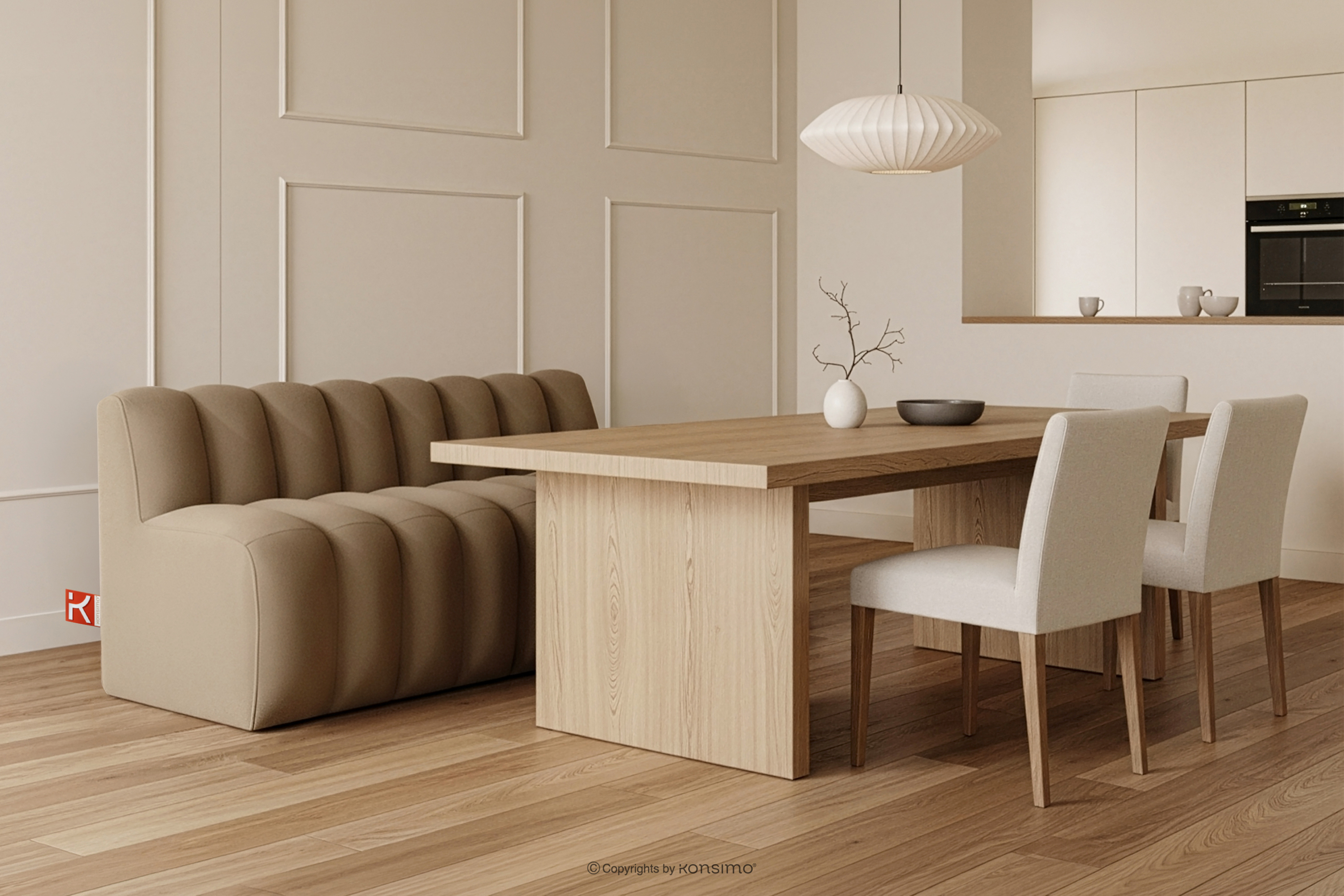 Konstrukcja ławki opiera się na niskim profilu, co sprawia, że mebel jest wyjątkowo stabilny i nie chwieje się nawet przy pełnym obciążeniu przez kilka osób naraz. Wyraźne segmentowanie siedziska i oparcia zapobiega nadmiernemu naciąganiu się materiału, dzięki czemu tapicerka zachowuje swój pierwotny, schludny wygląd przez długie lata, nawet przy intensywnym użytkowaniu.