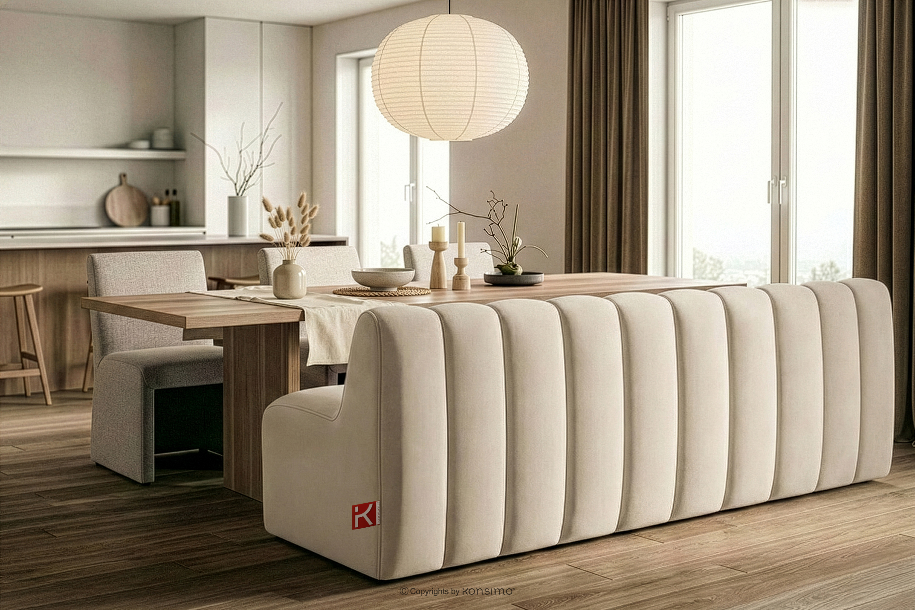 Konstrukcja ławki opiera się na niskim profilu, co sprawia, że mebel jest wyjątkowo stabilny i nie chwieje się nawet przy pełnym obciążeniu przez kilka osób naraz. Wyraźne segmentowanie siedziska i oparcia zapobiega nadmiernemu naciąganiu się materiału, dzięki czemu tapicerka zachowuje swój pierwotny, schludny wygląd przez długie lata, nawet przy intensywnym użytkowaniu.