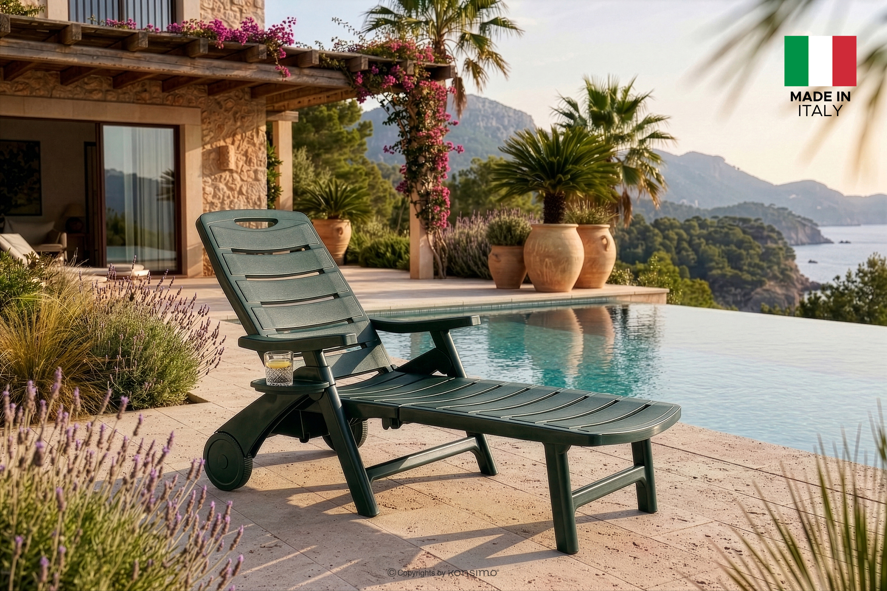 Leżak na taras z regulacją oparcia ciemny zielony to synonim nowoczesnego podejścia do wypoczynku na świeżym powietrzu, łączący w sobie włoską precyzję wykonania z niezwykłą funkcjonalnością, która zadowoli nawet najbardziej wymagających użytkowników. Materiał, z którego go wykonano jest nie tylko odporny na zmienne warunki atmosferyczne, ale również na intensywne promieniowanie UV, dzięki czemu meble zachowują swoją strukturę i estetykę przez wiele sezonów, nie blaknąc pod wpływem słońca.