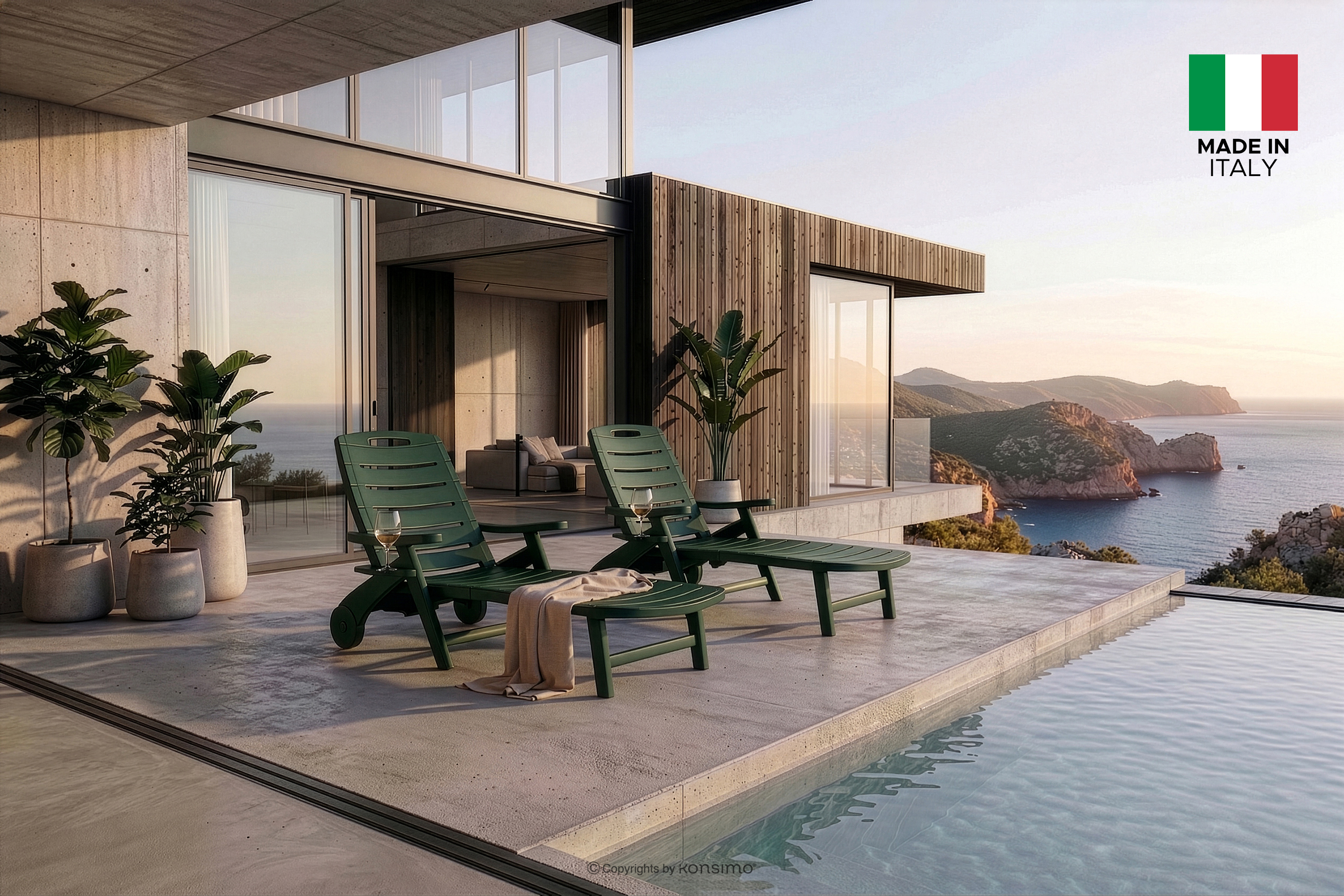Konstrukcja leżaka TIDIA została zaprojektowana z myślą o maksymalnej cyrkulacji powietrza – charakterystyczne, precyzyjnie rozmieszczone szczebelki nie tylko nadają mu nowoczesny, lekki wygląd, ale przede wszystkim zapobiegają przegrzewaniu się ciała podczas upalnych dni oraz umożliwiają swobodne odprowadzanie wody deszczowej z powierzchni mebla, co czyni go idealnym wyborem na taras, do ogrodu, nad basen czy na plażę. Solidność i stabilna konstrukcja sprawiają, że produkt ten doskonale radzi sobie w intensywnie użytkowanych przestrzeniach hotelowych, ośrodkach SPA oraz strefach relaksu, gdzie wysoka jakość wykonania musi sprostać wymaganiom dużej rotacji gości przy zachowaniu pełnego bezpieczeństwa. Co więcej, kolekcja wpisuje się w nurt ekologicznego designu, ponieważ powstała z materiałów pochodzących z recyklingu i w pełni nadaje się do ponownego przetworzenia, co czyni ją wyborem odpowiedzialnym wobec środowiska naturalnego.