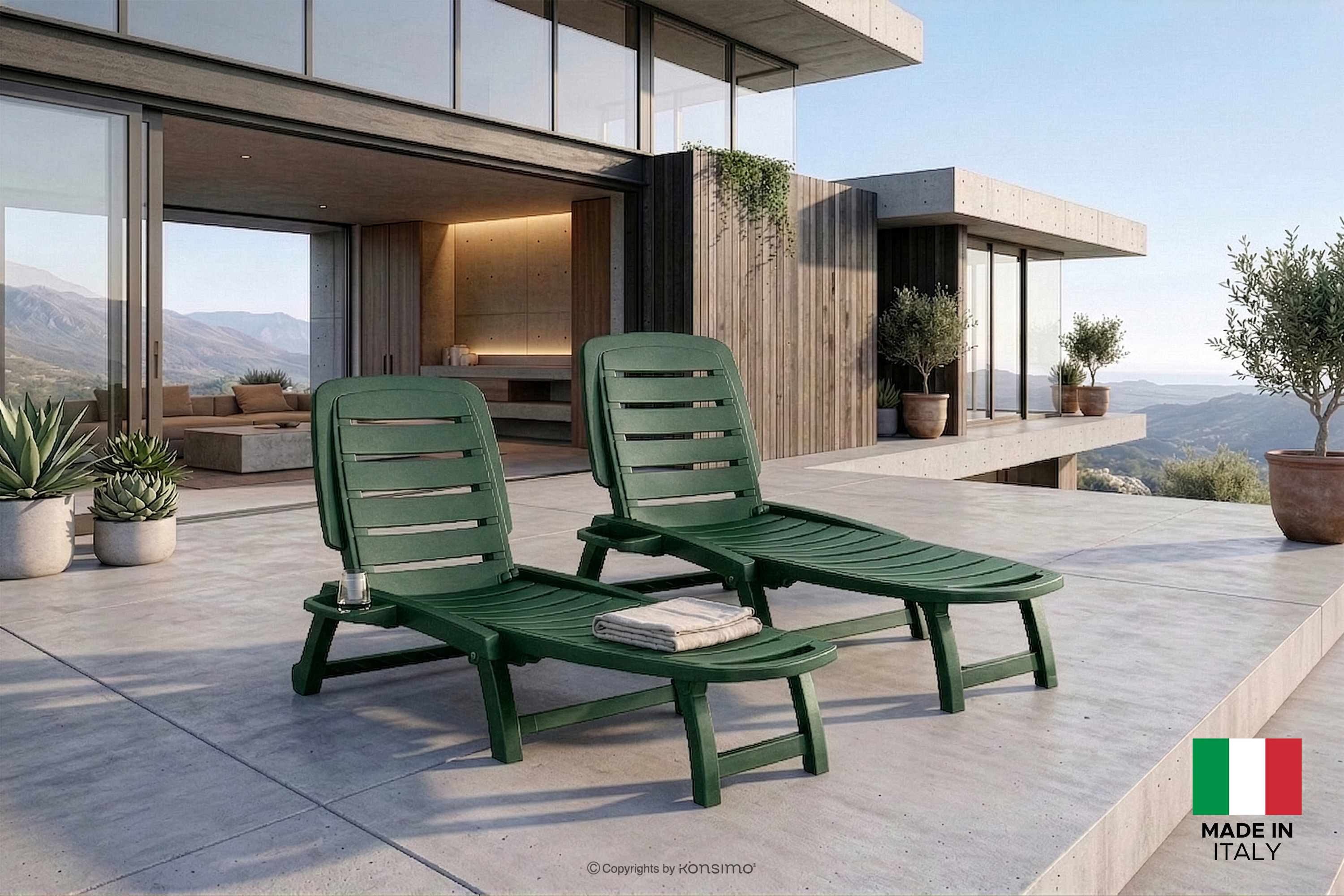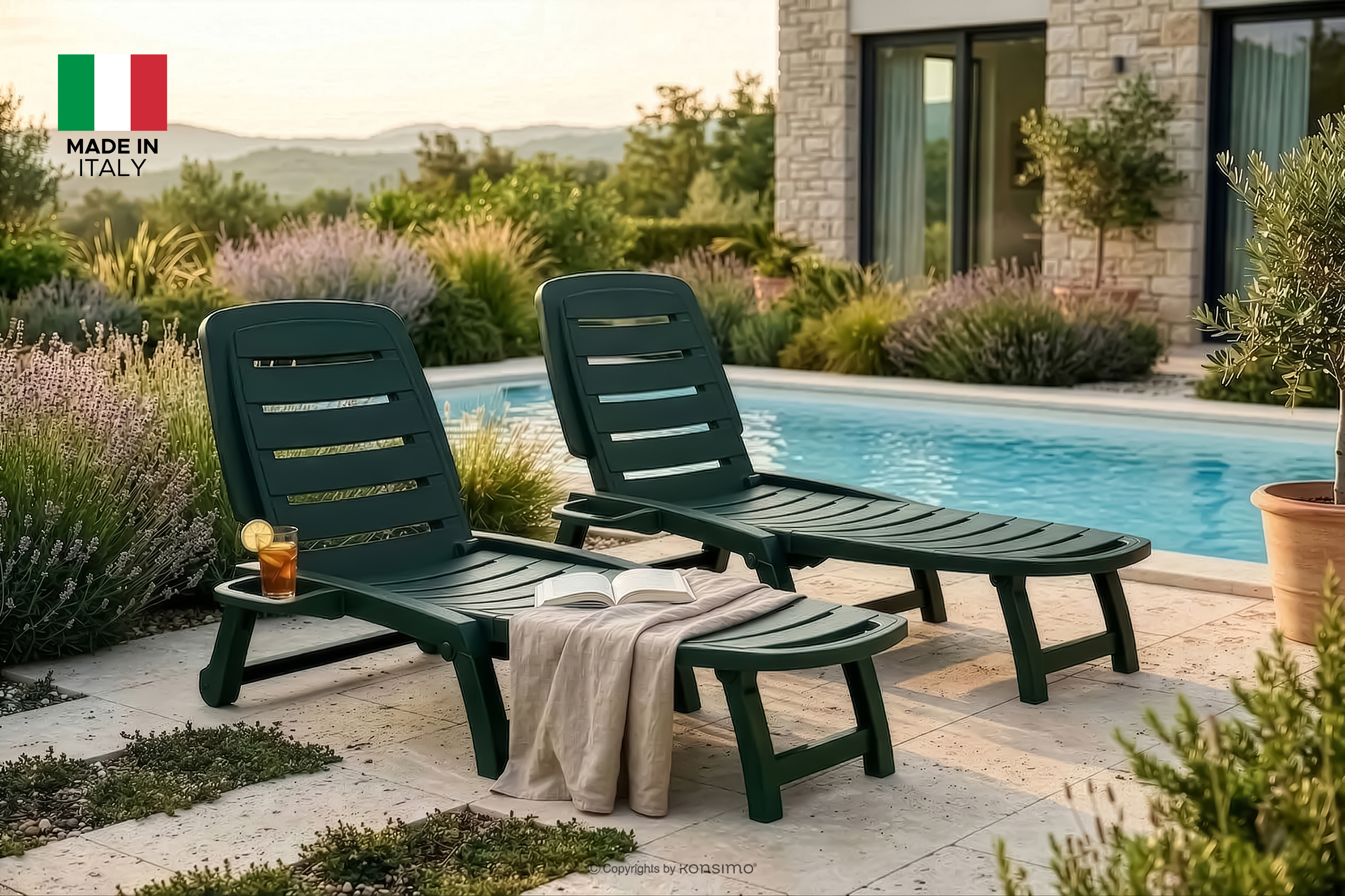 Leżak ogrodowy regulowany z uchwytem na napoje 2 szt. ciemny zielony to synonim nowoczesnego podejścia do wypoczynku na świeżym powietrzu, łączący w sobie włoską precyzję wykonania z niezwykłą funkcjonalnością, która zadowoli nawet najbardziej wymagających użytkowników. Materiał, z którego go wykonano jest nie tylko odporny na zmienne warunki atmosferyczne, ale również na intensywne promieniowanie UV, dzięki czemu meble zachowują swoją strukturę i estetykę przez wiele sezonów, nie blaknąc pod wpływem słońca.