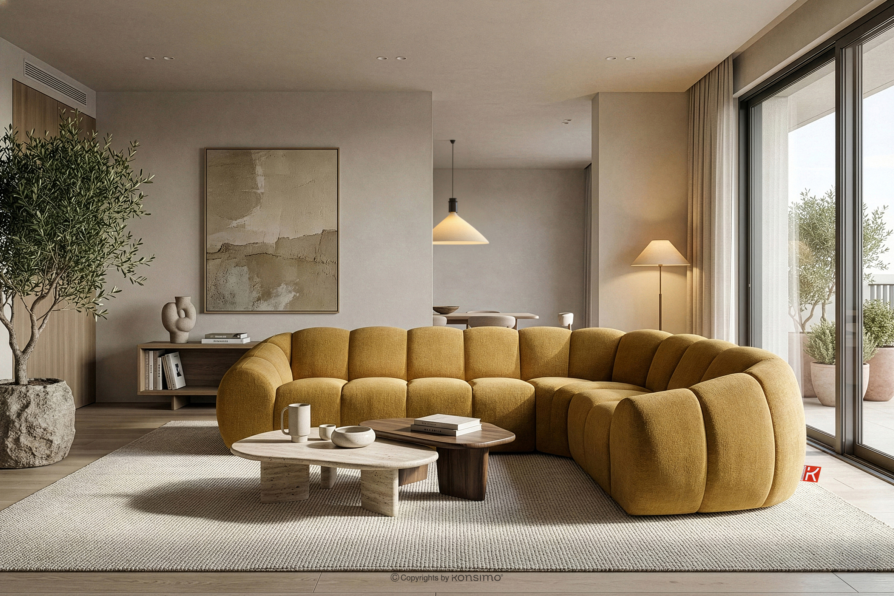 Pikowany narożnik w stylu retro modern prawy miodowy stanowi kwintesencję nowoczesnego spojrzenia na stylistykę retro-modern, w której obłe, organiczne formy spotykają się z bezkompromisową funkcjonalnością współczesnego projektowania modułowego. Każdy element tej serii został zaprojektowany z myślą o stworzeniu harmonijnej przestrzeni, która celebruje miękkie linie i geometryczny rytm charakterystyczny dla ikon designu lat siedemdziesiątych, ale w odświeżonym, luksusowym wydaniu.