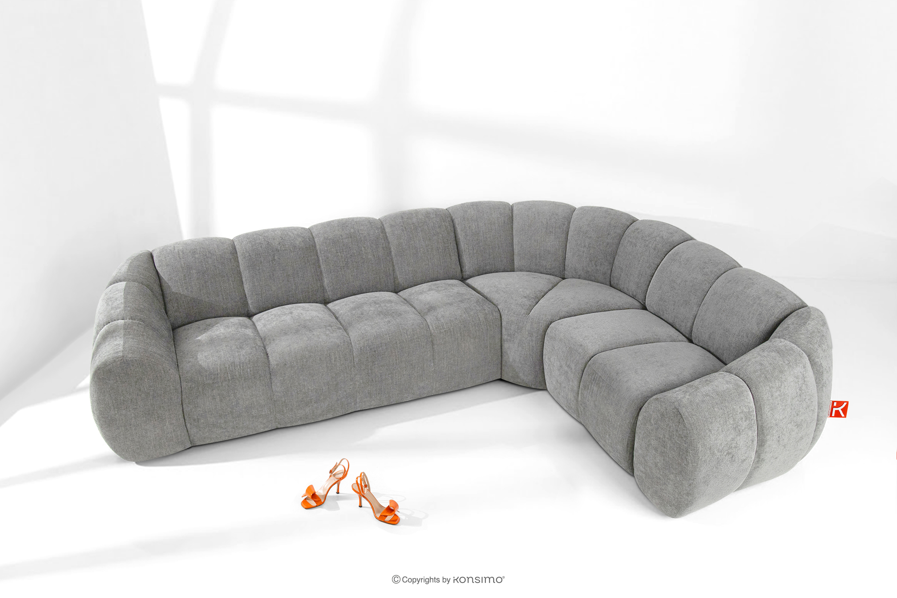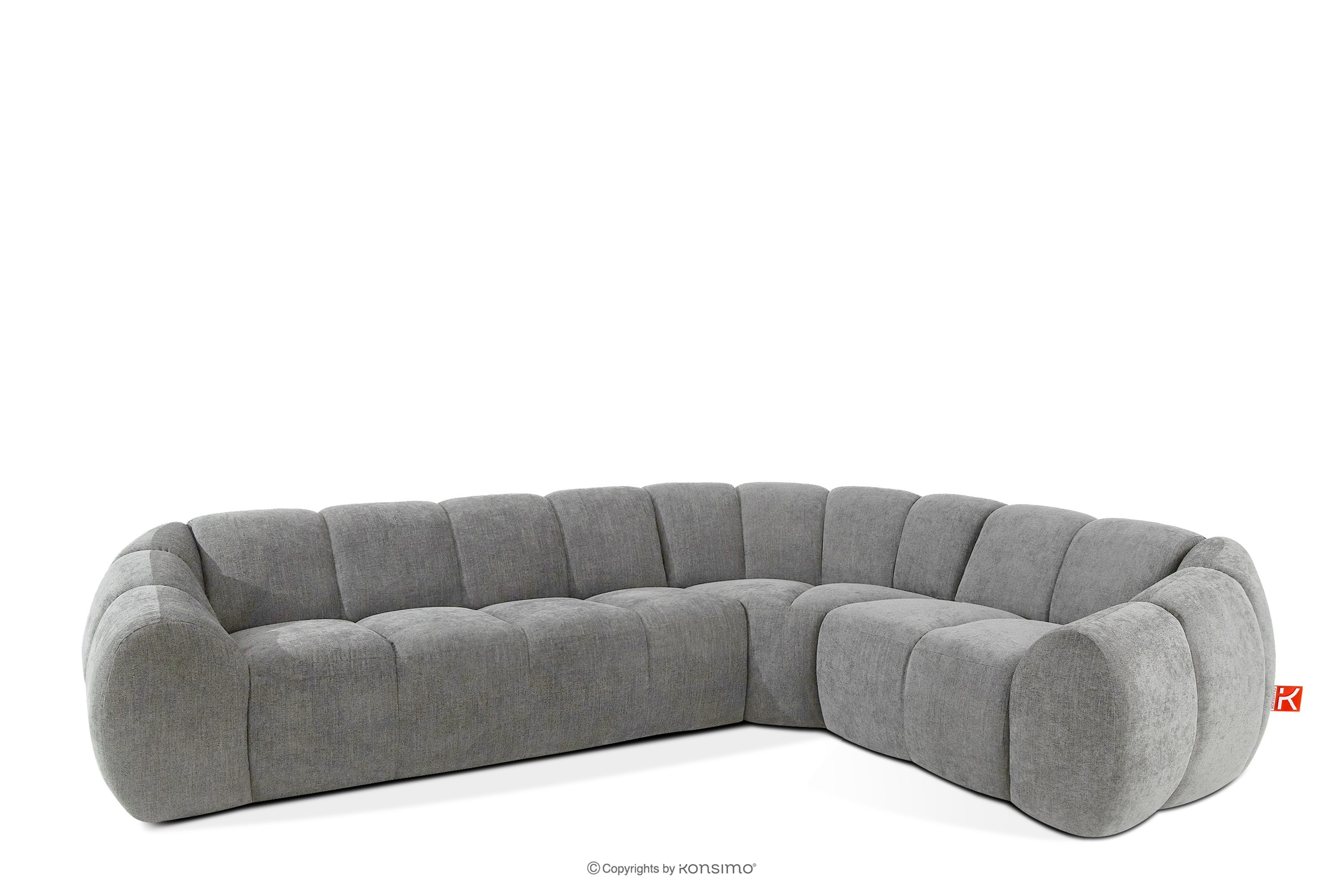 Pikowany narożnik w stylu retro modern prawy jasny popielaty stanowi kwintesencję nowoczesnego spojrzenia na stylistykę retro-modern, w której obłe, organiczne formy spotykają się z bezkompromisową funkcjonalnością współczesnego projektowania modułowego. Każdy element tej serii został zaprojektowany z myślą o stworzeniu harmonijnej przestrzeni, która celebruje miękkie linie i geometryczny rytm charakterystyczny dla ikon designu lat siedemdziesiątych, ale w odświeżonym, luksusowym wydaniu.