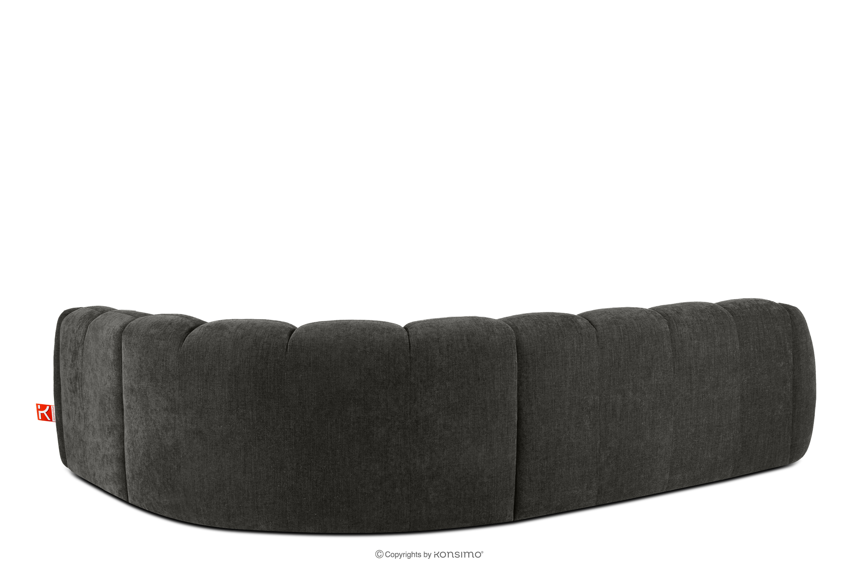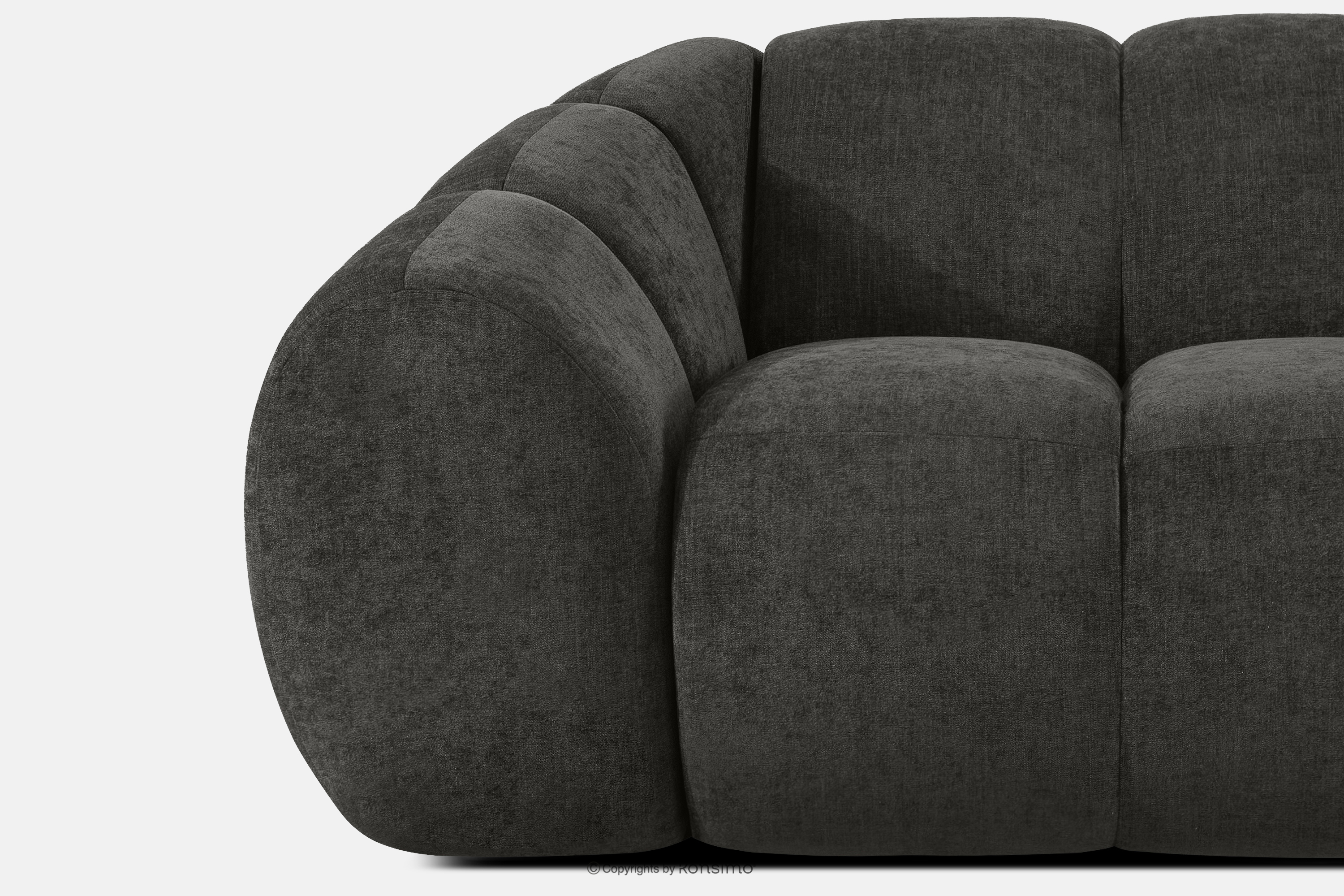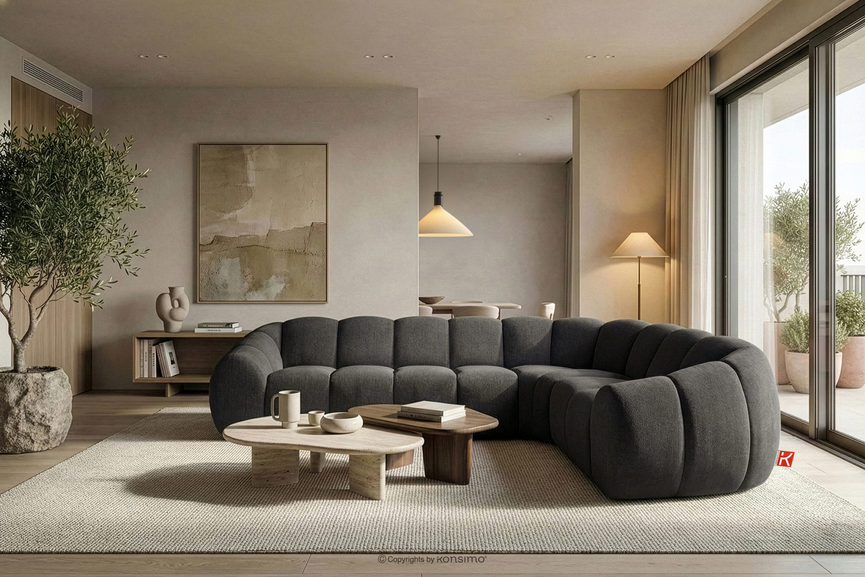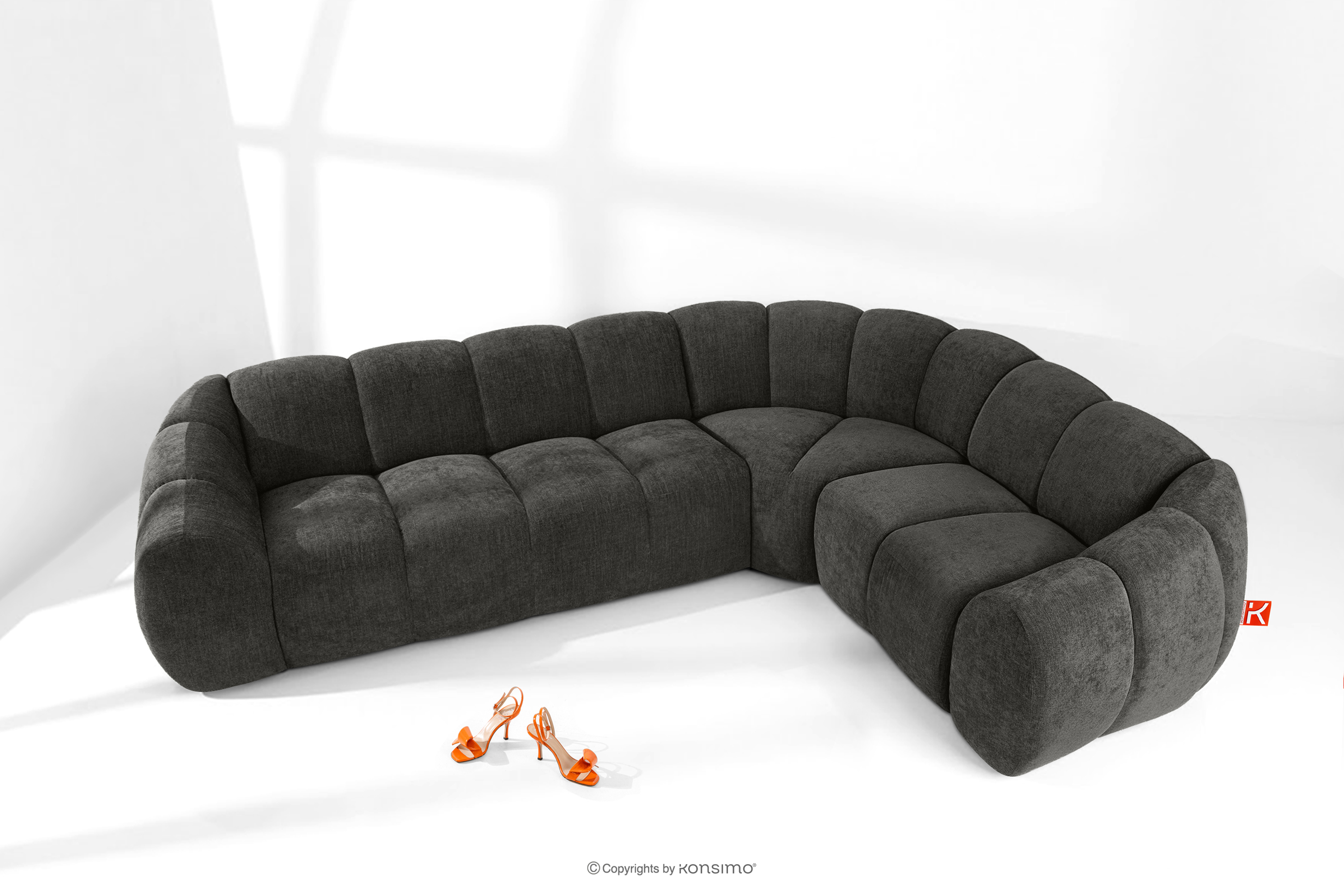 Pikowany narożnik w stylu retro modern prawy grafitowy stanowi kwintesencję nowoczesnego spojrzenia na stylistykę retro-modern, w której obłe, organiczne formy spotykają się z bezkompromisową funkcjonalnością współczesnego projektowania modułowego. Każdy element tej serii został zaprojektowany z myślą o stworzeniu harmonijnej przestrzeni, która celebruje miękkie linie i geometryczny rytm charakterystyczny dla ikon designu lat siedemdziesiątych, ale w odświeżonym, luksusowym wydaniu.