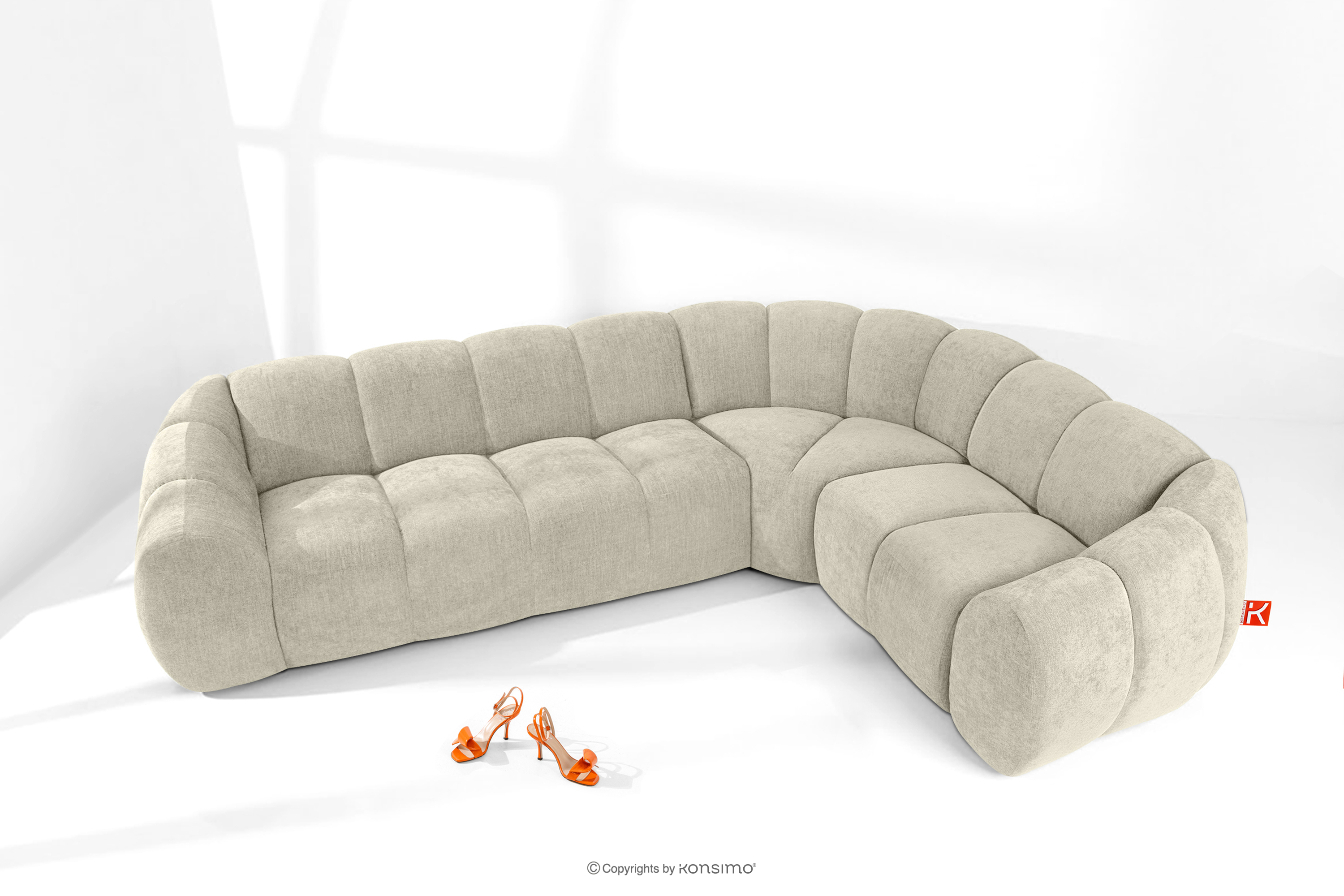 Pikowany narożnik w stylu retro modern prawy ecru stanowi kwintesencję nowoczesnego spojrzenia na stylistykę retro-modern, w której obłe, organiczne formy spotykają się z bezkompromisową funkcjonalnością współczesnego projektowania modułowego. Każdy element tej serii został zaprojektowany z myślą o stworzeniu harmonijnej przestrzeni, która celebruje miękkie linie i geometryczny rytm charakterystyczny dla ikon designu lat siedemdziesiątych, ale w odświeżonym, luksusowym wydaniu.