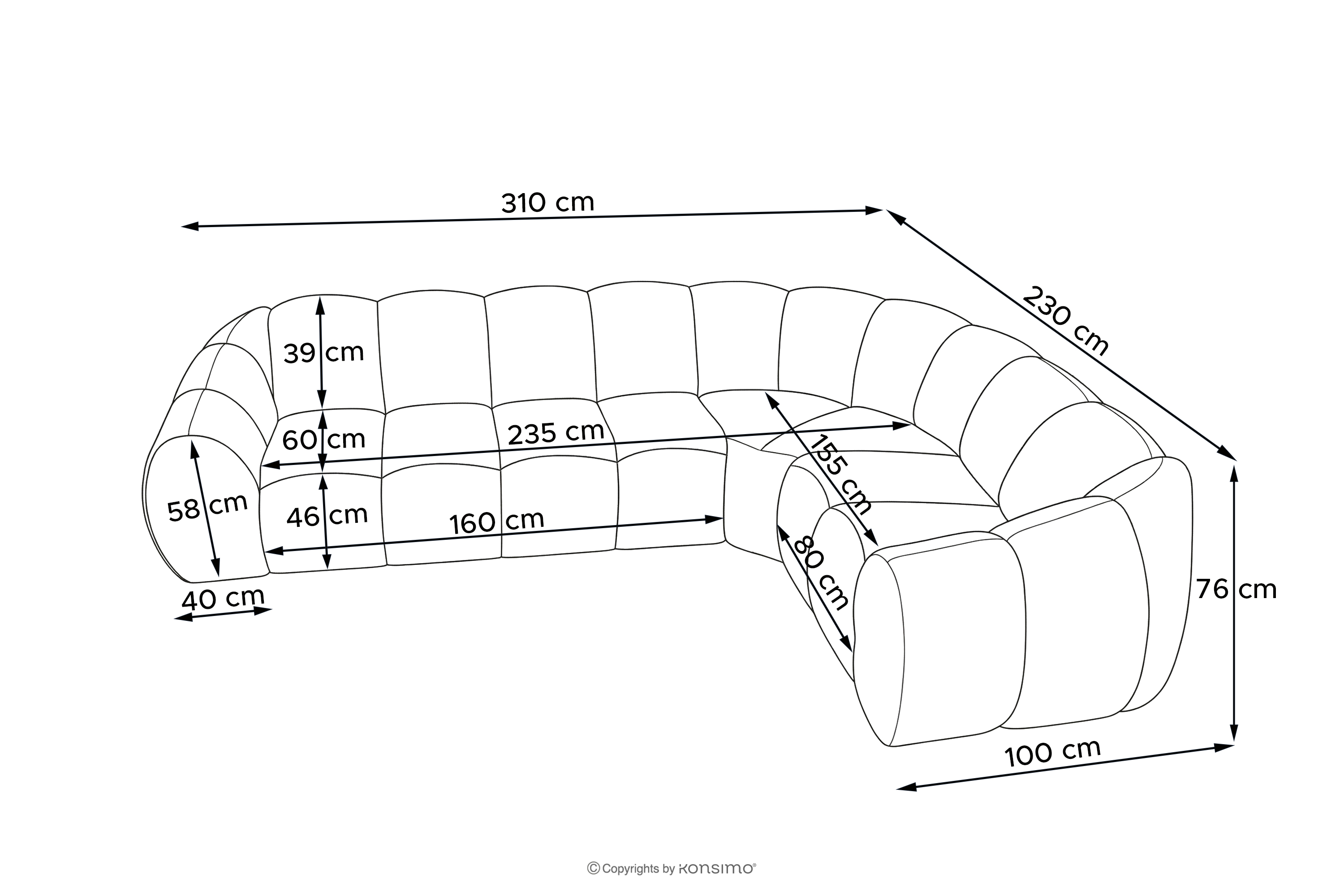 - Wymiary siedziska (cm): 235x46x60/155