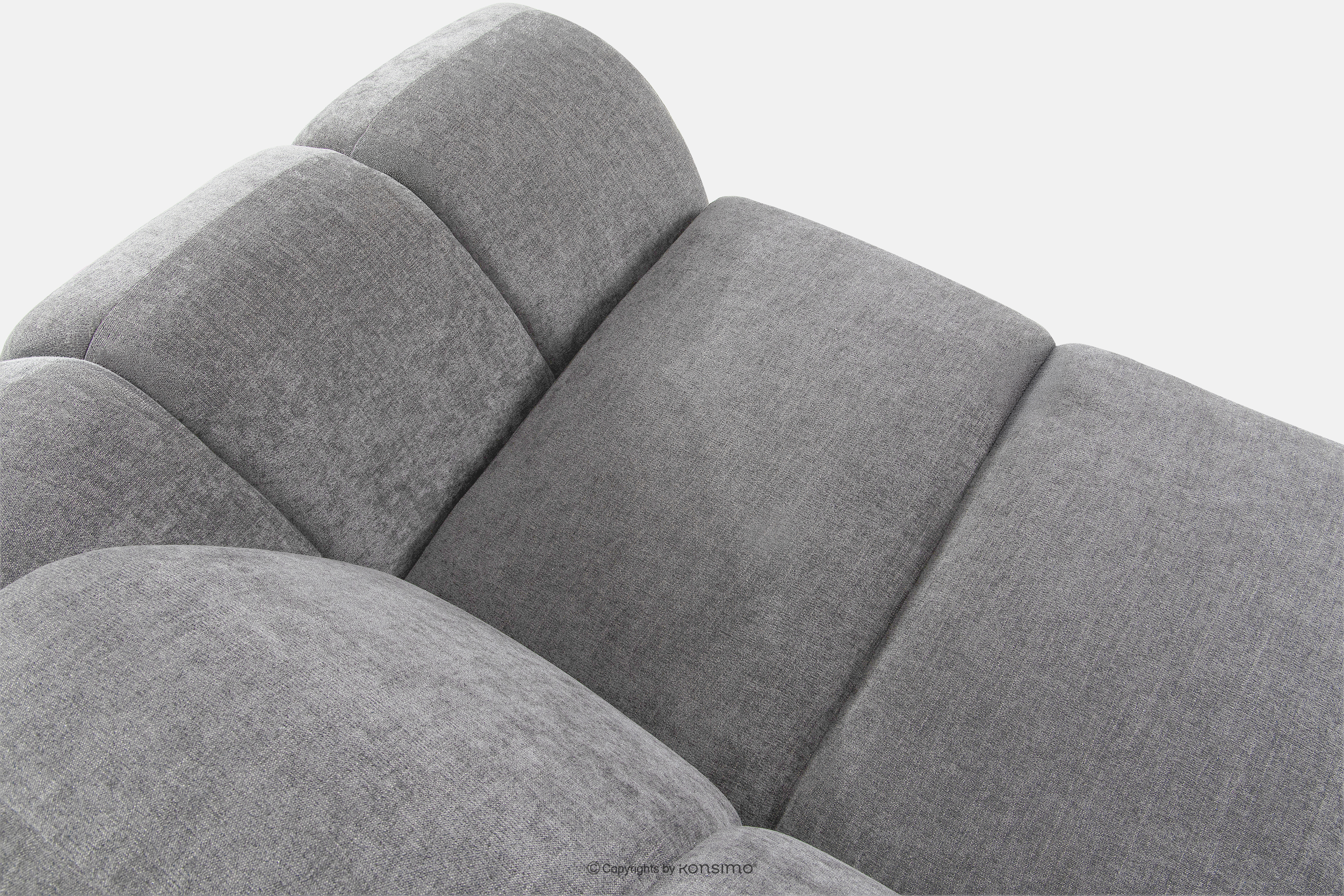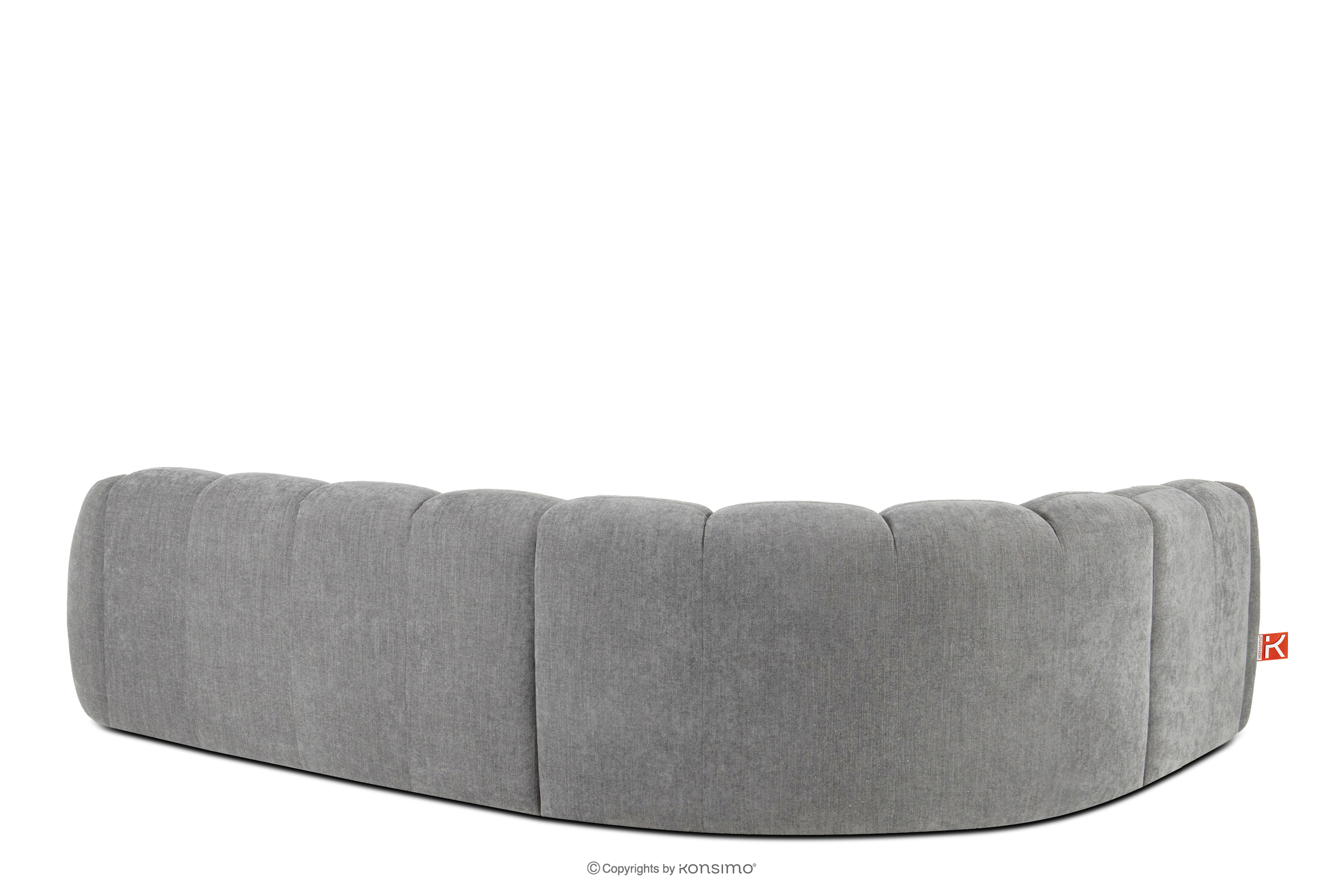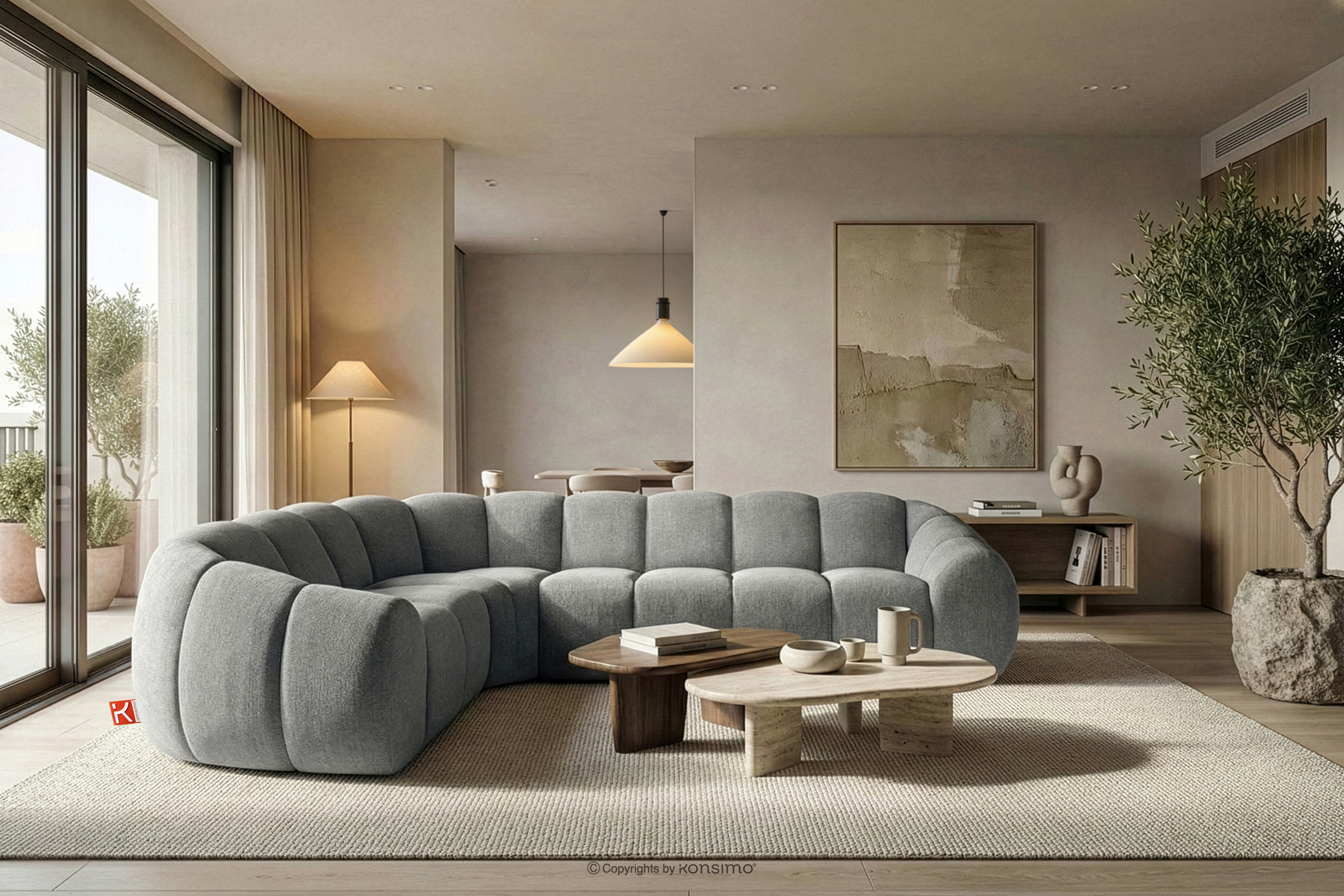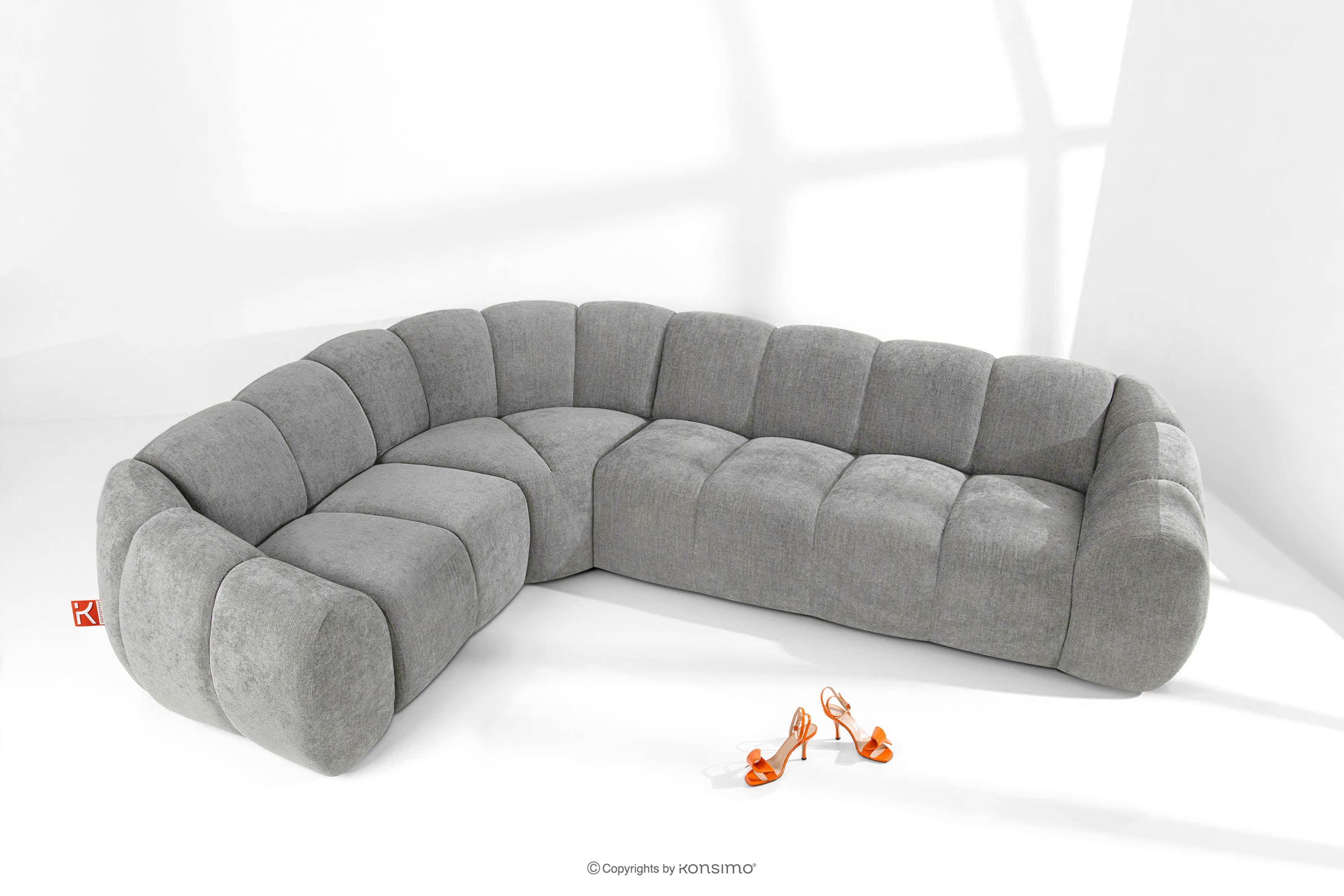 Pikowany narożnik w stylu retro modern lewy jasny popielaty stanowi kwintesencję nowoczesnego spojrzenia na stylistykę retro-modern, w której obłe, organiczne formy spotykają się z bezkompromisową funkcjonalnością współczesnego projektowania modułowego. Każdy element tej serii został zaprojektowany z myślą o stworzeniu harmonijnej przestrzeni, która celebruje miękkie linie i geometryczny rytm charakterystyczny dla ikon designu lat siedemdziesiątych, ale w odświeżonym, luksusowym wydaniu.