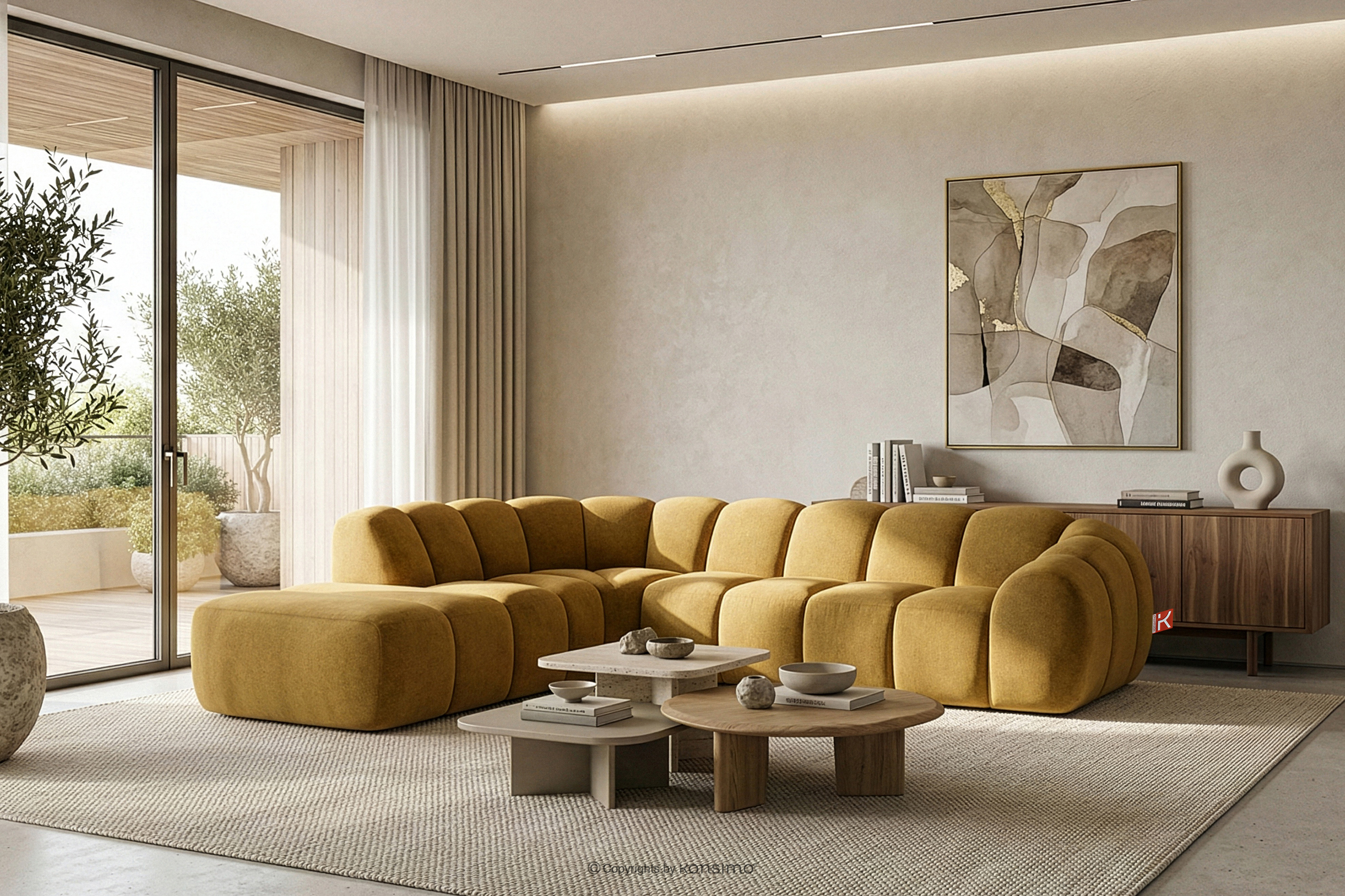 Narożnik curve w stylu retro modern modułowy lewy miodowy stanowi kwintesencję nowoczesnego spojrzenia na stylistykę retro-modern, w której obłe, organiczne formy spotykają się z bezkompromisową funkcjonalnością współczesnego projektowania modułowego. Każdy element tej serii został zaprojektowany z myślą o stworzeniu harmonijnej przestrzeni, która celebruje miękkie linie i geometryczny rytm charakterystyczny dla ikon designu lat siedemdziesiątych, ale w odświeżonym, luksusowym wydaniu.