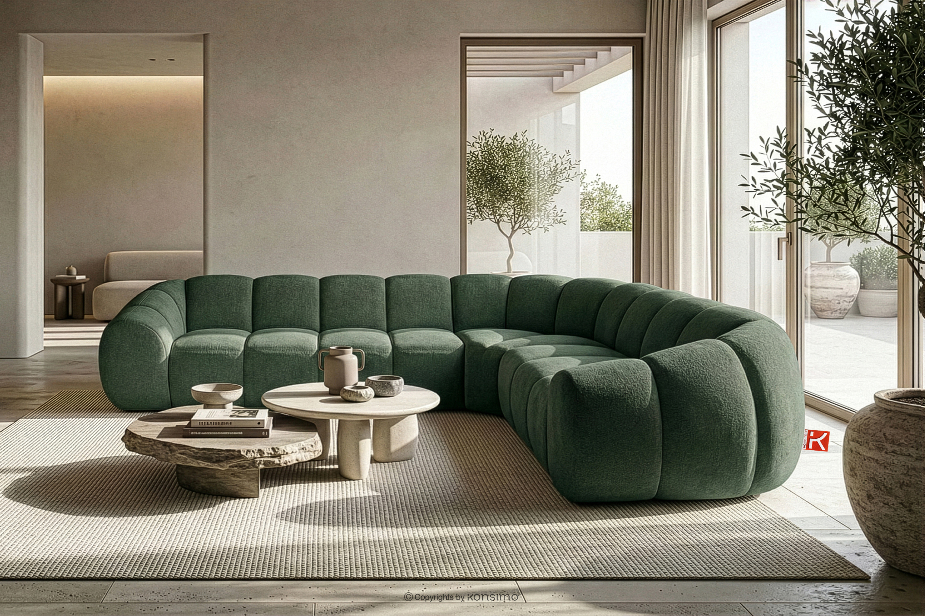 Duży pikowany narożnik w stylu retro modern prawy ciemny zielony stanowi kwintesencję nowoczesnego spojrzenia na stylistykę retro-modern, w której obłe, organiczne formy spotykają się z bezkompromisową funkcjonalnością współczesnego projektowania modułowego. Każdy element tej serii został zaprojektowany z myślą o stworzeniu harmonijnej przestrzeni, która celebruje miękkie linie i geometryczny rytm charakterystyczny dla ikon designu lat siedemdziesiątych, ale w odświeżonym, luksusowym wydaniu.