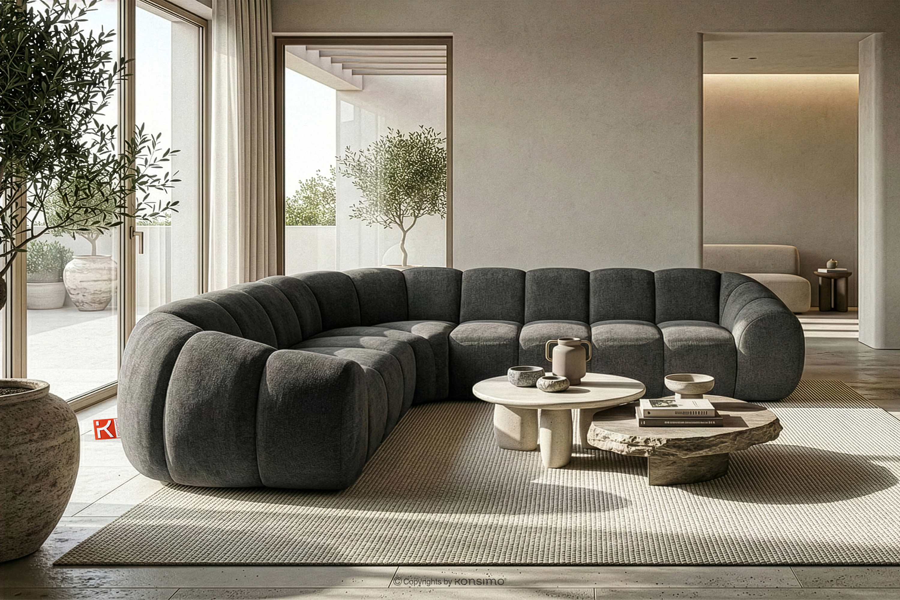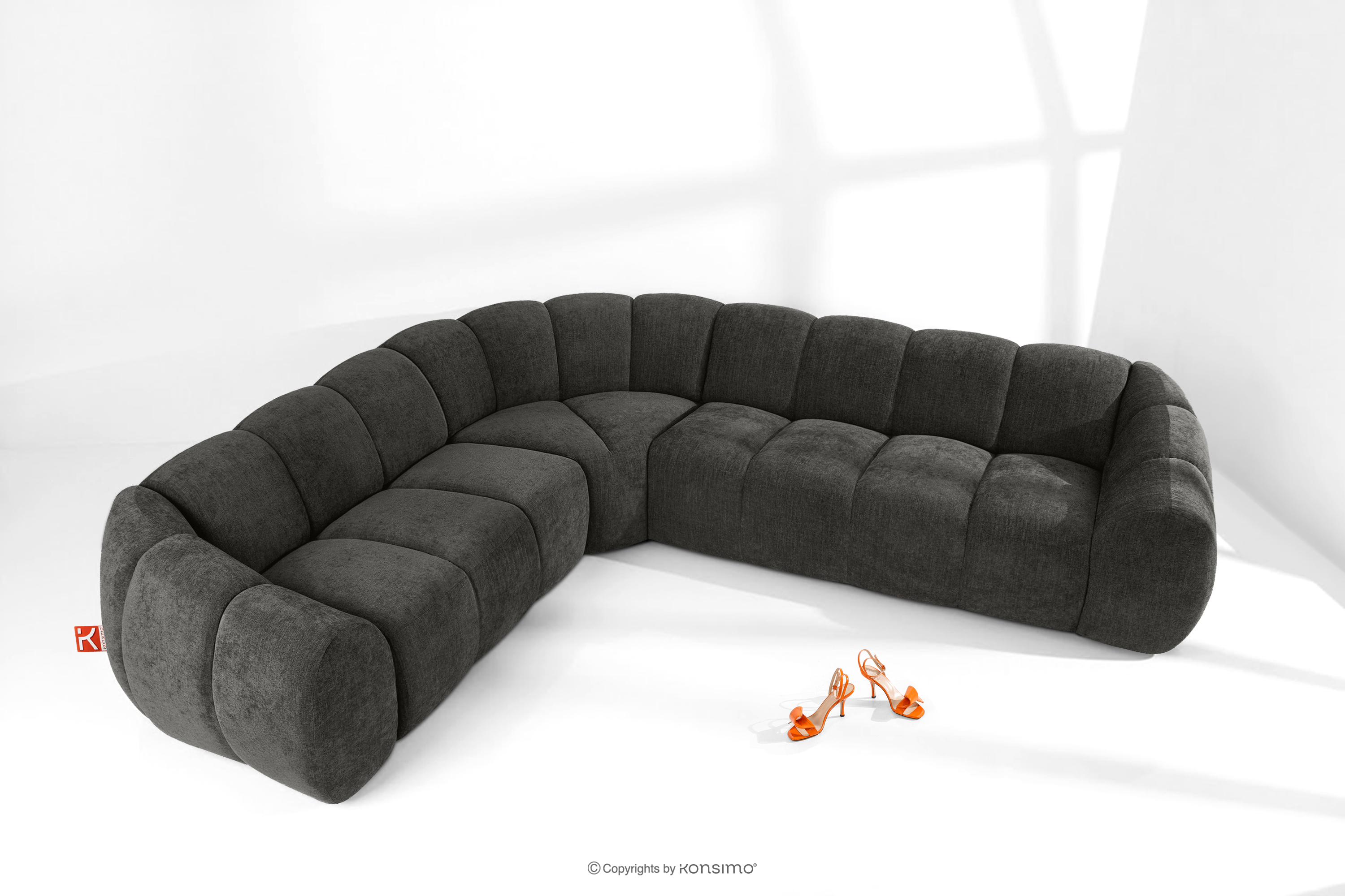 Duży pikowany narożnik w stylu retro modern lewy grafitowy stanowi kwintesencję nowoczesnego spojrzenia na stylistykę retro-modern, w której obłe, organiczne formy spotykają się z bezkompromisową funkcjonalnością współczesnego projektowania modułowego. Każdy element tej serii został zaprojektowany z myślą o stworzeniu harmonijnej przestrzeni, która celebruje miękkie linie i geometryczny rytm charakterystyczny dla ikon designu lat siedemdziesiątych, ale w odświeżonym, luksusowym wydaniu.