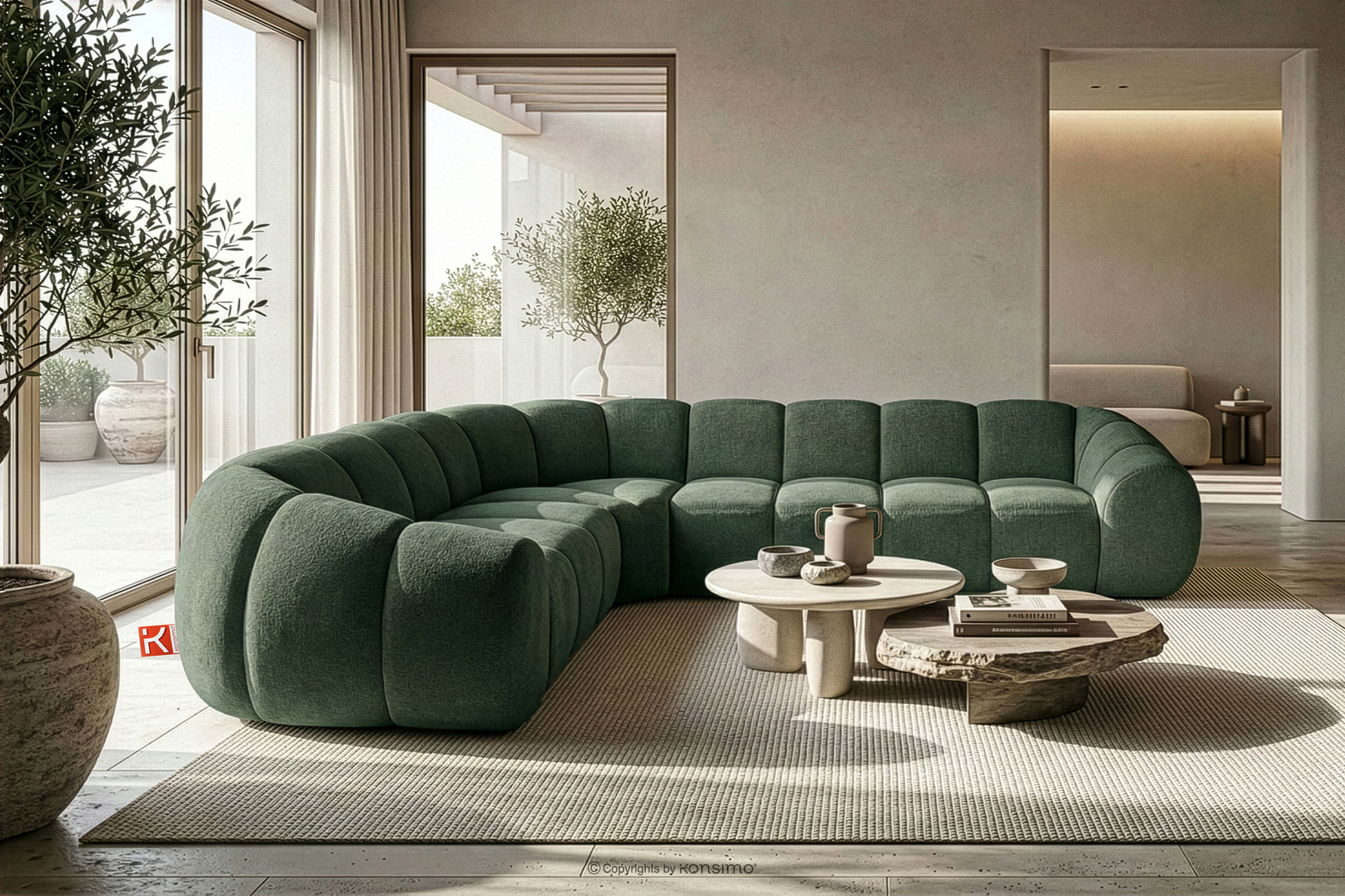 Duży pikowany narożnik w stylu retro modern lewy ciemny zielony stanowi kwintesencję nowoczesnego spojrzenia na stylistykę retro-modern, w której obłe, organiczne formy spotykają się z bezkompromisową funkcjonalnością współczesnego projektowania modułowego. Każdy element tej serii został zaprojektowany z myślą o stworzeniu harmonijnej przestrzeni, która celebruje miękkie linie i geometryczny rytm charakterystyczny dla ikon designu lat siedemdziesiątych, ale w odświeżonym, luksusowym wydaniu.