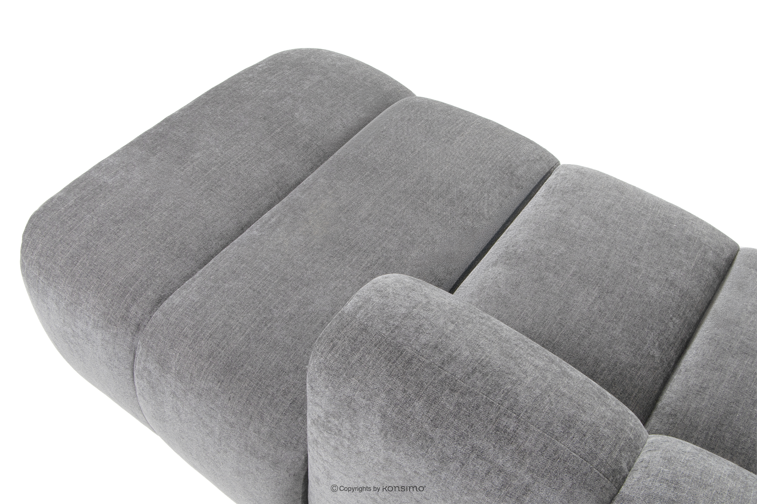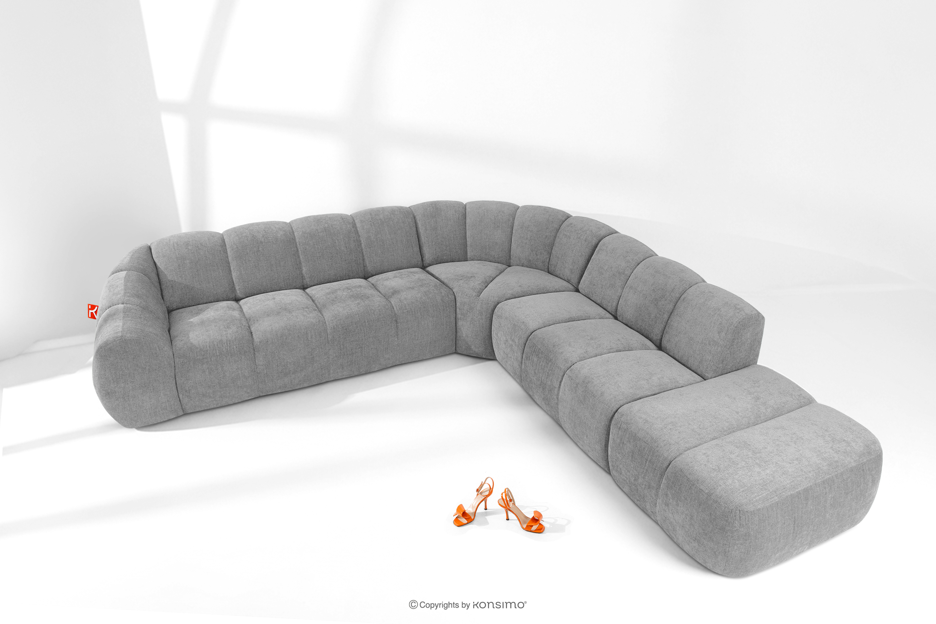 Duży pikowany narożnik modułowy w stylu retro modern prawy jasny popielaty stanowi kwintesencję nowoczesnego spojrzenia na stylistykę retro-modern, w której obłe, organiczne formy spotykają się z bezkompromisową funkcjonalnością współczesnego projektowania modułowego. Każdy element tej serii został zaprojektowany z myślą o stworzeniu harmonijnej przestrzeni, która celebruje miękkie linie i geometryczny rytm charakterystyczny dla ikon designu lat siedemdziesiątych, ale w odświeżonym, luksusowym wydaniu.