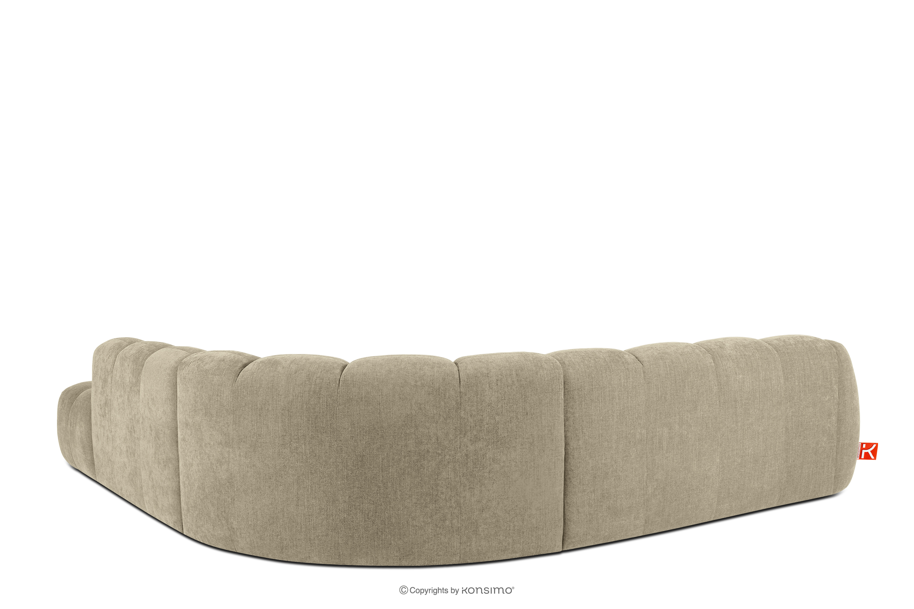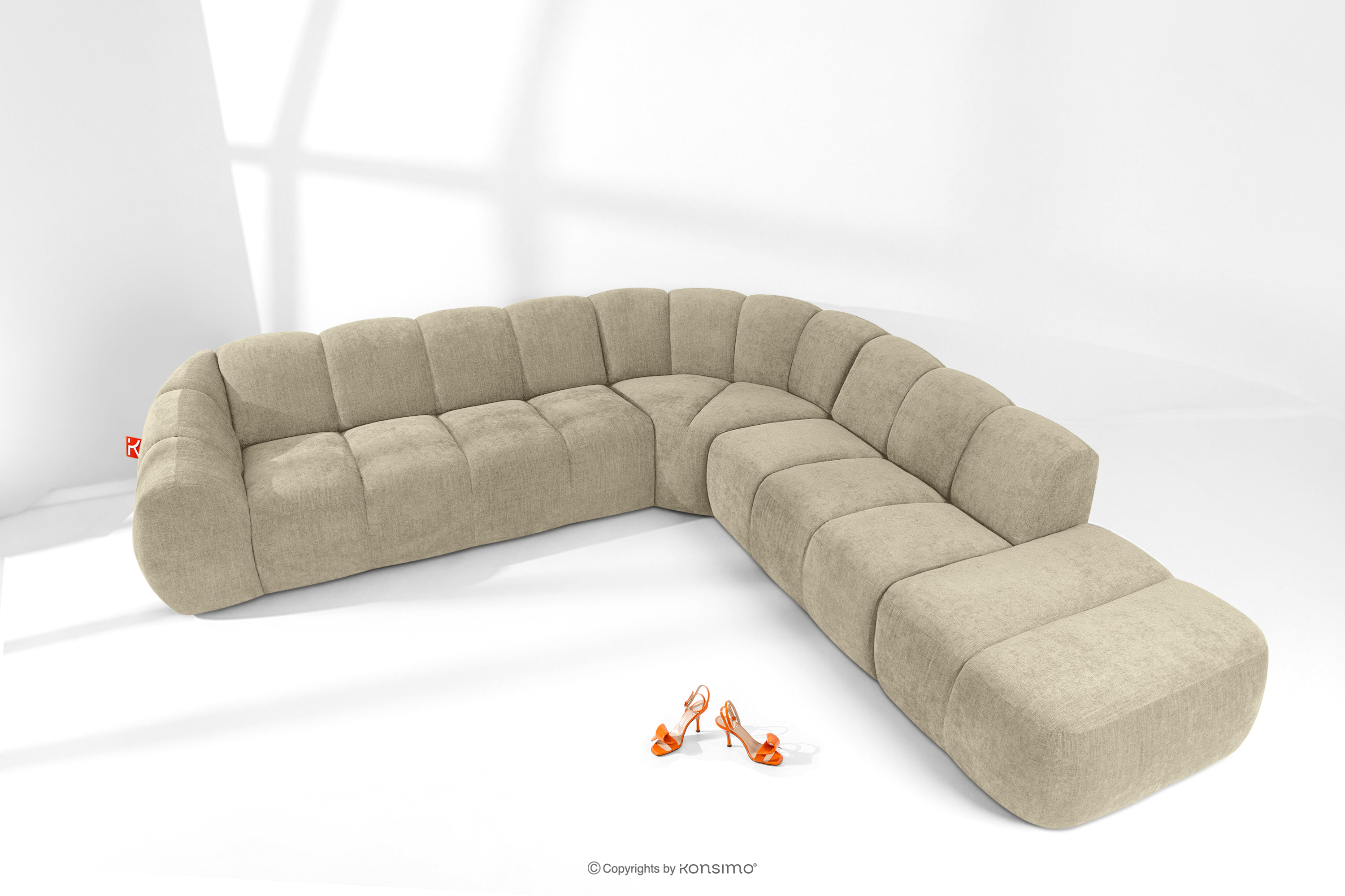 Duży pikowany narożnik modułowy w stylu retro modern prawy piaskowy stanowi kwintesencję nowoczesnego spojrzenia na stylistykę retro-modern, w której obłe, organiczne formy spotykają się z bezkompromisową funkcjonalnością współczesnego projektowania modułowego. Każdy element tej serii został zaprojektowany z myślą o stworzeniu harmonijnej przestrzeni, która celebruje miękkie linie i geometryczny rytm charakterystyczny dla ikon designu lat siedemdziesiątych, ale w odświeżonym, luksusowym wydaniu.