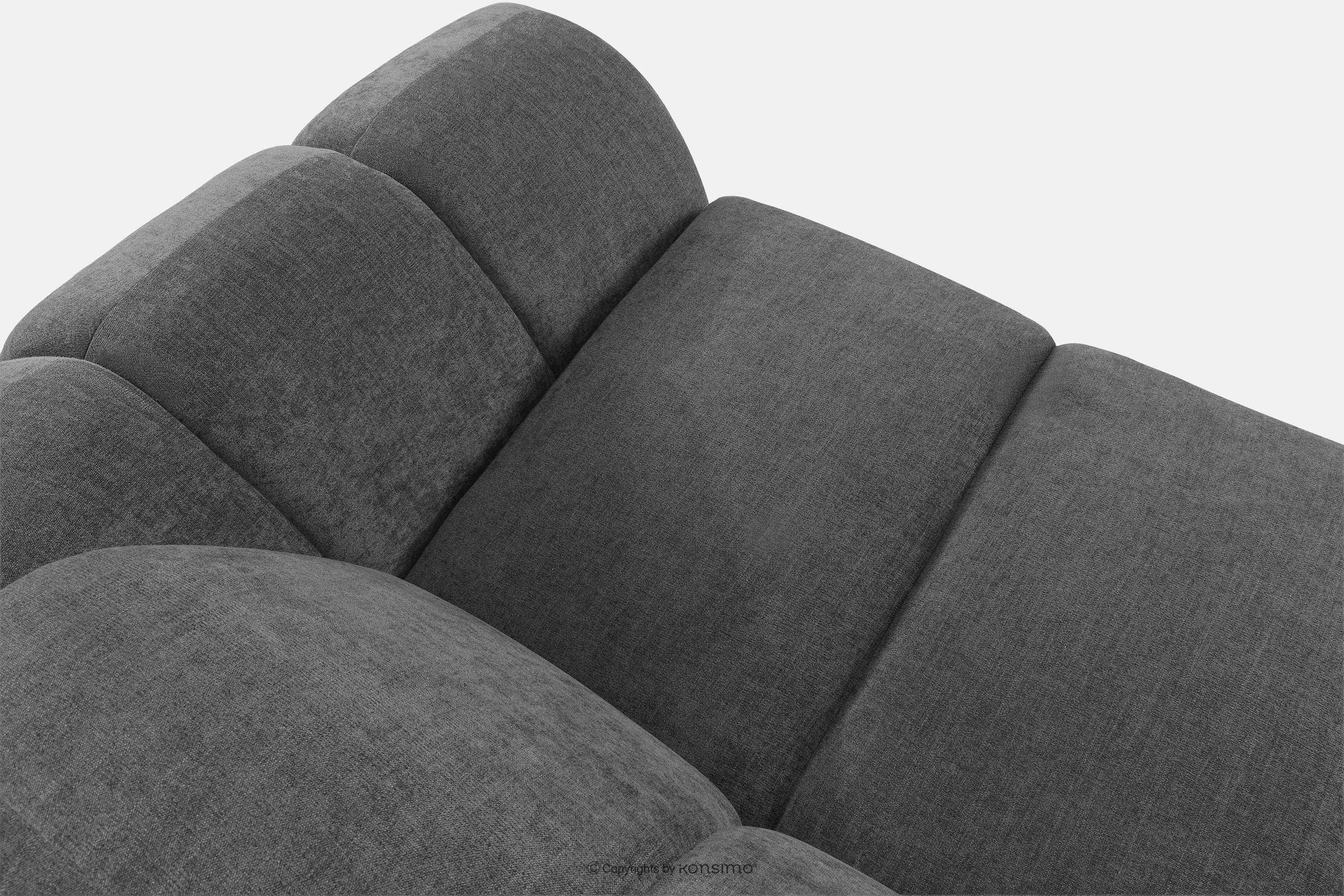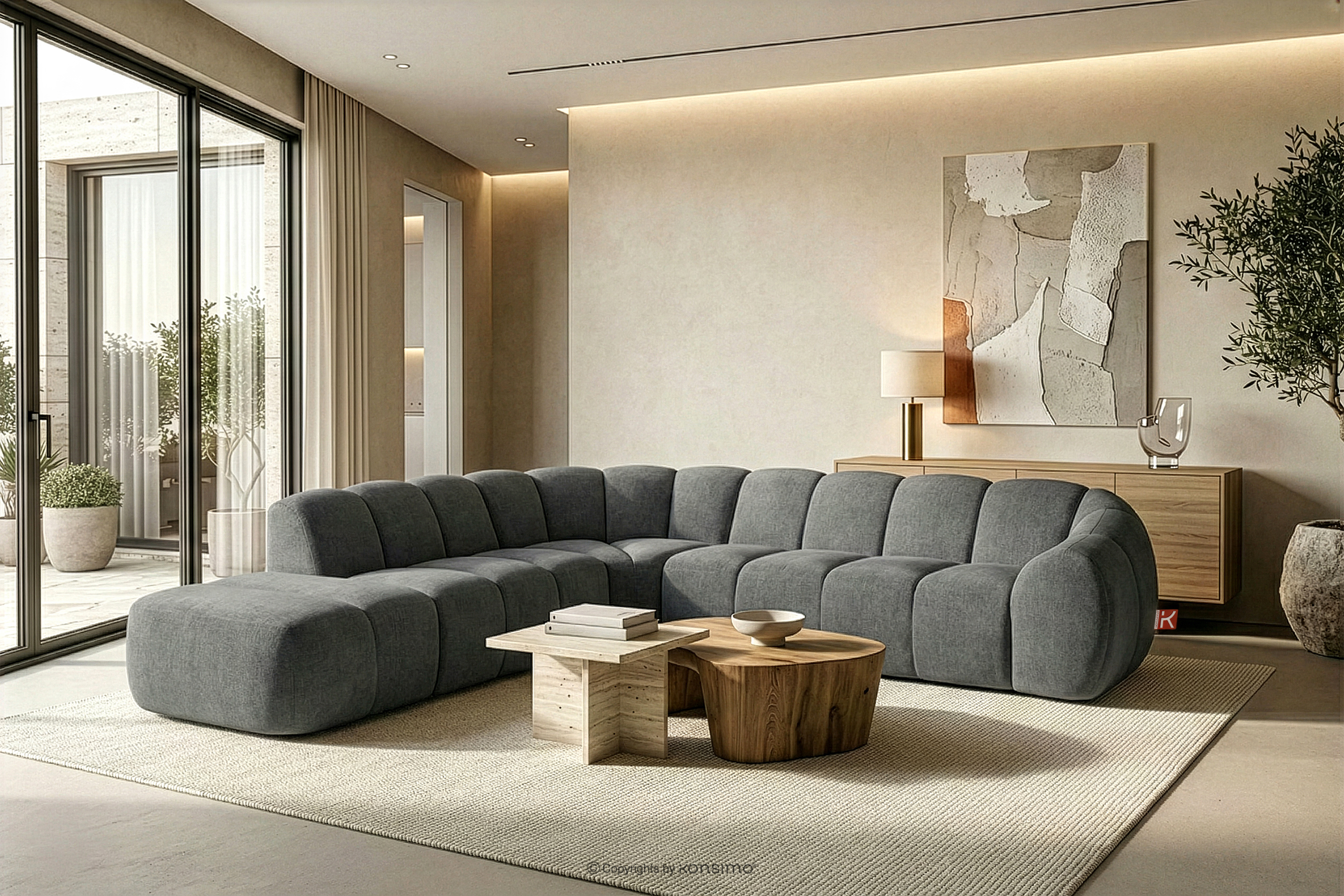 Duży pikowany narożnik modułowy w stylu retro modern lewy popielaty stanowi kwintesencję nowoczesnego spojrzenia na stylistykę retro-modern, w której obłe, organiczne formy spotykają się z bezkompromisową funkcjonalnością współczesnego projektowania modułowego. Każdy element tej serii został zaprojektowany z myślą o stworzeniu harmonijnej przestrzeni, która celebruje miękkie linie i geometryczny rytm charakterystyczny dla ikon designu lat siedemdziesiątych, ale w odświeżonym, luksusowym wydaniu.