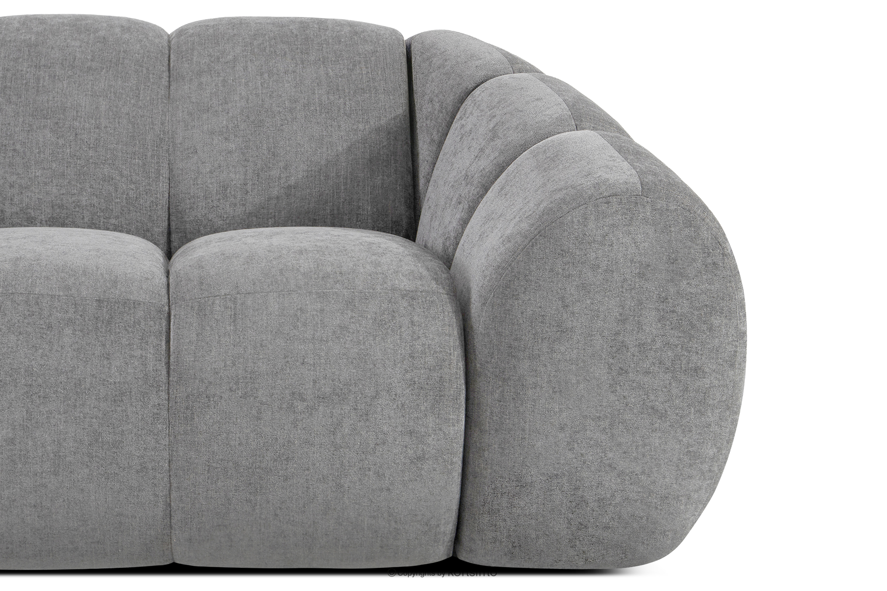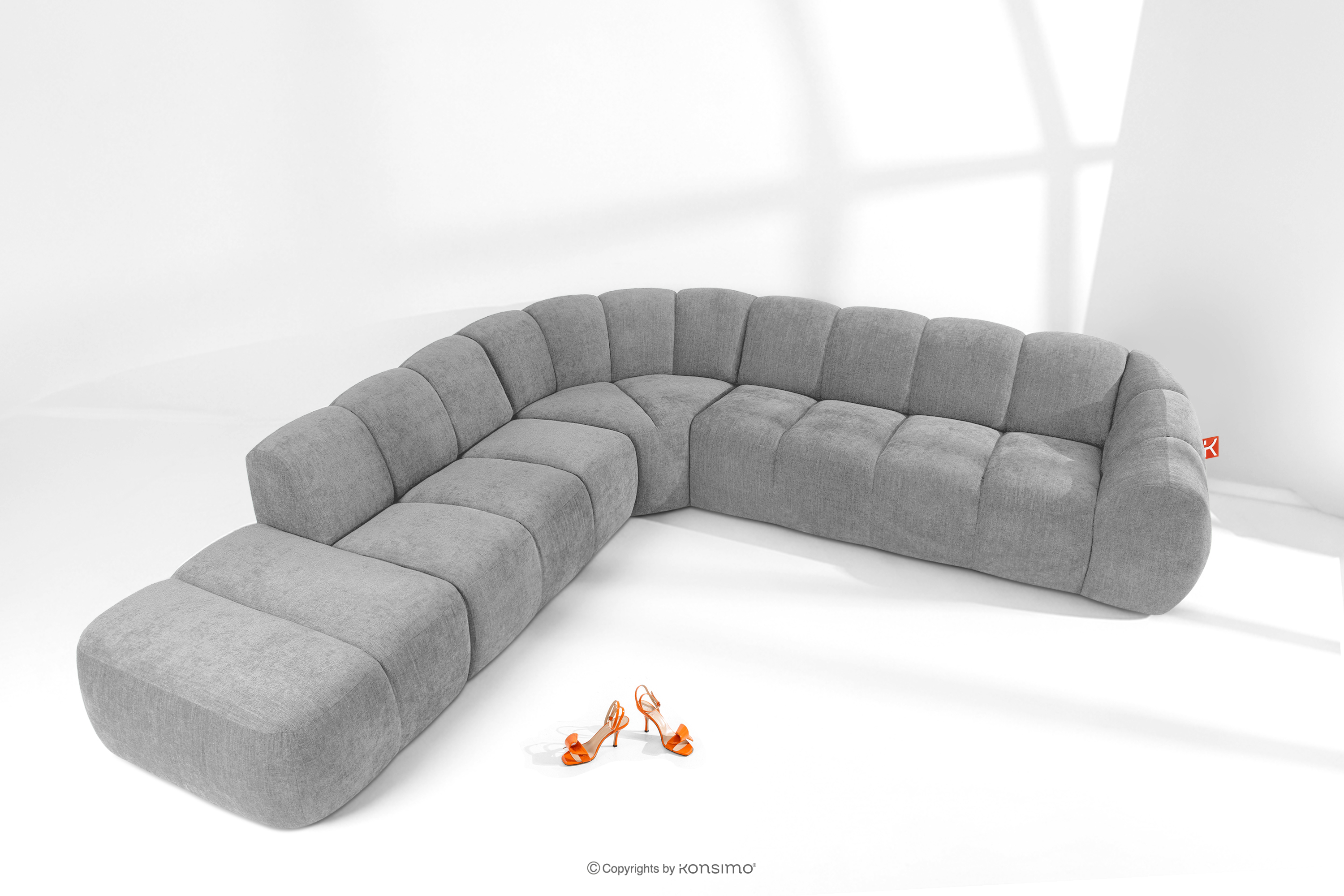 Duży pikowany narożnik modułowy w stylu retro modern lewy jasny popielaty stanowi kwintesencję nowoczesnego spojrzenia na stylistykę retro-modern, w której obłe, organiczne formy spotykają się z bezkompromisową funkcjonalnością współczesnego projektowania modułowego. Każdy element tej serii został zaprojektowany z myślą o stworzeniu harmonijnej przestrzeni, która celebruje miękkie linie i geometryczny rytm charakterystyczny dla ikon designu lat siedemdziesiątych, ale w odświeżonym, luksusowym wydaniu.