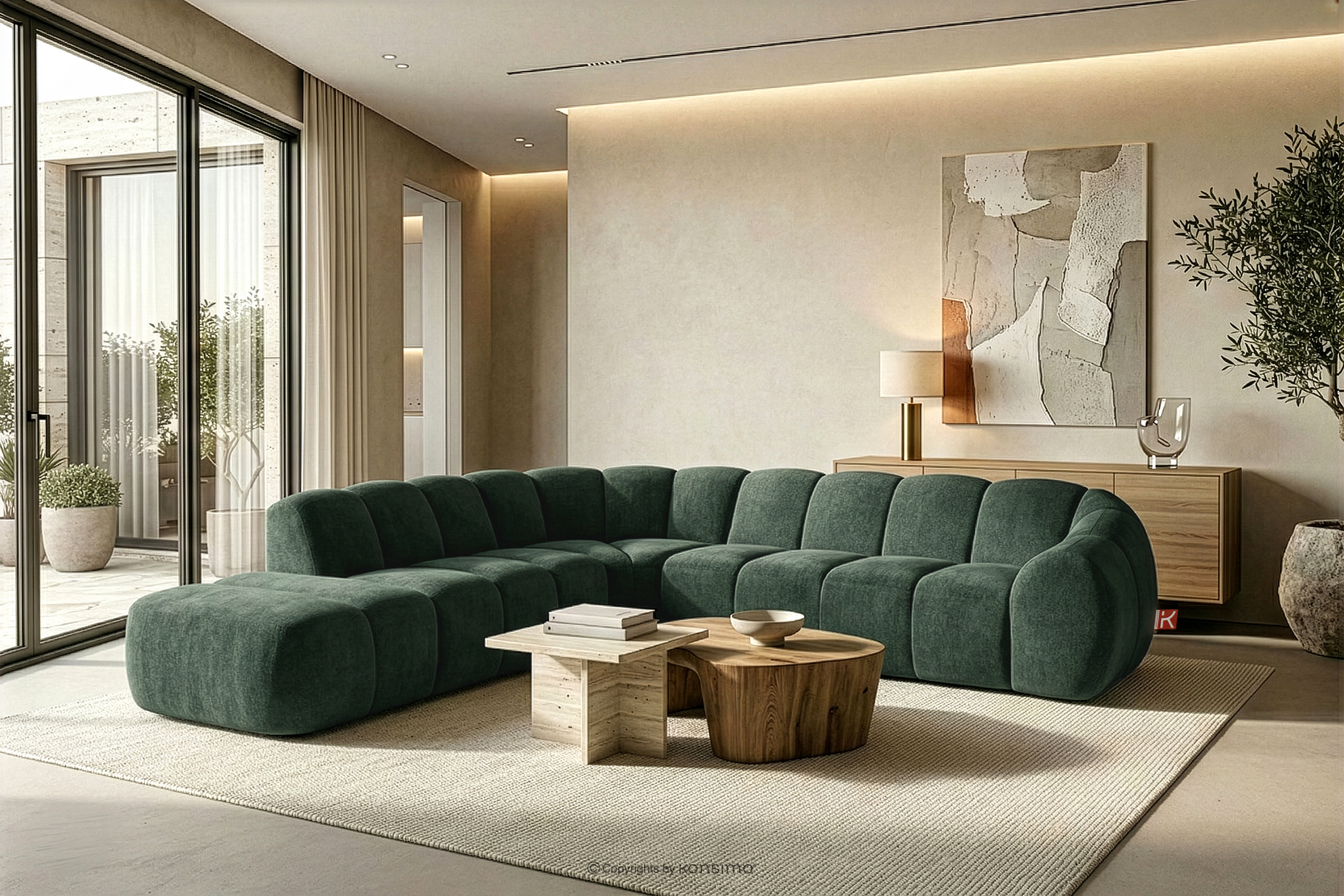 Duży pikowany narożnik modułowy w stylu retro modern lewy ciemny zielony stanowi kwintesencję nowoczesnego spojrzenia na stylistykę retro-modern, w której obłe, organiczne formy spotykają się z bezkompromisową funkcjonalnością współczesnego projektowania modułowego. Każdy element tej serii został zaprojektowany z myślą o stworzeniu harmonijnej przestrzeni, która celebruje miękkie linie i geometryczny rytm charakterystyczny dla ikon designu lat siedemdziesiątych, ale w odświeżonym, luksusowym wydaniu.